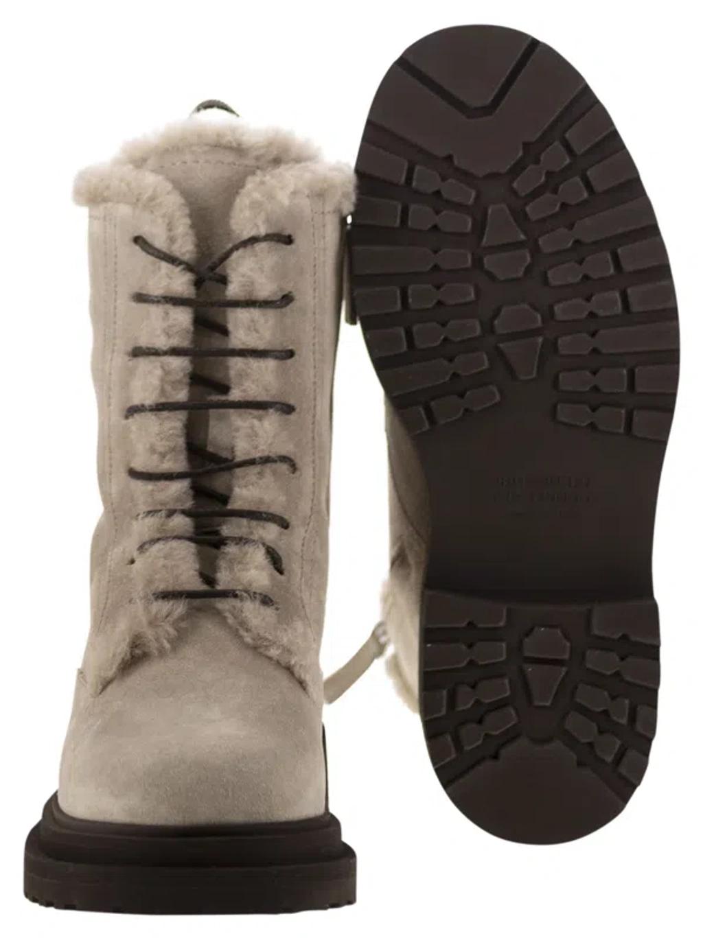 Shop Brunello Cucinelli Chunky Sole Suede Combat Boots Monile In Neutral from 800+ stores, starting at €877. Premium suede boots by BRUNELLO CUCINELLI. Amphibious-style closure with round waxed fabric laces and a side zip on the inside; double loop on the back, highlighted by a sparkling monili embroidery; lightweight micro sole; 4 cm heel. Featuring a soft shearling lining and nickel-free monili decoration.