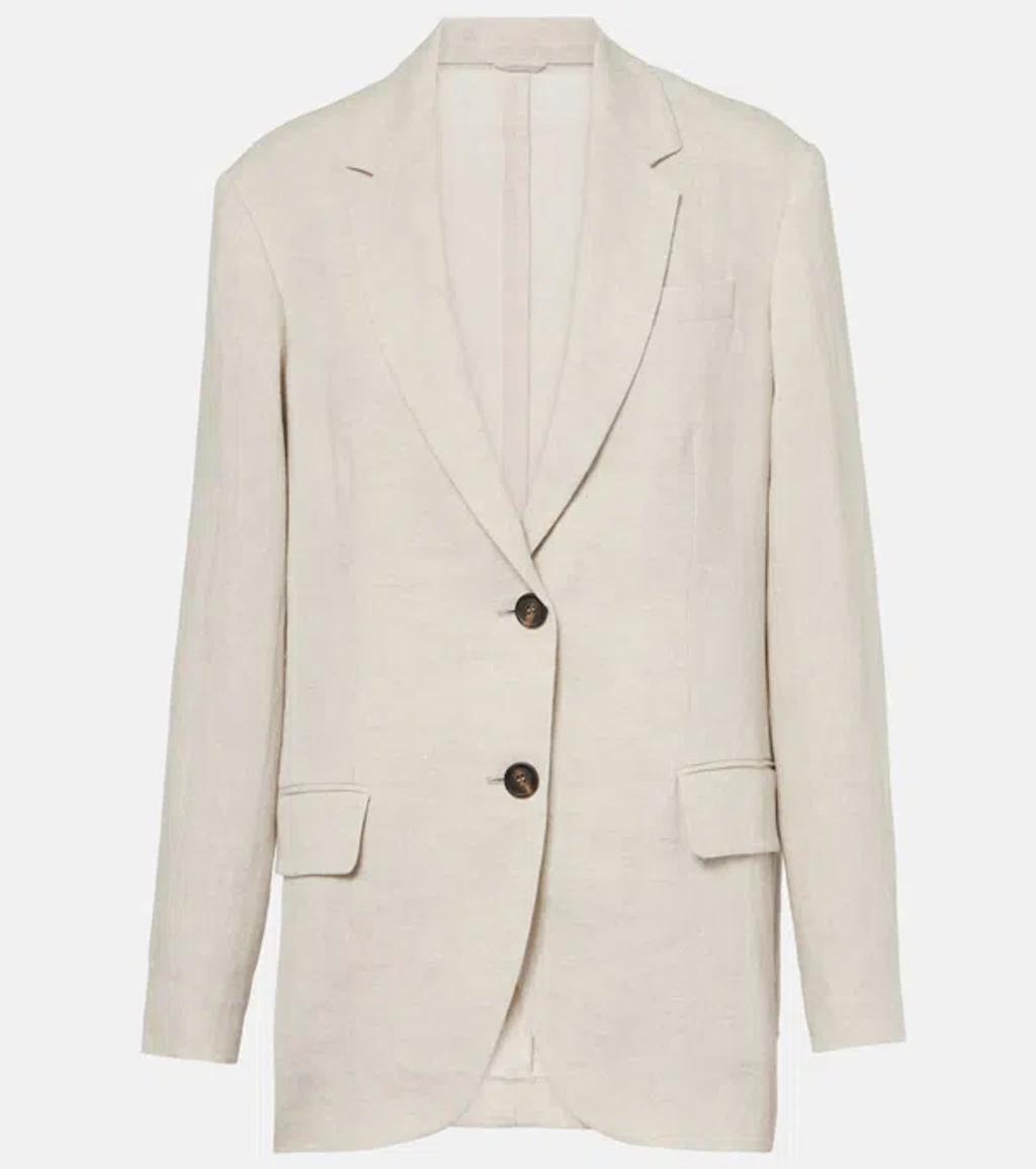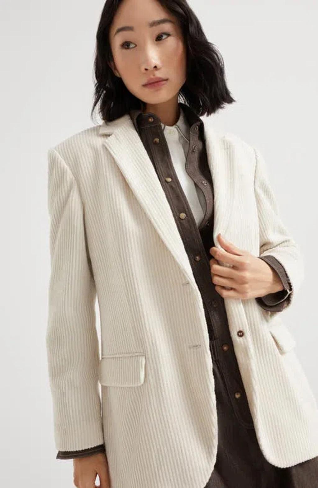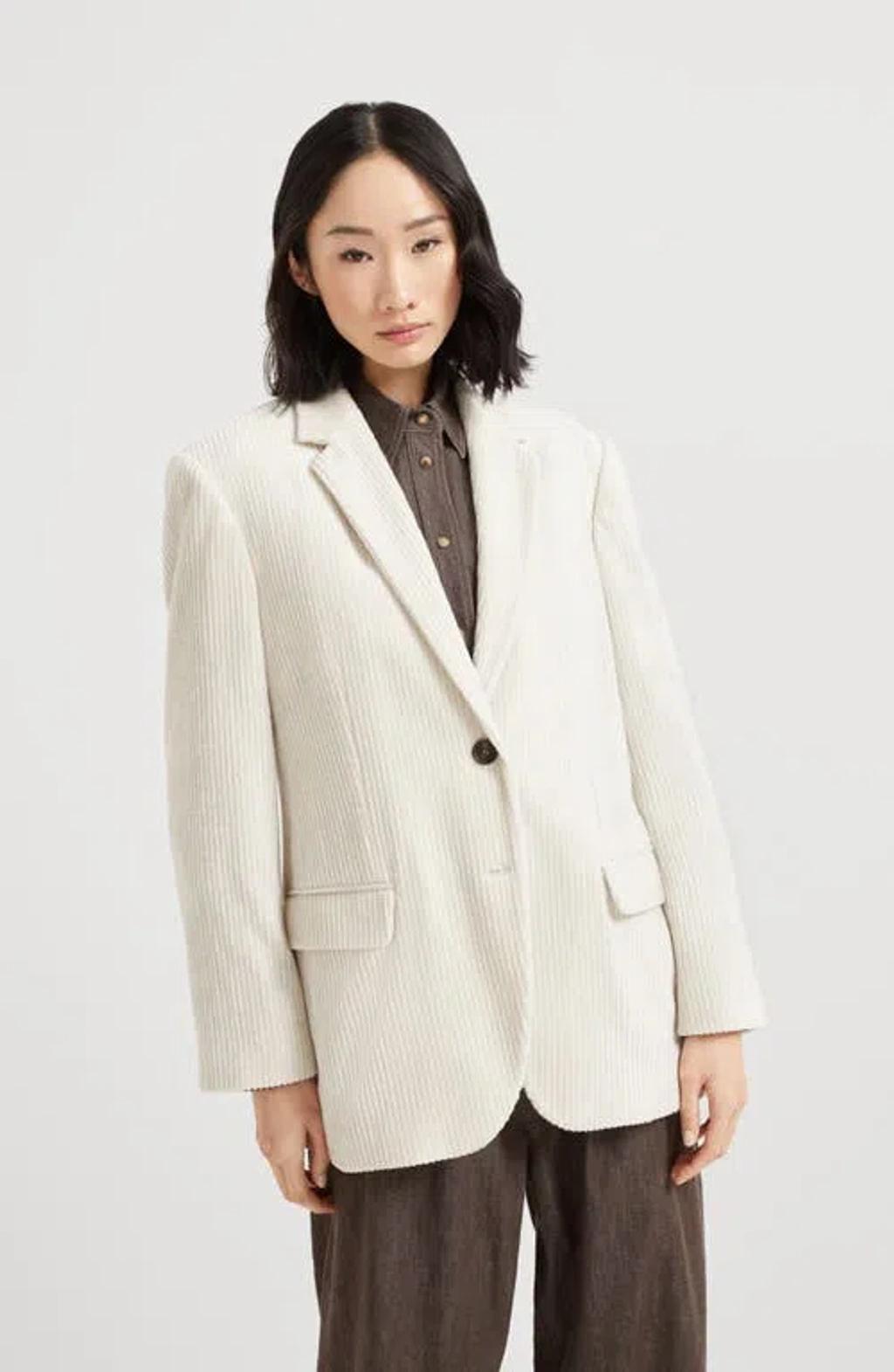 Shop Brunello Cucinelli Single Breast Linen Jacket In Light Beige from 800+ stores, starting at €1957. At the hands of Brunello Cucinelli, the classic blazer gets a subtle upgrade. Traditional tailored hallmarks such as peak lapels and buttoned cuffs remain, but the soft corduroy and a touch of shiny monili embroidery (discreetly placed behind the neck) introduce understated nuances to an otherwise familiar design.