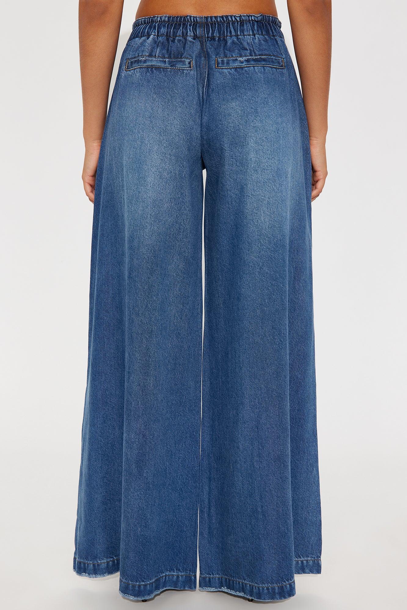 Available In Dark Wash. Pair With Brunswick Denim Bomber Jacket Wide Leg Jean Faux Back Pockets Elasticized Waistband Tie Waist 9.5" Rise 32.5" Inseam Non Stretch Disclaimer: Due To The Specialized Wash, Each Garment Is Unique. Self: 100% Lyocell Imported California Proposition 65WARNING: Cancer and Reproductive Harm - www.P65Warnings.ca.gov.