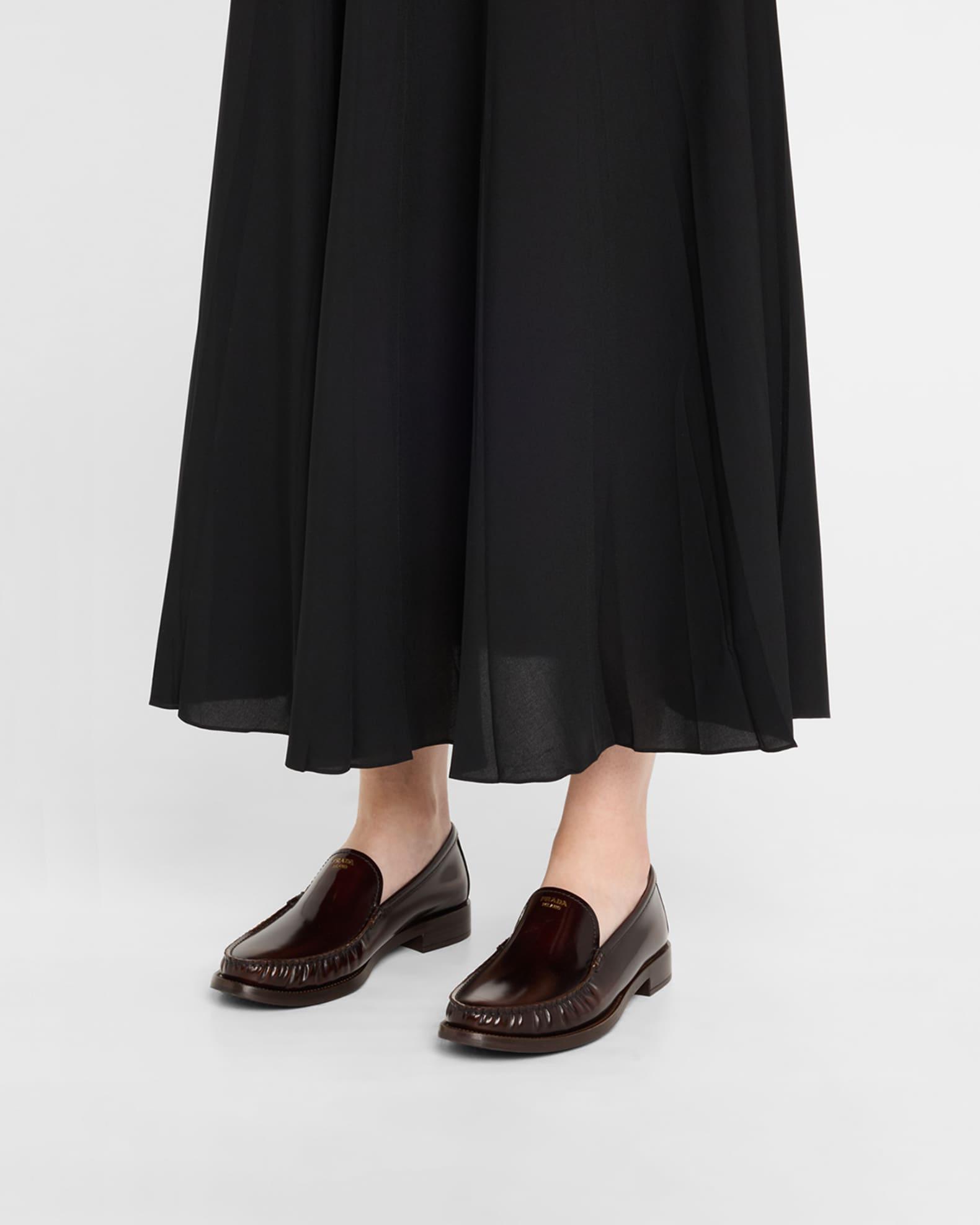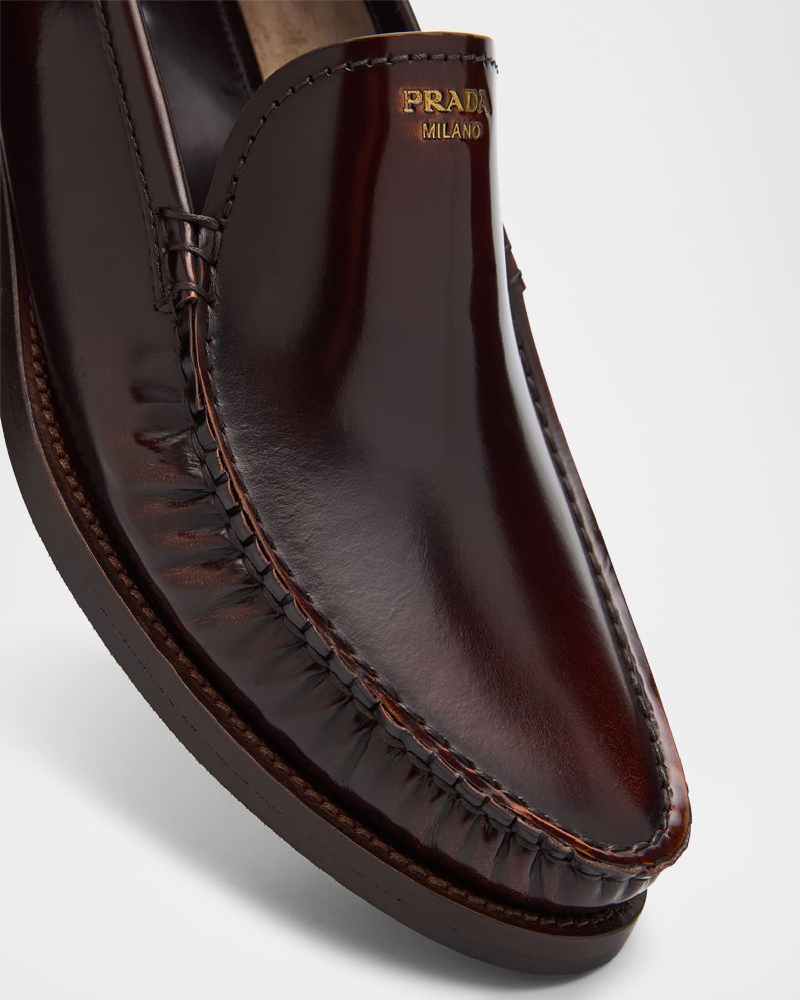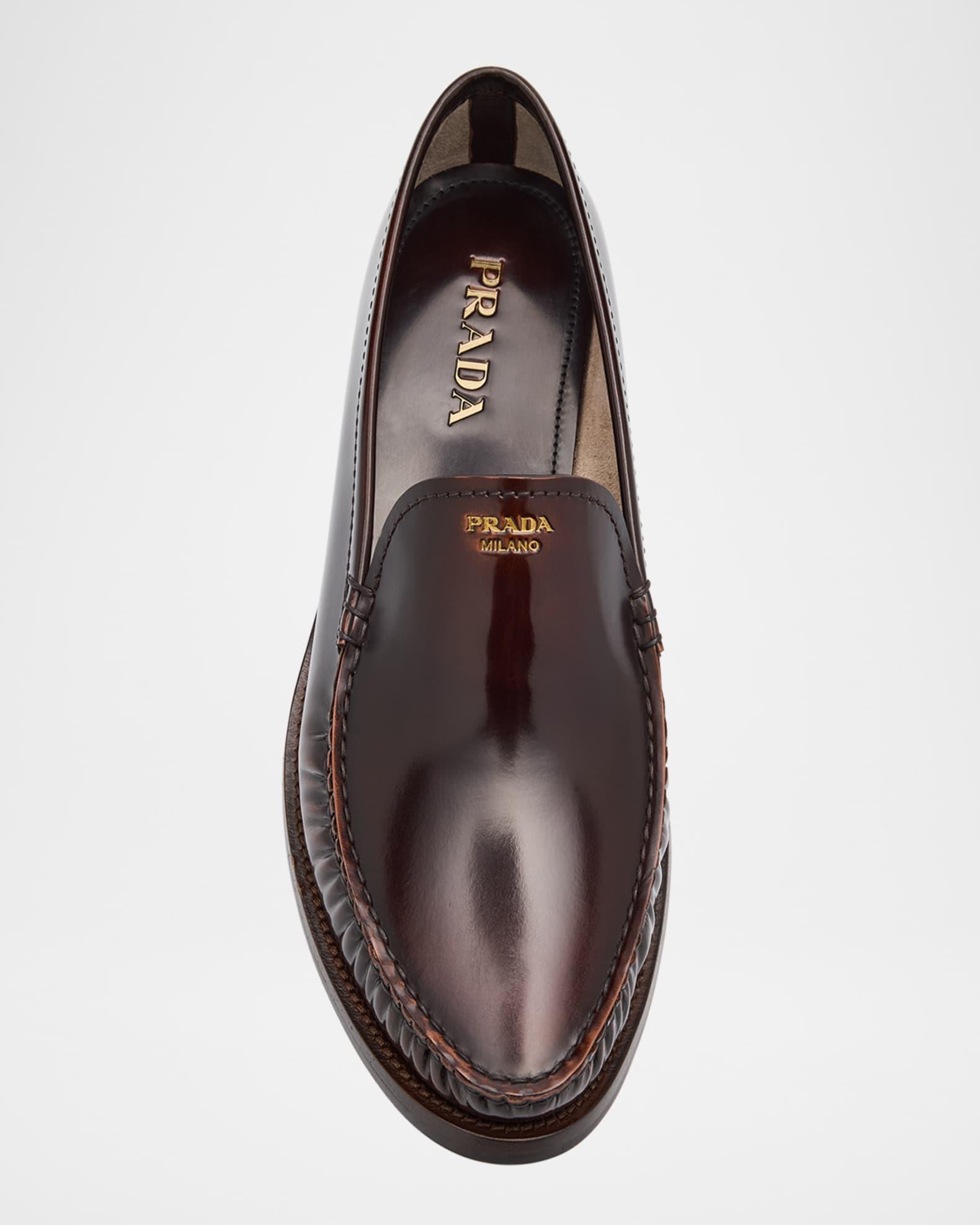 Prada loafers in brushed calf leather 0.75 in / 20 mm flat heel Round moc toe Notched vamp Metallic logo stamped vamp Slip-on style Leather outsole Professional cleaning recommended, spot clean Made in Italy Size Note: Runs true to size.
