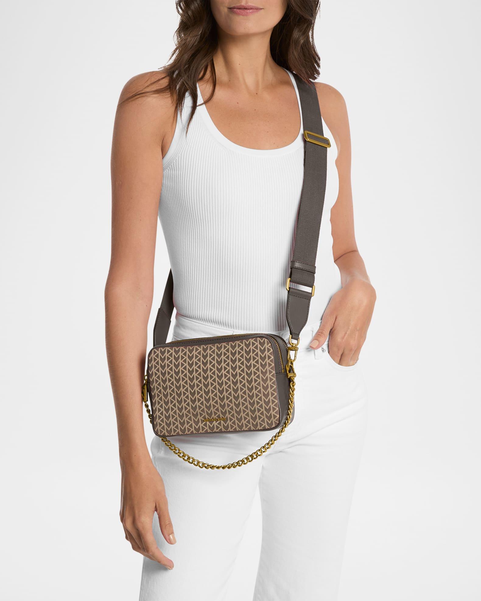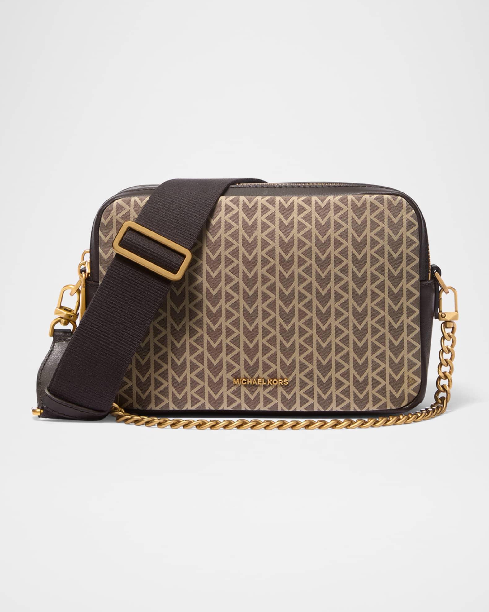 MICHAEL Michael Kors "Bryant" camera crossbody bag in signature logo canvas and leather Detachable chain top handle Detachable, adjustable web crossbody strap Can be worn as a top handle or crossbody bag Double zip top closure Interior, one card slot Lining: Polyester Approx. 5"H x 7.5"W x 3.3"D Polyester/polyurethane/acrylic Wipe clean Imported