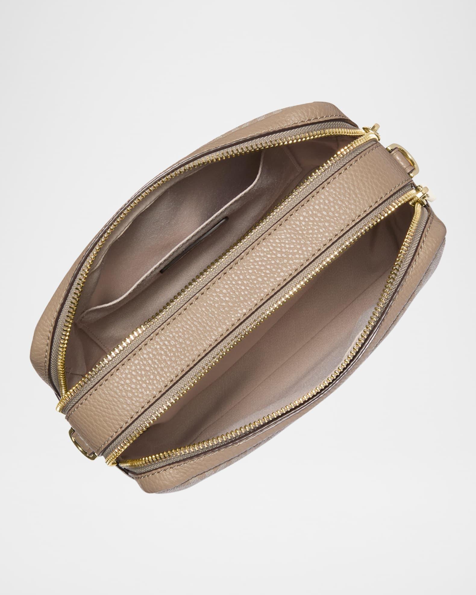 MICHAEL Michael Kors "Bryant" camera crossbody bag in signature logo canvas Detachable chain top handle Detachable, adjustable web crossbody strap Can be worn as a top handle or crossbody bag Double zip top closure Interior, one card slot Lining: Polyester Approx. 5"H x 7.5"W x 3.3"D PVC/polyester/polyurethane Wipe clean Imported