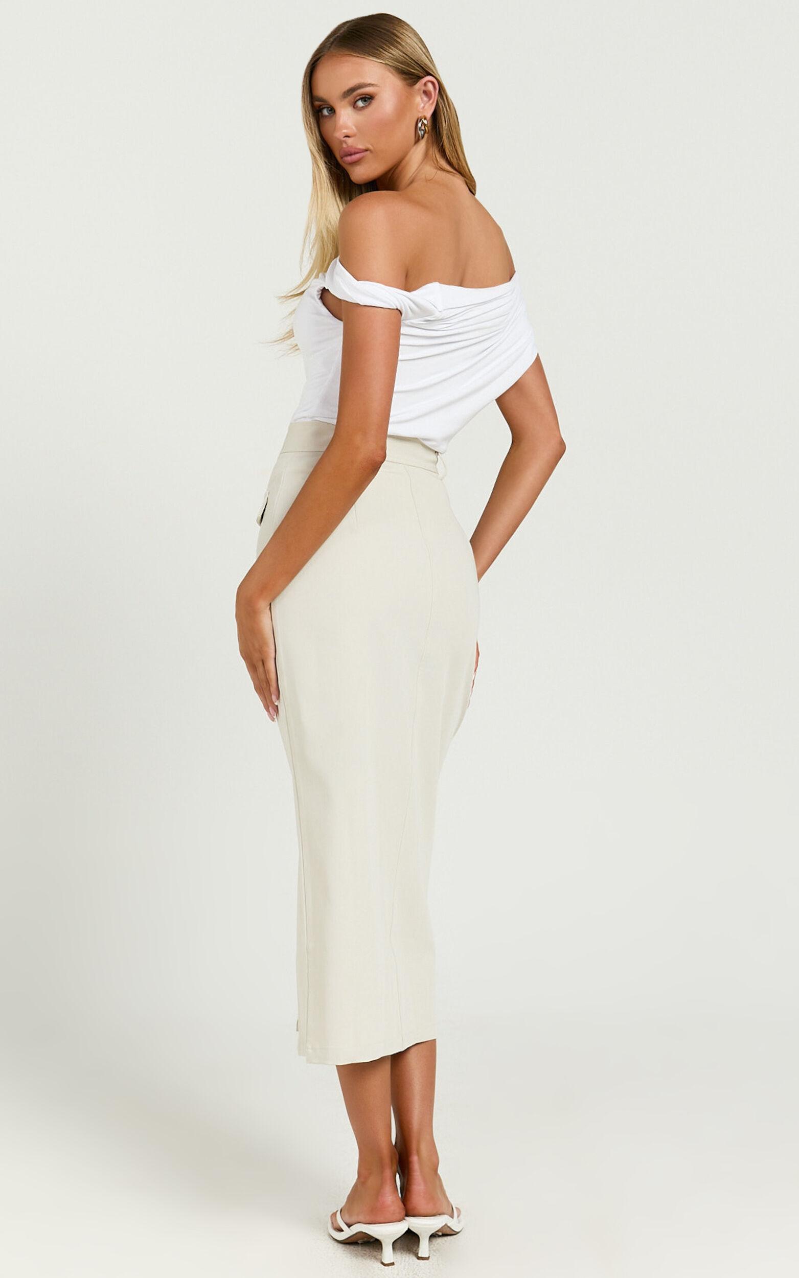 Elevate your style with our latest must-have, the Brylee Midi Skirt. Crafted for the fashion-forward woman, this high-waisted, front split masterpiece in a chic stone grey shade is the ultimate blend of sophistication and edge. Perfect for those who love to make a statement, the skirt’s bodycon silhouette is designed to flatter your figure, ensuring you stand out from the crowd.Product Details:Zips detailPockets featureBodycon fitTwill fabricPolyester materialWorkwear essentialMidi lengthHigh waistSize and FitSize S / 8 length: 85cm / 33.46inMaterial and Care80% Polyester, 18% Rayon, 2% CottonNo Stretch