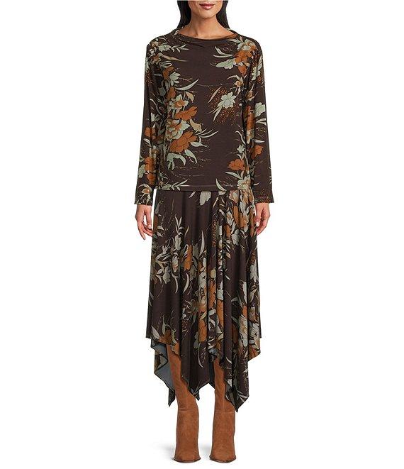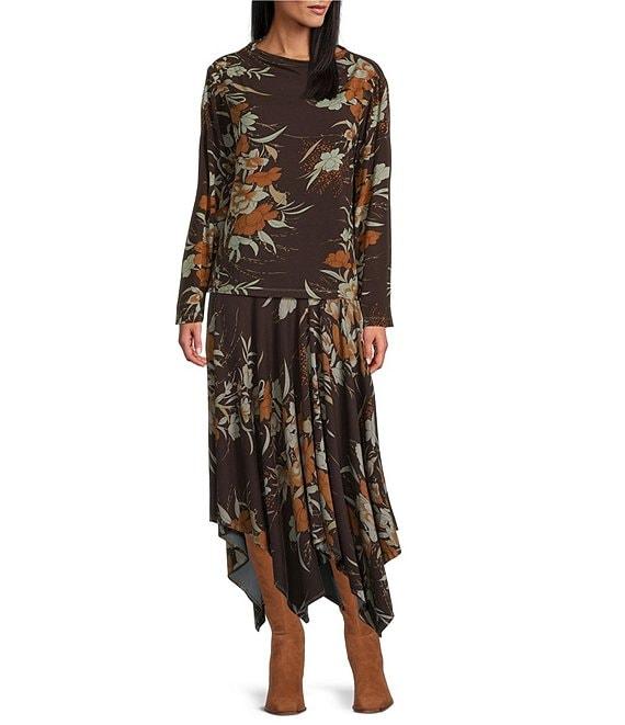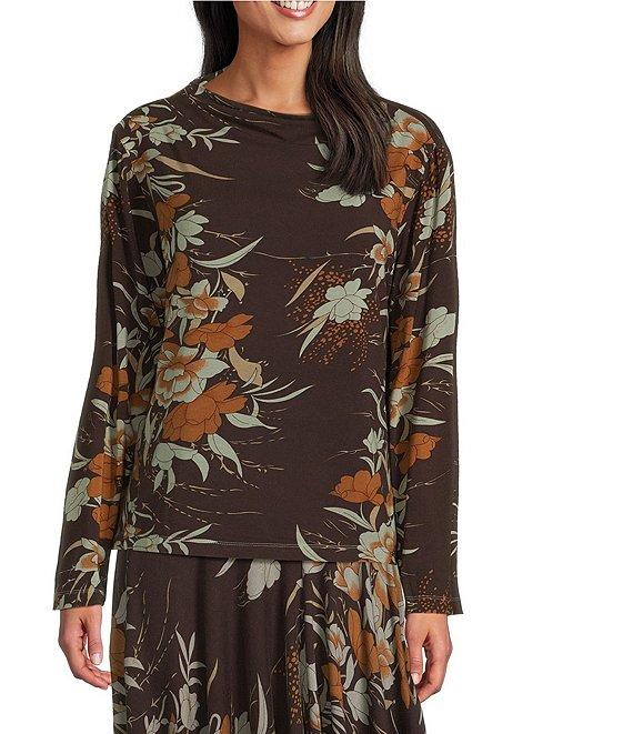 Bryn Walker Belen Fiori Print Coordinating Viscose Jersey Drape Neck Long Sleeve Shirt