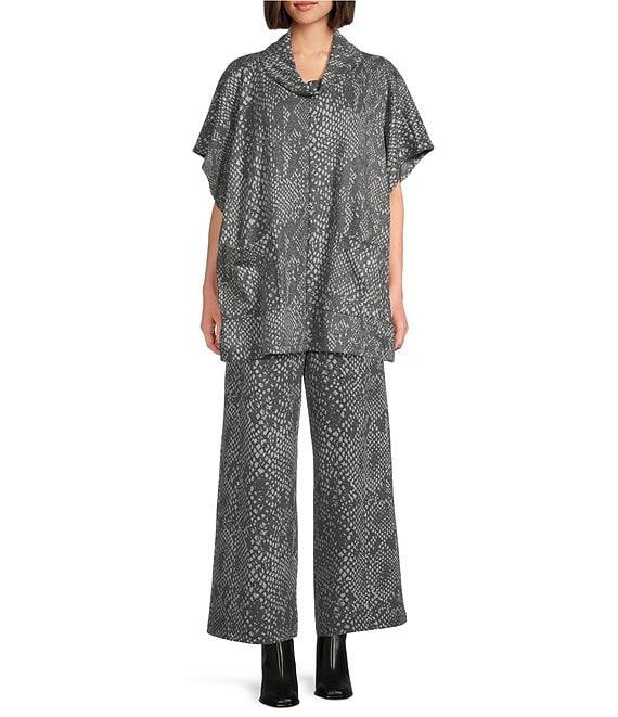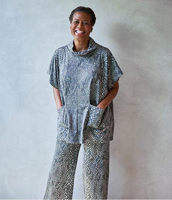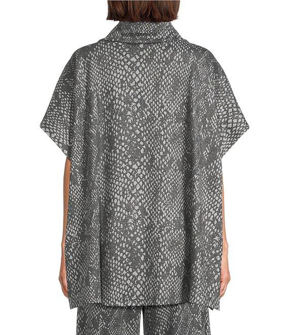 From Bryn Walker, this poncho features: Recycled knit fabrication Serpent print Mock neckline Cap sleeves Front patch pockets Straight hem Pullover construction Approx. 29" length Recycled polyester/viscose/elastane Machine wash Made in the USA and Imported.