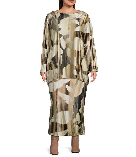 From Bryn Walker Plus, this top features: Arroyo print knit fabrication Boat neckline Long dolman sleeves Oversized fit High low hem Pullover construction Approx. 29" front; 34" back length Nylon/elastane Hand wash Made in the USA and imported.