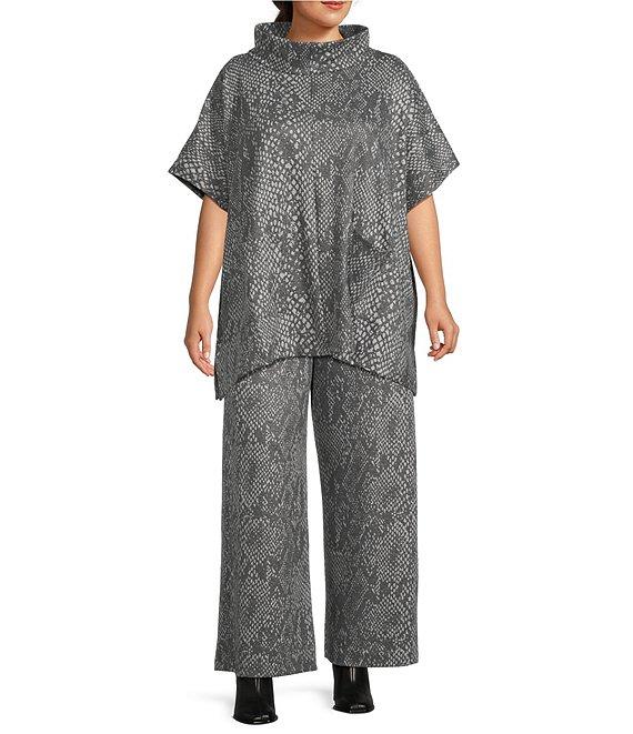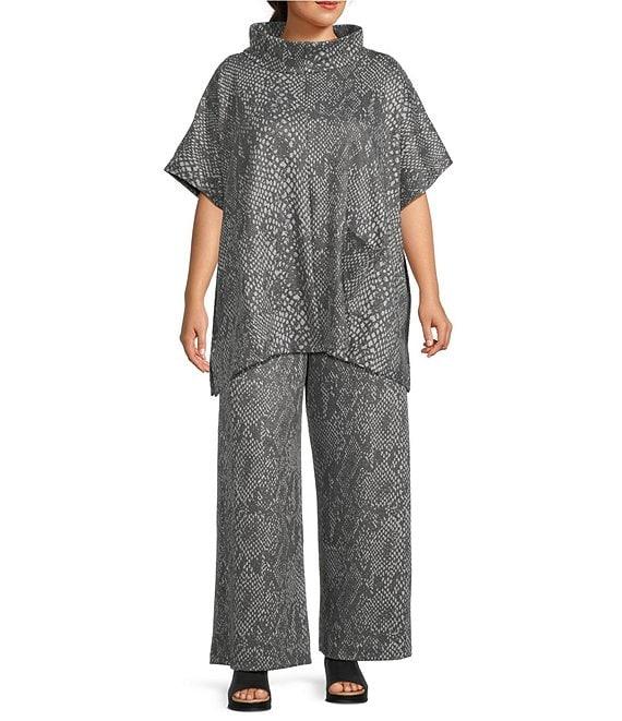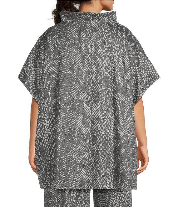 From Bryn Walker Plus, this poncho features: Recycled knit fabrication Serpent print Mock neckline Cap sleeves Front patch pockets Straight hem Pullover construction Approx. 33.25" length Recycled polyester/viscose/elastane Machine wash Made in the USA and Imported.