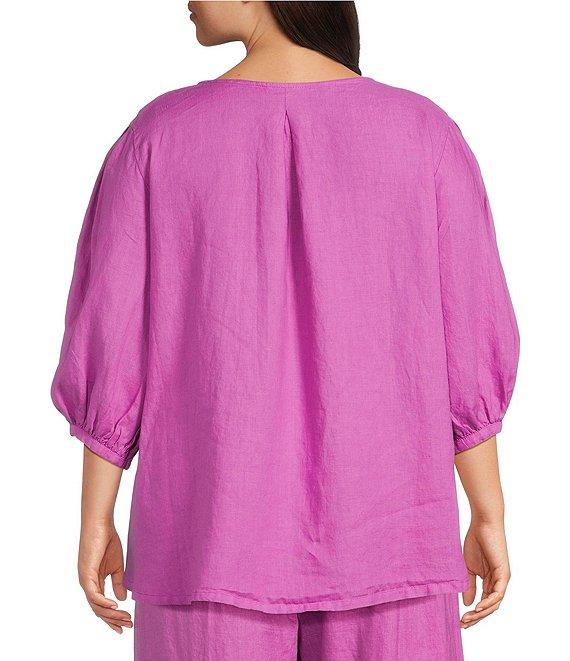 From Bryn Walker Plus, this shirt features: Light woven linen fabrication Relaxed fit Round neckline 3/4 sleeves with banded cuffs Inverted front and back pleats High-low hem Pullover construction Approx. 25.75" front; 29.25" back length Linen Machine wash Made in the USA.