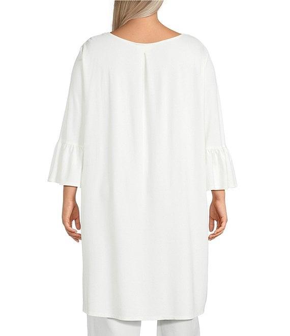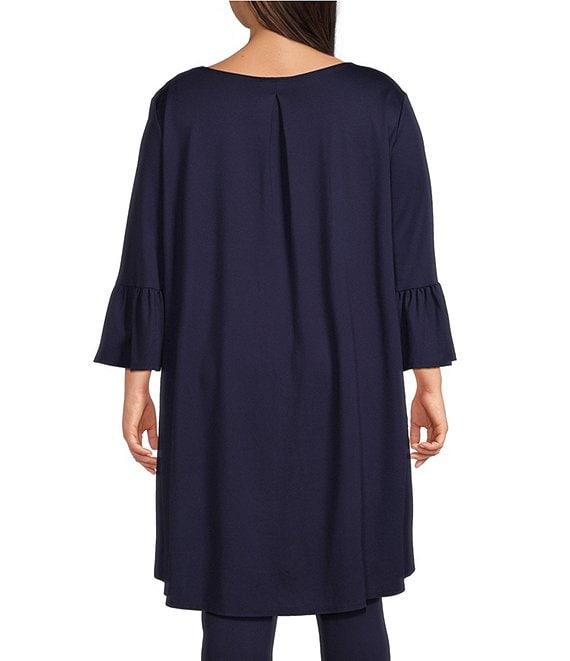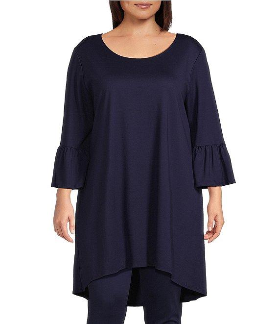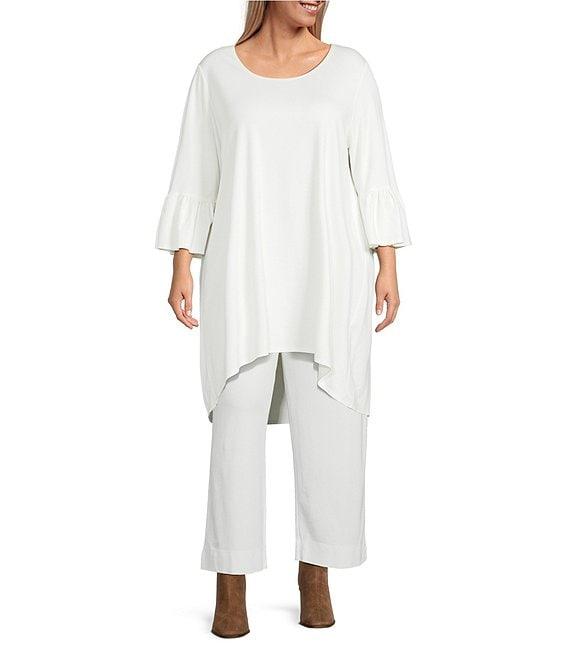 From Bryn Walker plus, this tunic features: Modal ponti fabrication Round neckline 3/4 ruffle bell sleeves High-low hem Oversized fit Pullover construction Approx. 35" front; 39" back length Modal ponti/nylon/elastane Machine wash Made in the USA.
