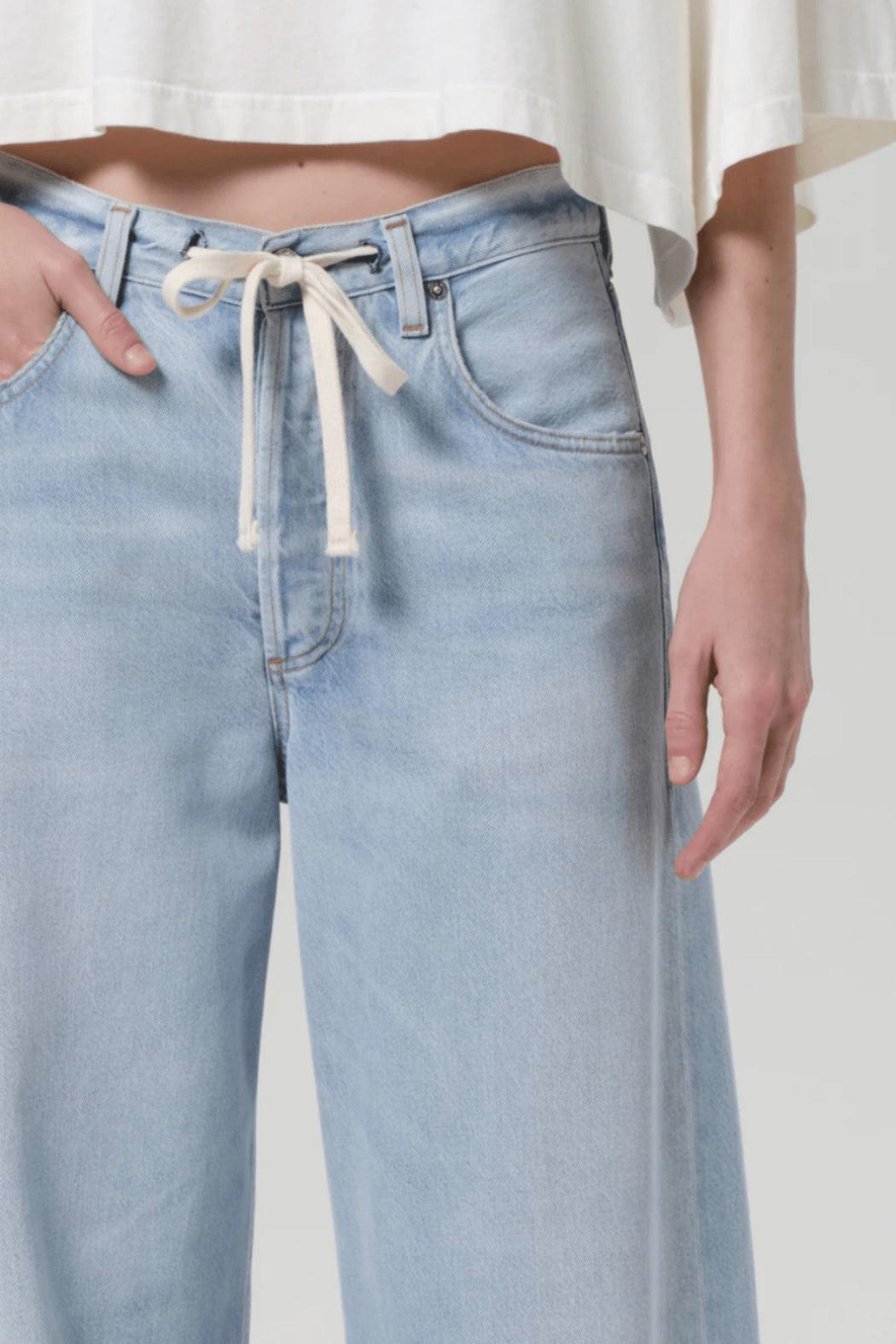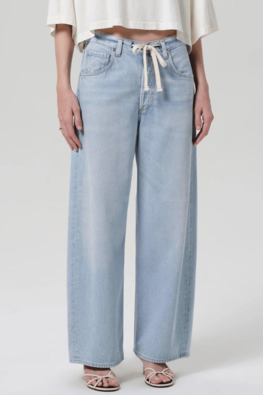 Looks Like: Light indigo denim with soft fading,whiskering and drawstring detail