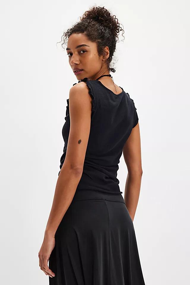 Made from delicate cotton mesh, this cowl-neck tank features intentional side ruching and frilled trim for the perfect dose of feminine edge. * Sheer cotton mesh fabrication * Cowl neckline * Sleeveless * Slightly fitted
