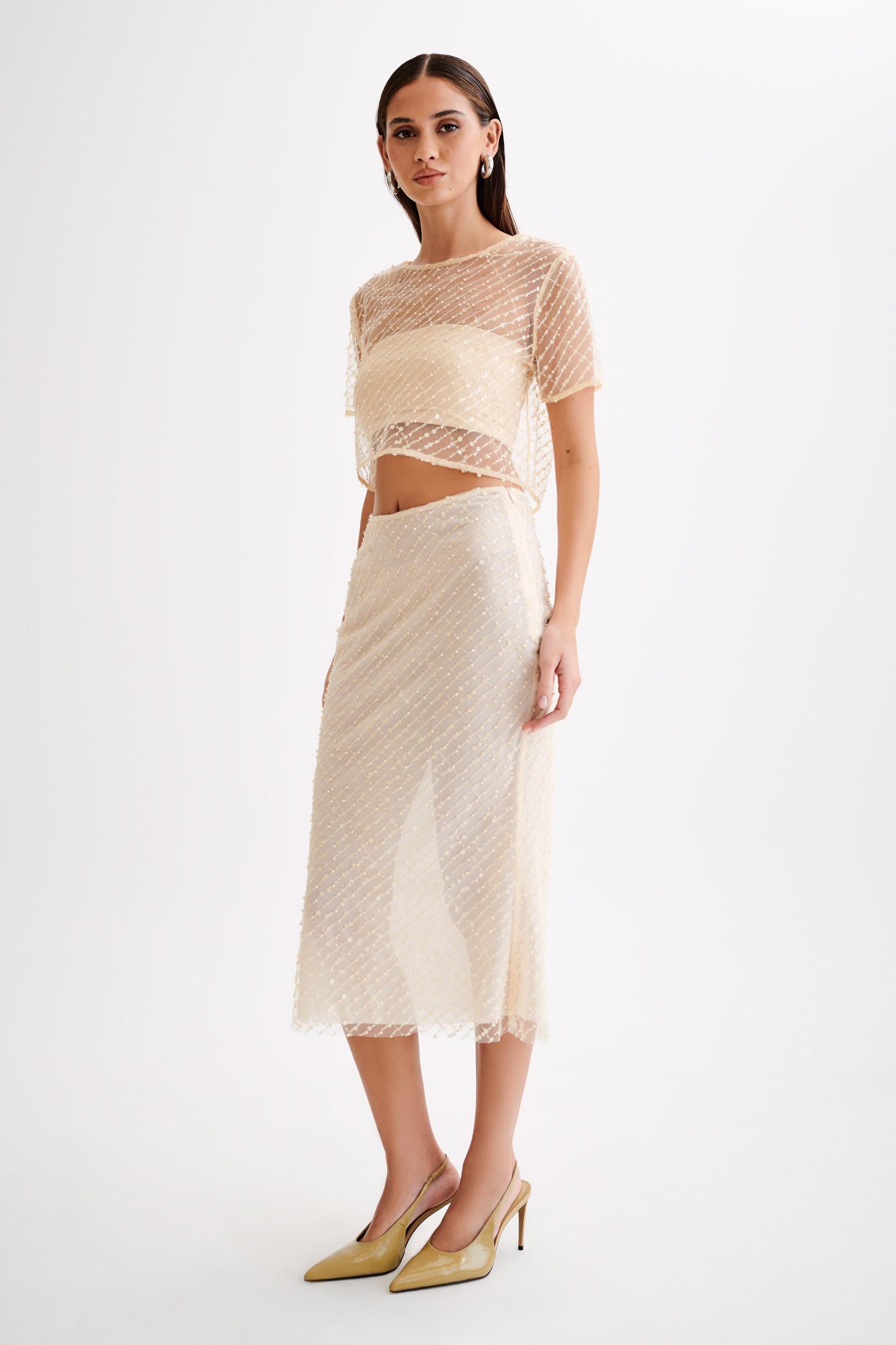 Claim it. The energy of the season in a single skirt, the BRYNNE Sequin Midi is a mid-rise skirt crafted from a luxurious sequin fabrication designed to capture the light and eyes of everyone around you as you wear it. The bodycon silhouette hugs your figure with a flattering fit, while the flared hem for ease of movement. Perfect with a classic tee or match it with the Brielle Sequin Halter Top to complete the look.