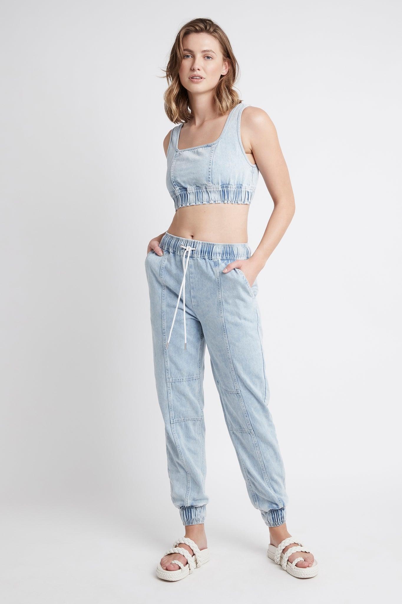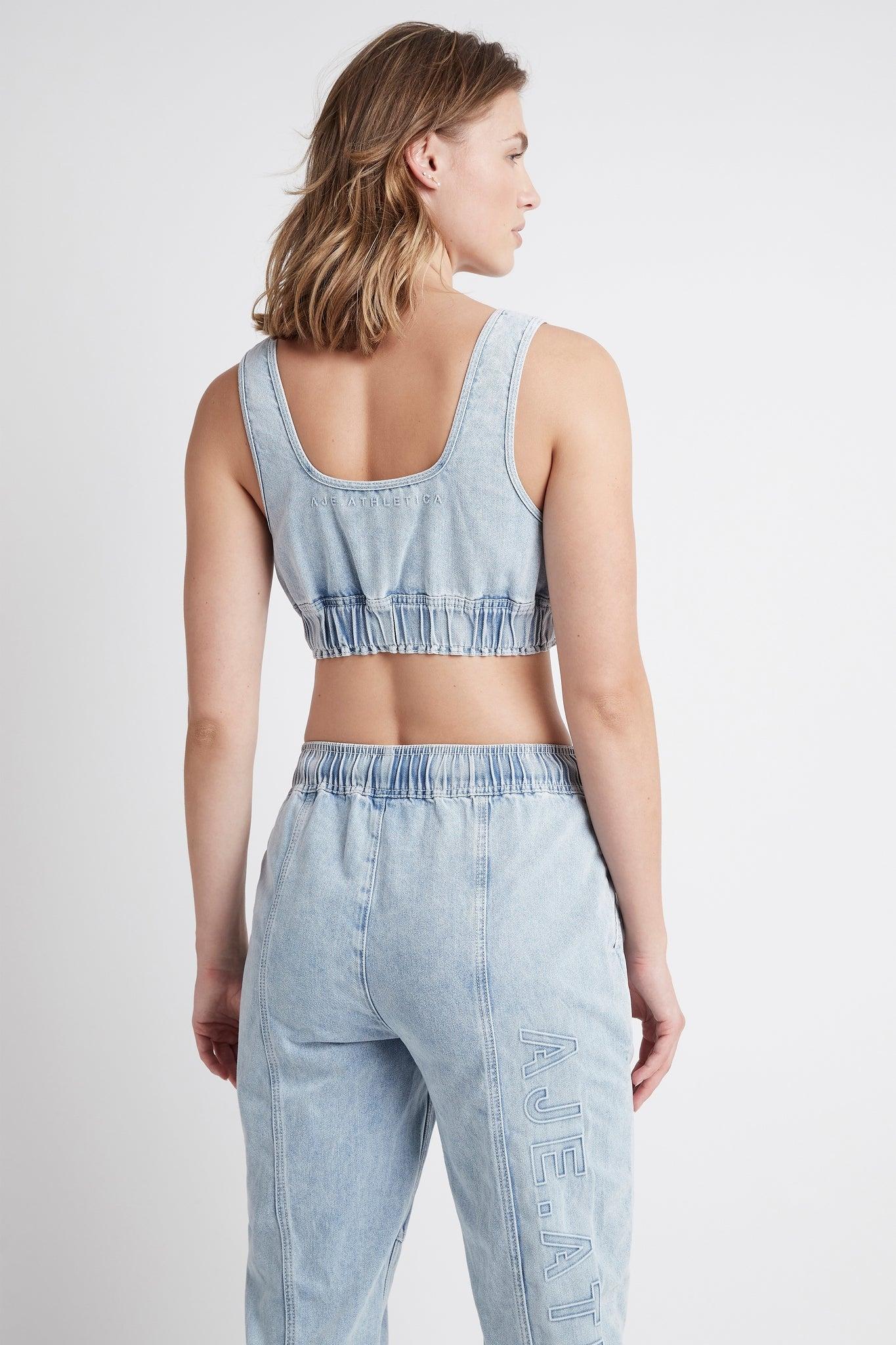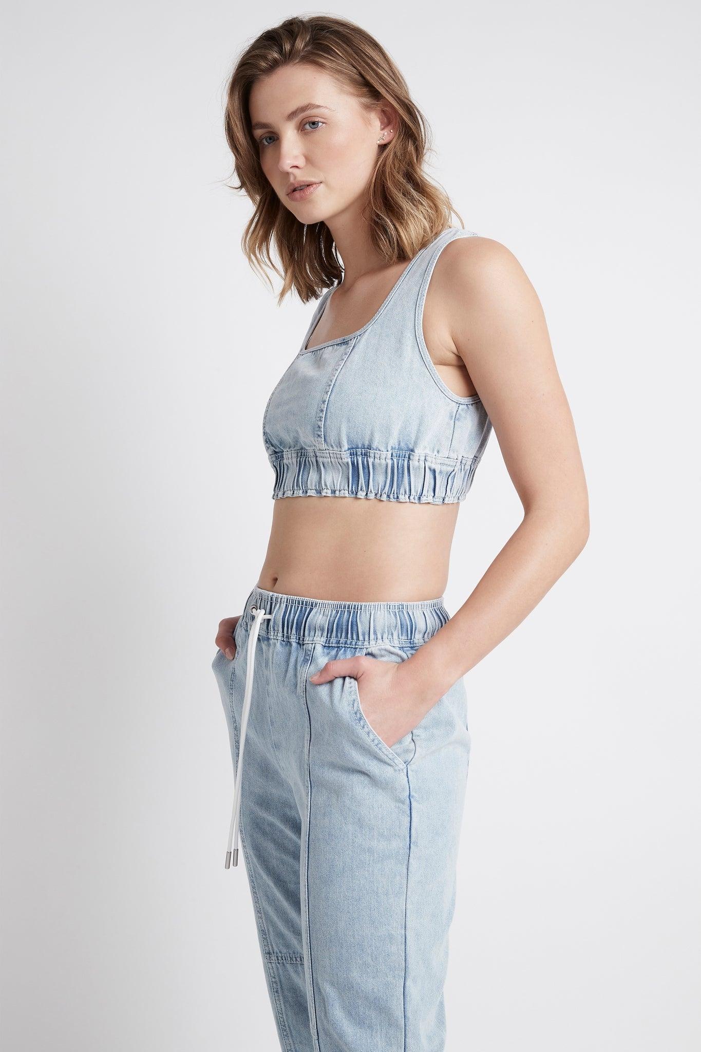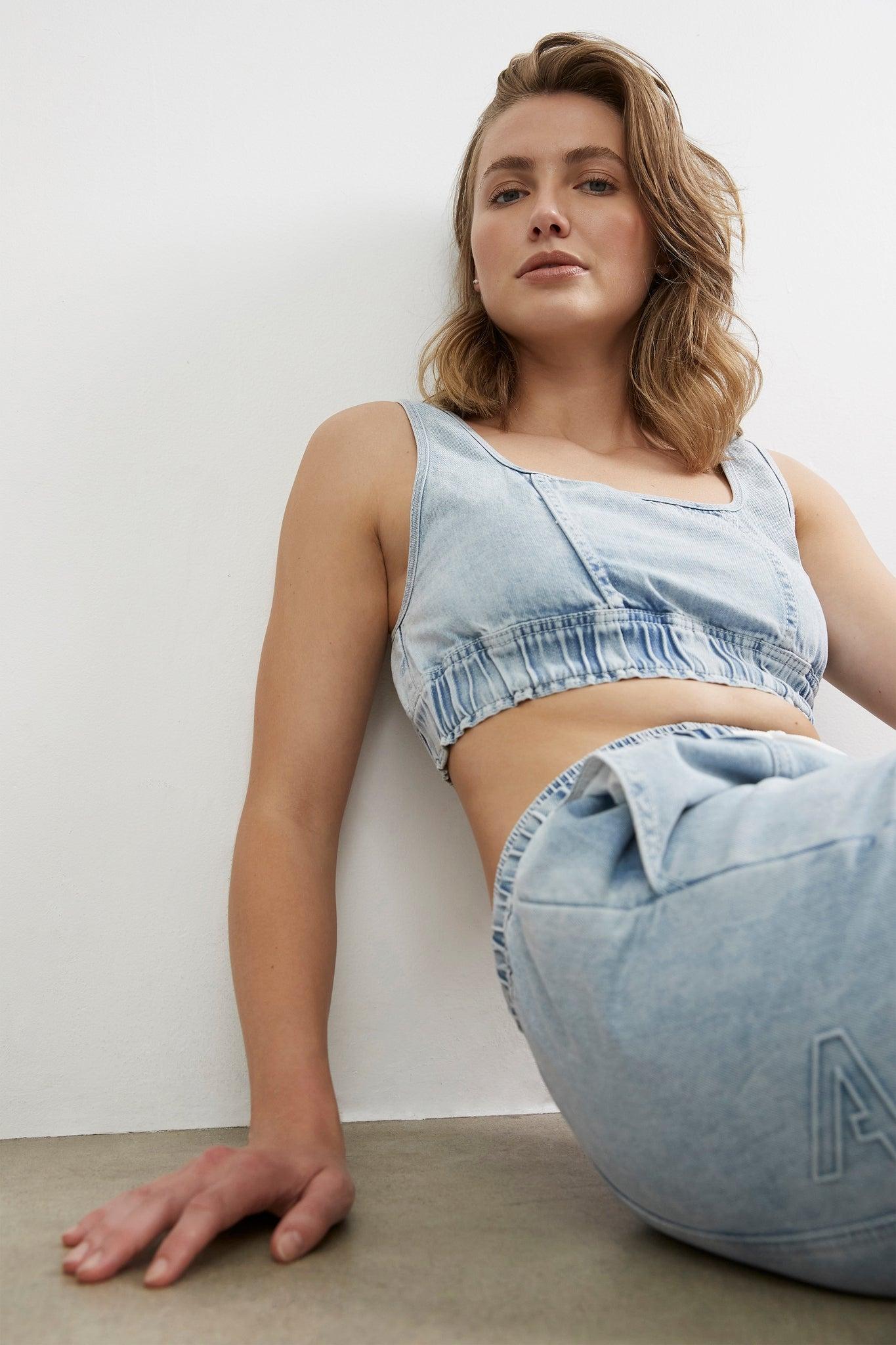 PRODUCT DETAILS 90s-inspired denim crop top Scoop neck design Wide straps Embroidered logo at the back Wide elasticated encased hem Ruched, gathering detail throughout Designed for streetwear, not sport SIZE AND FIT Frankie wears a size 8/S and is 178cm in height FABRICATION 100% Cotton Delicate Cold Hand or Machine Wash