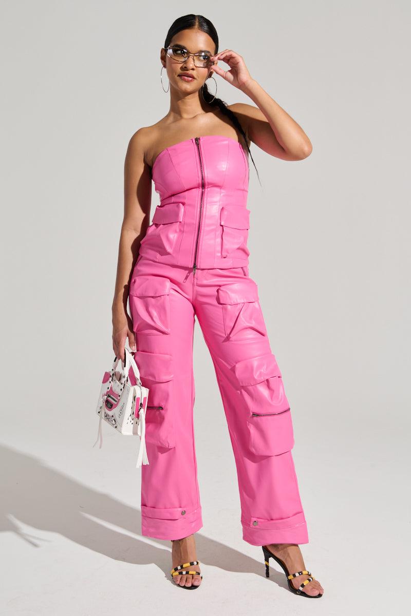 Hit me with your sweet love, steal me with a kiss, I’m gonna be your bubblegum b*tch. The AKIRA Label Bubblegum Shorty Cargo Pant is a sweet style crafted from faux leather in a deliciously juicy shade of pink. It features a high-rise, wide-leg fit, multiple cargo-style pockets throughout, zippered waist pockets, functional belt loops, and a zip-button front closure. Style with the coordinating Bubblegum Shorty Corset Top to look like an irresistibly sugary snack. - 55% PU, 45% Polyester- Some Stretch- Imported (all measurements approximate from size small)- 41” Waist to Hem- 30” Inseam- 11” Rise Product ID: 434944 (all measurements approximate from size 1X)- 42” Waist to Hem - 29” Inseam- 13” Rise Product ID: 434948