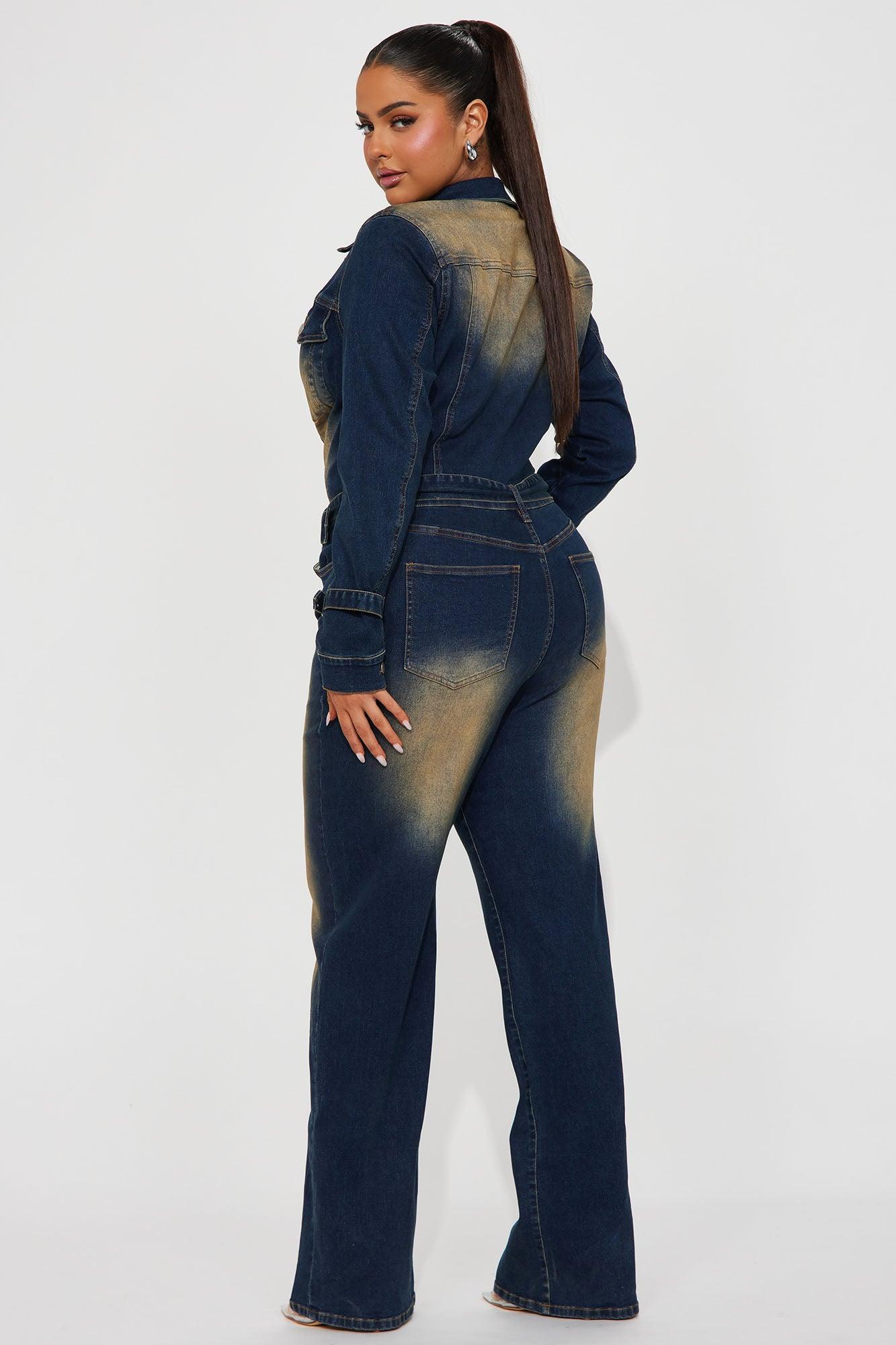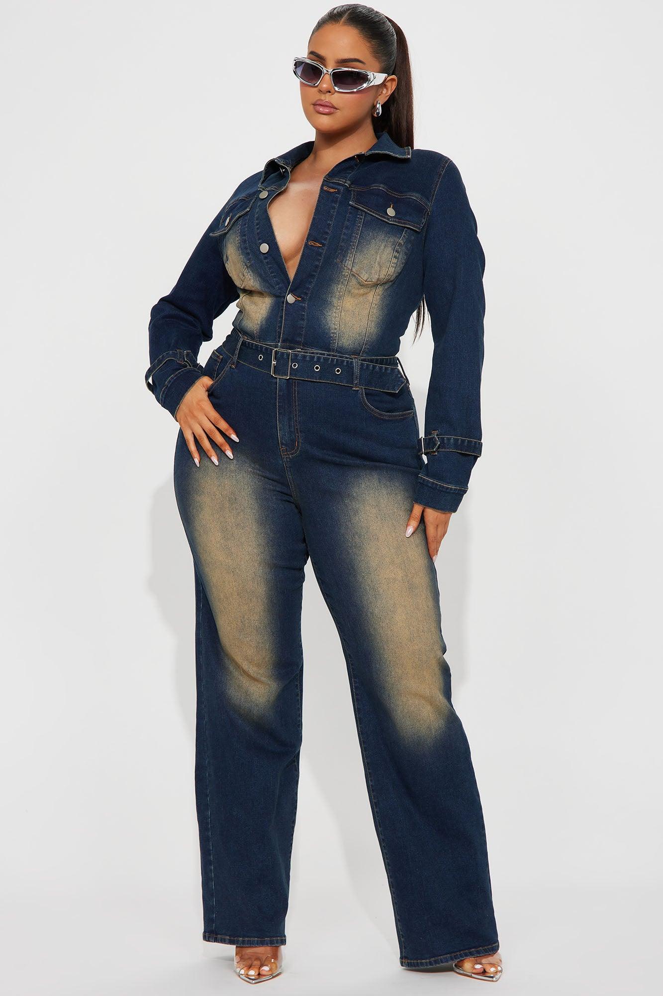 Available In Dark Wash. Denim Jumpsuit Collar Long Sleeve Button Up Straight Leg Stretch Inseam= 33" Disclaimer: Due To The Specialized Wash Process, Each Garment Is Unique. 73.5% Cotton 23% Polyester 2.5% Viscose 1% Spandex Imported California Proposition 65WARNING: Cancer and Reproductive Harm - www.P65Warnings.ca.gov.