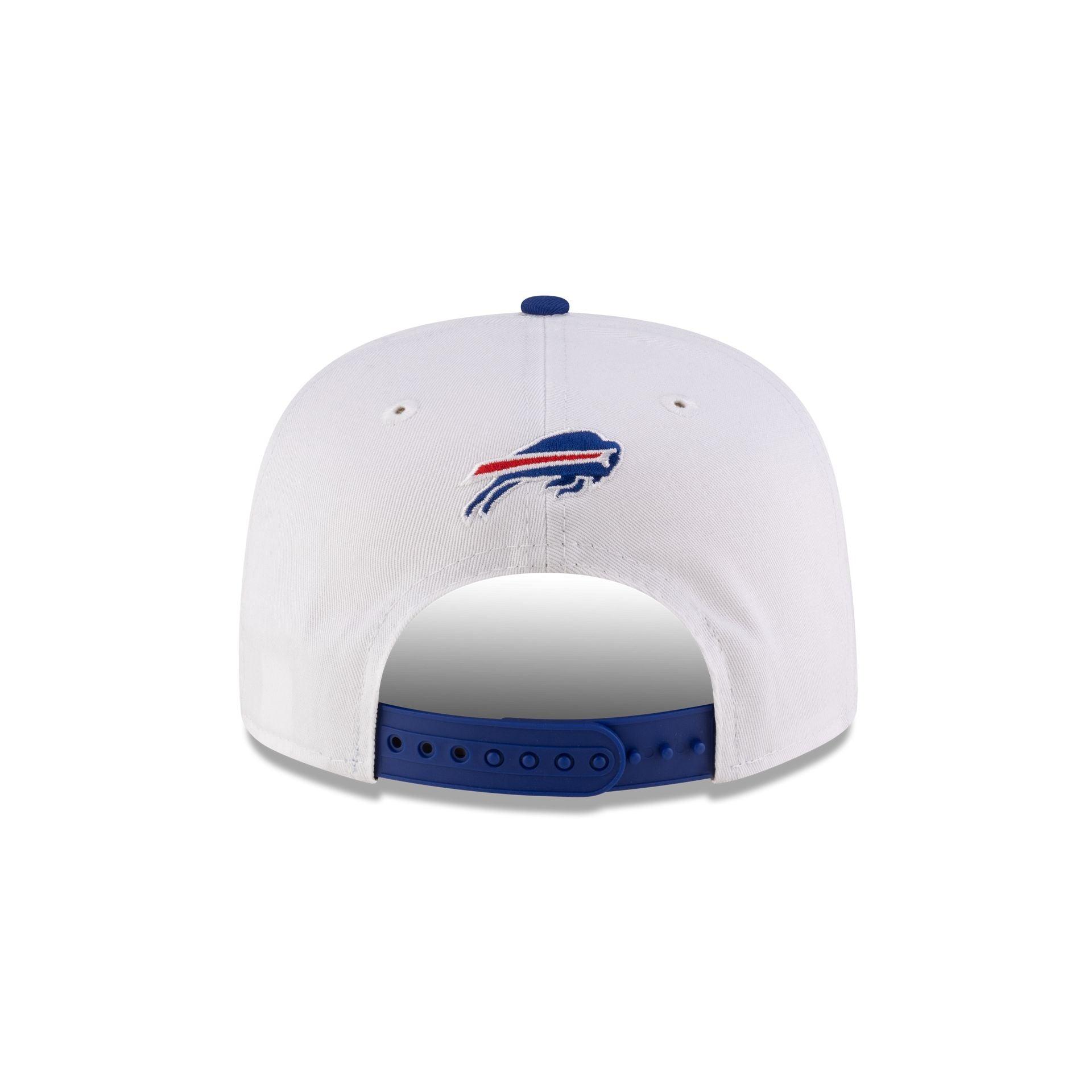 The Buffalo Bills Josh Allen MVP White Golfer features an embroidered Go Bills wordmark and Allen 17 jersey number at the front panel with a 2024 MVP patch at the right-wear side. Additional details include a Bills logo above an adjustable snapback closure at the rear with a blue visor and a gray undervisor.