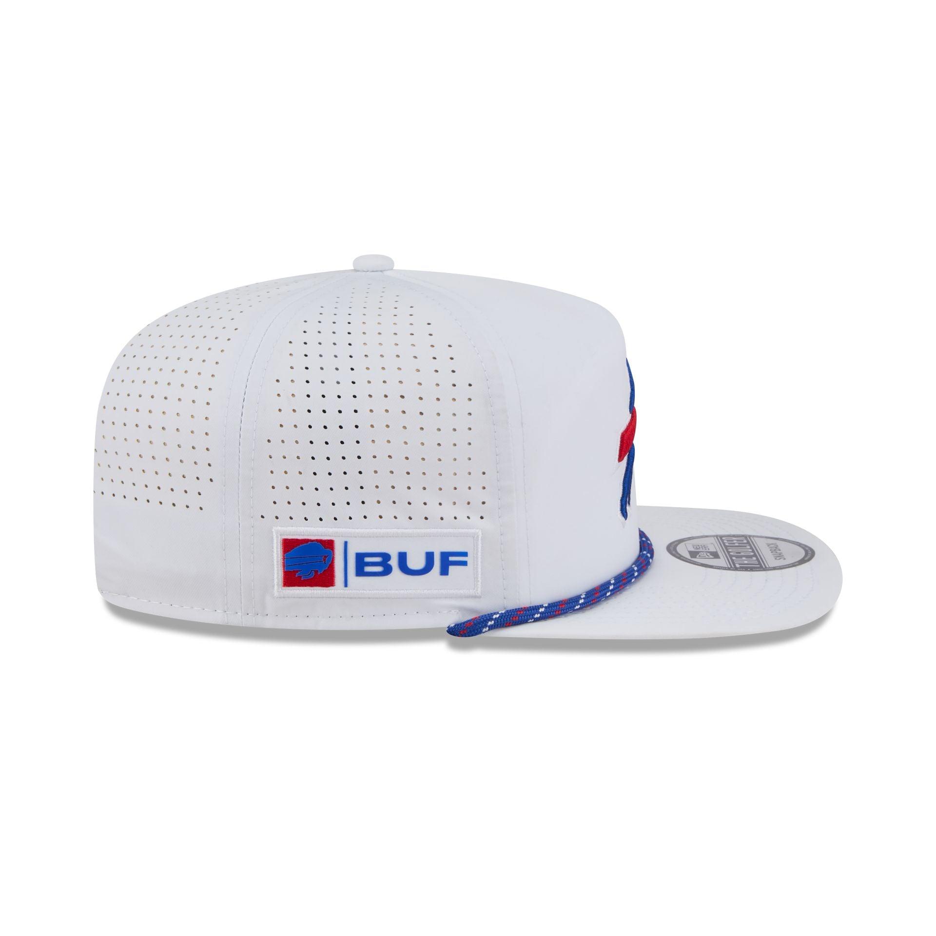 The Buffalo Bills Optic White Performance Rope Golfer features an embroidered Bills logo at the front panels with breathable performance fabric throughout the cap. Additional details include a city patch at the right-wear side, an adjustable drawstring closure at the rear, and a blue undervisor.