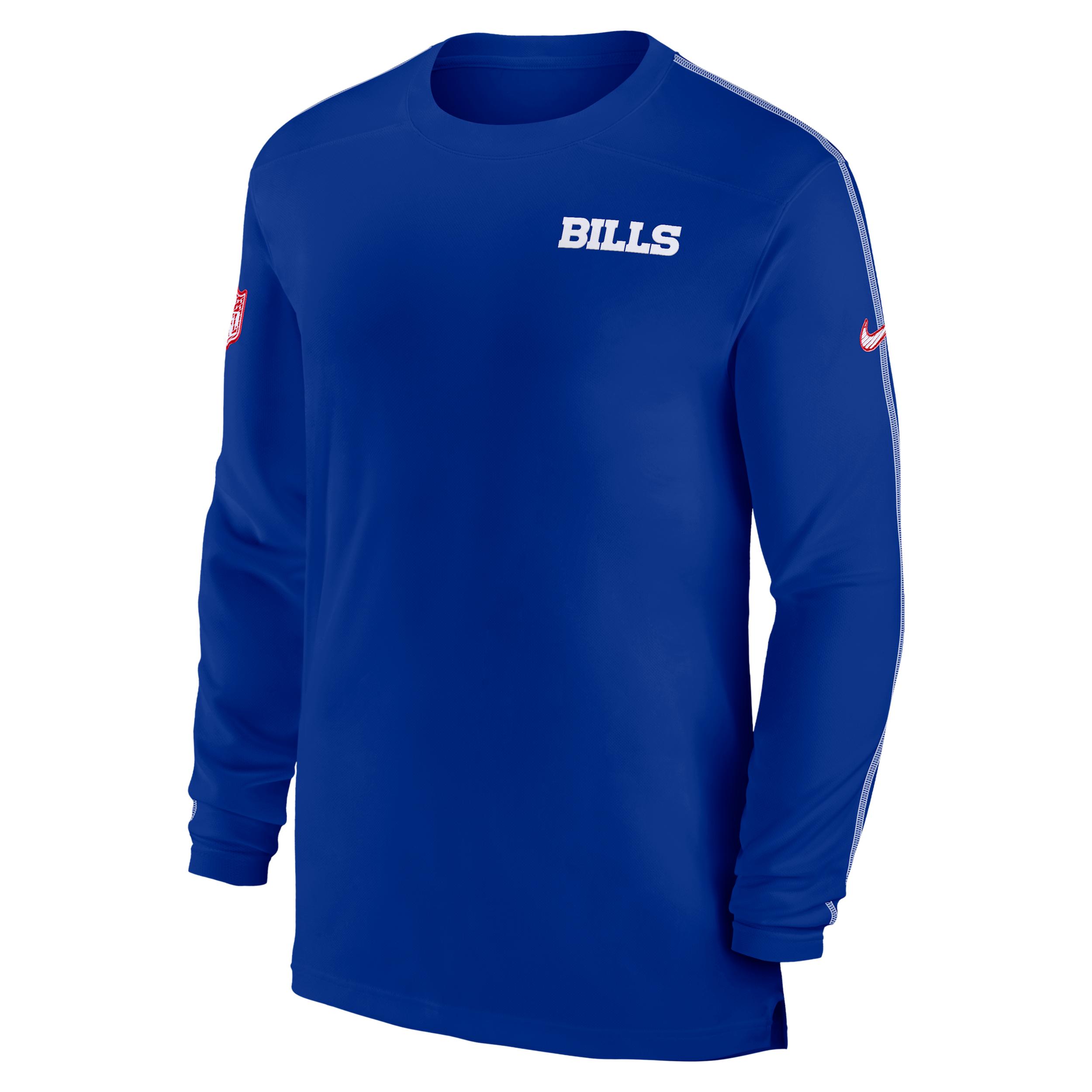 This Sideline Coach Top is a lightweight garment made with double-knit fabric that helps add structure and stability. Its sweat-wicking technology and UV protection help create a breathable, functional layer for Buffalo Bills game day. Benefits:Nike Dri-FIT technology moves sweat away from your skin for quicker evaporation, helping you stay dry and comfortable. This product provides UVA and UVB protection from the sun only in the areas covered by the garment. To protect exposed areas, the use of good quality sunscreen is recommended. Product Details:100% polyester. Machine wash. Imported. Style: 02EV936Z81; Color: Royal; Size: 3XL; Gender: Male; Age Group: Adult | Buffalo Bills Sideline Coach Men's Nike Dri-FIT NFL Long-Sleeve Top in Blue, Size: 3XL | 02EV936Z81-M60
