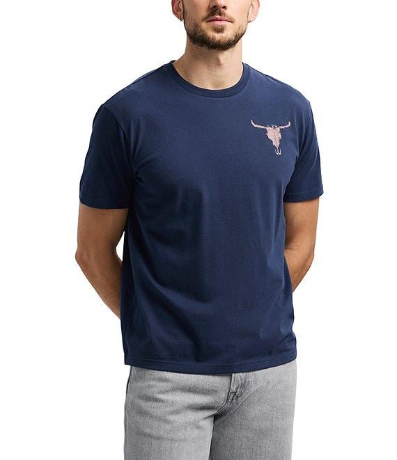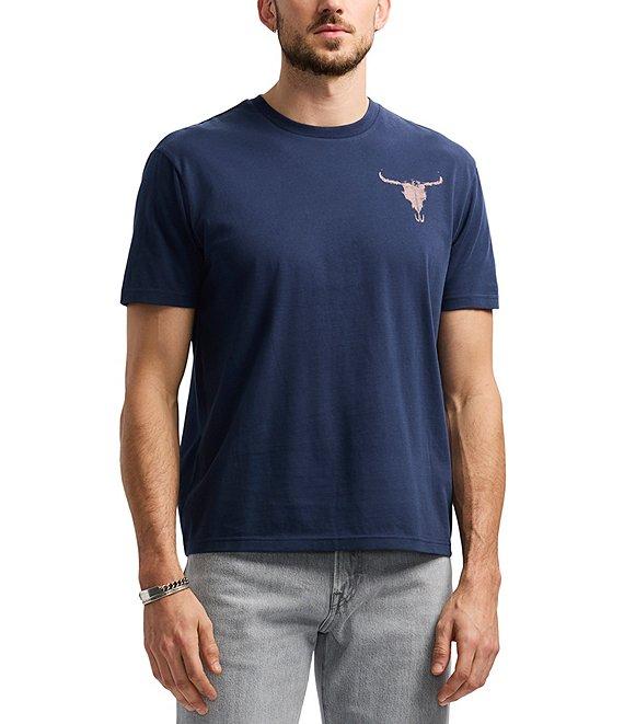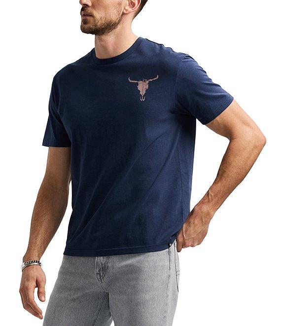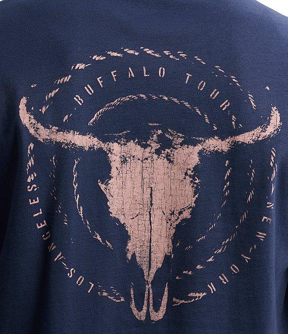 From Buffalo David Bitton, this t-shirt features: Crew neckline Short sleeves Slightly dropped shoulders Distressed longhorn skull graphic on the chest Large skull print on the back, surrounded by rugged rope detailing and "Buffalo Tour" text Stand-out piece for weekends or casual nights Regular fit with roomier midsection Longer length Pullover construction Cotton Machine wash/tumble dry Imported.