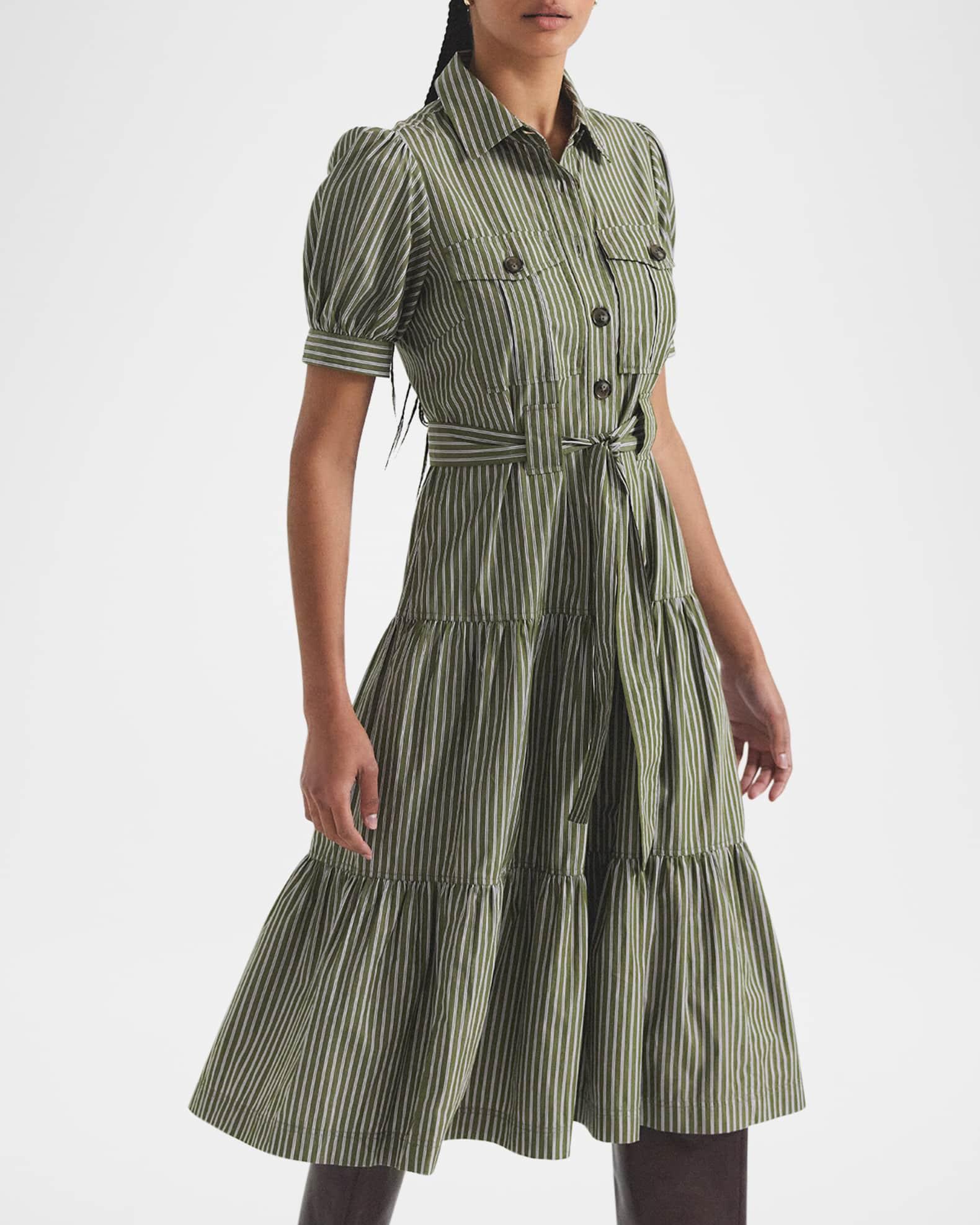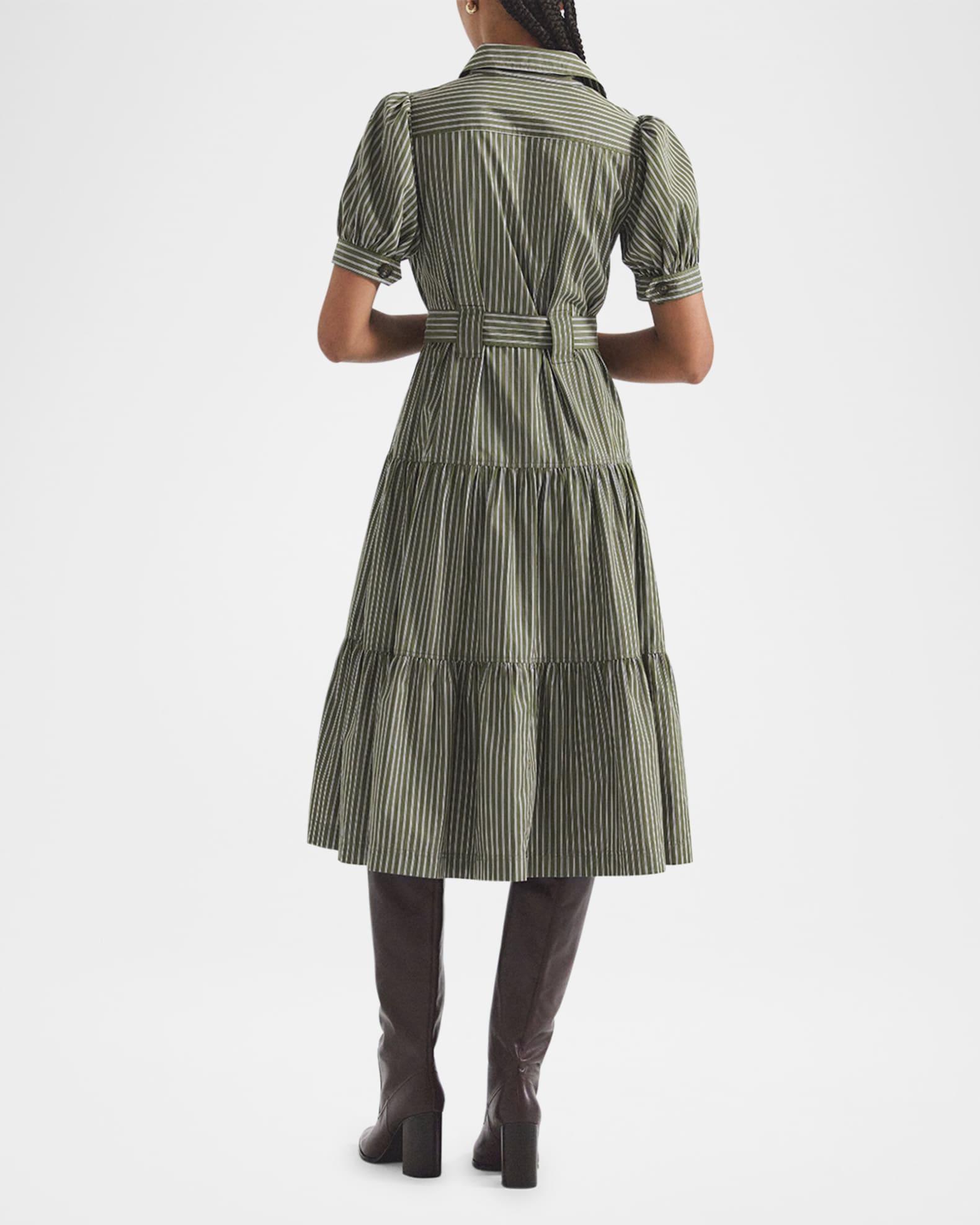 Derek Lam 10 Crosby "Buffy" vertically-striped tiered shirtdress Approx. 47"L from shoulder to hem Spread collar; button front Short puff sleeves; button cuffs Chest buttoned flap pockets Self-tie belt through belt loops Yoked back Full length A-line silhouette Cotton Unlined Dry clean Imported