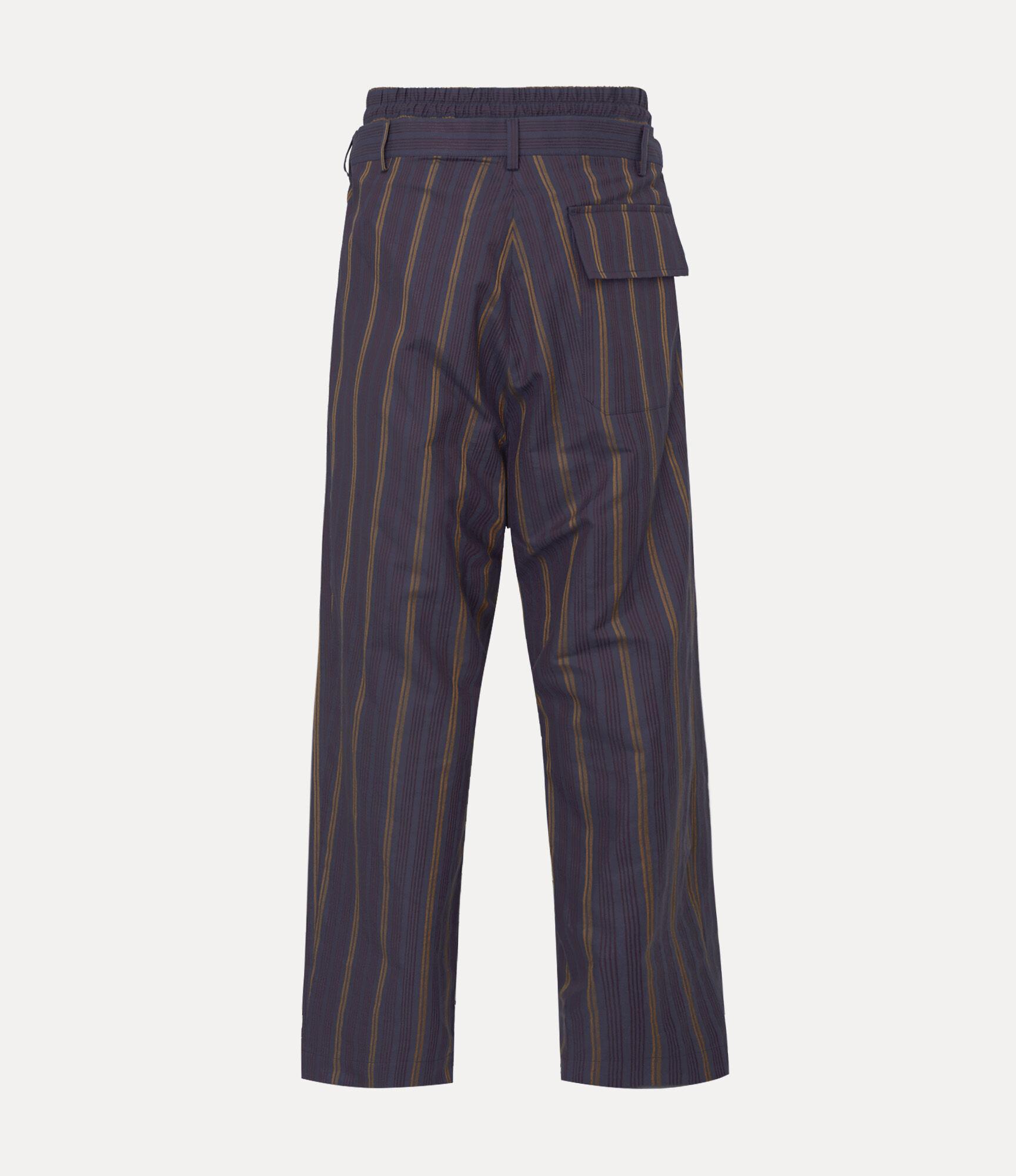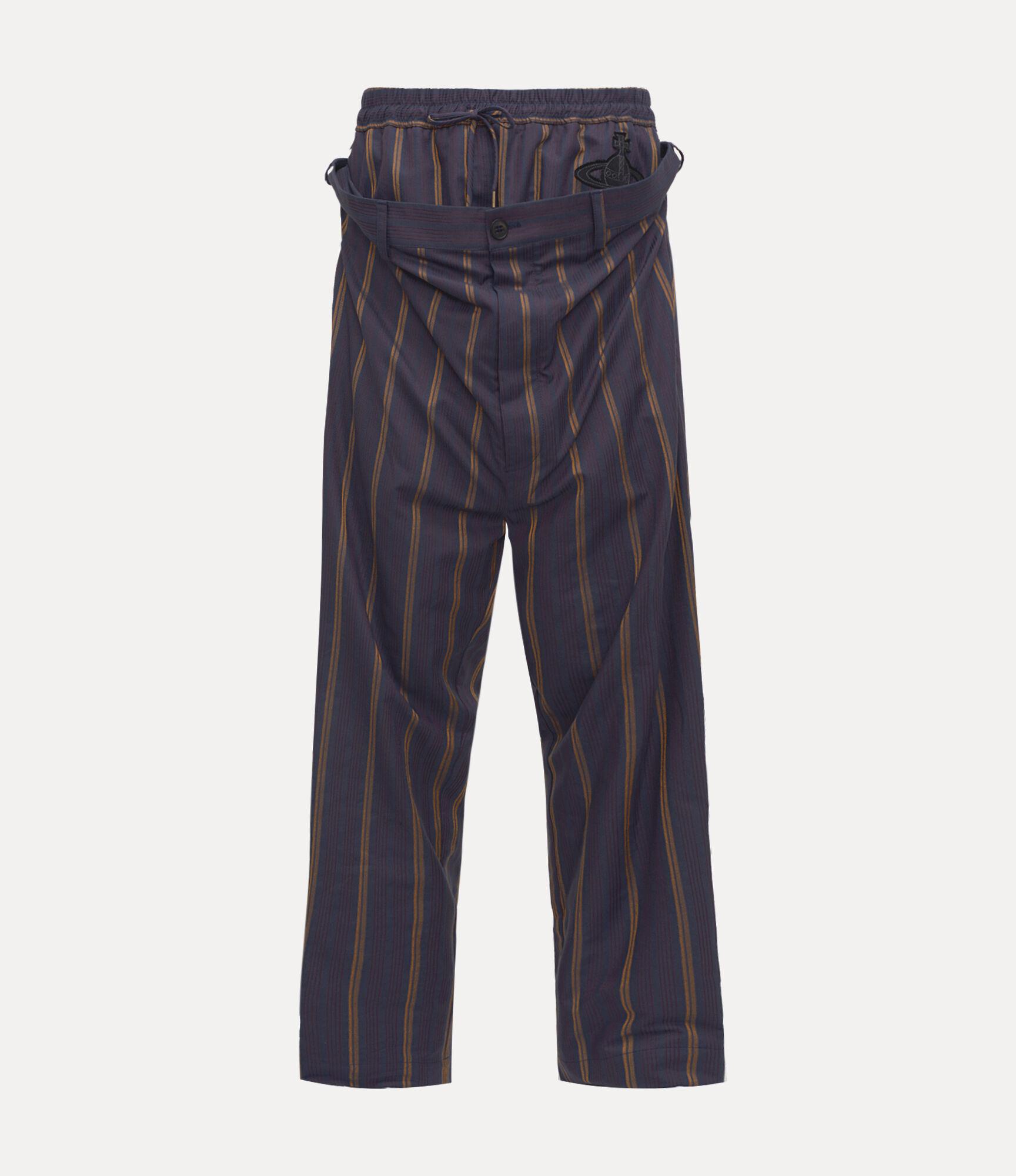 Our Builder trousers return this season in a striped cotton finish, detailed with an embroidered orb at the hip. Featuring a distinctive double waistband, the design employs Vivienne’s experimental ‘Builder’ tailoring system - first introduced in the Autumn–Winter 2014–15 collection, 'Save the Rainforest'.