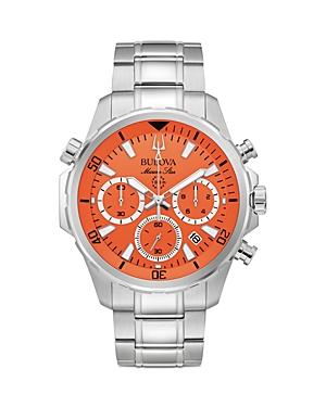 This Bulova chronograph watch from the Marine Star Collection delivers the vibrancy of the sea with the ruggedness required by those who wish to explore it. The six-hand model features a 43.5mm silver-tone stainless steel case, a flat mineral crystal, mercury-free battery and a pull-out crown, achieving 100-meter water resistance. The orange dial with black accents is inspired by vintage Bulova timepieces, showcasing three sub-dials, an internal rotating 60-minute timing bezel and date display. The silver-tone stainless steel hands and applied markers have been treated with luminescent material for low-light legibility. The silver-tone stainless steel bracelet secures with an extendable sport fold-over clasp with pushers and a safety bar.