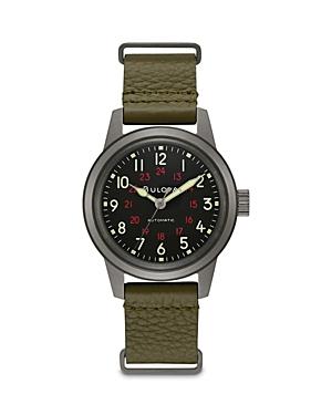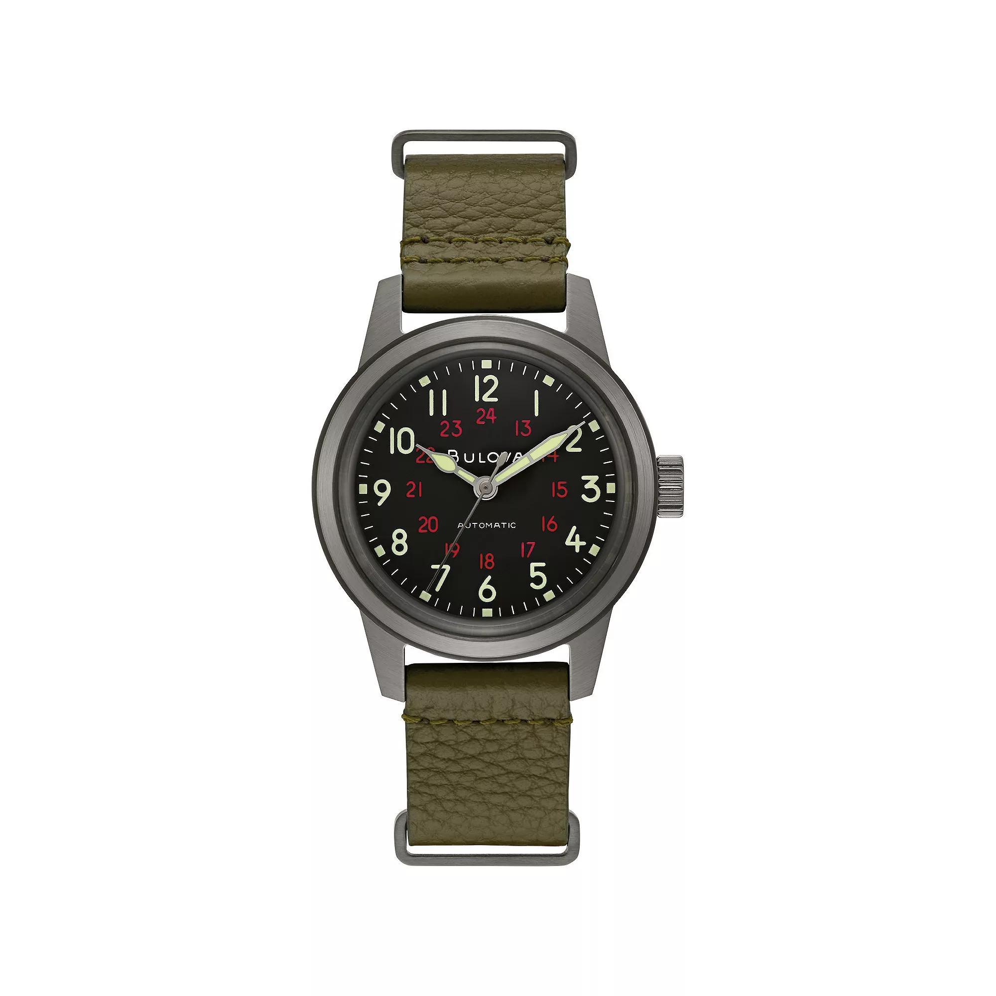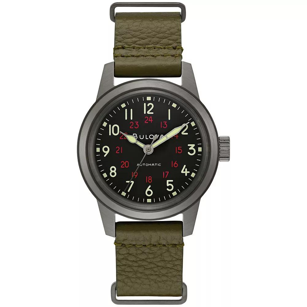 Grey ion-plated stainless steel case with a green leather NATO strap. Fixed grey ion-plated stainless steel bezel. Black dial with silver-tone hands and Arabic numeral hour markersu00a0u00a0 Minute markers around the outer rimu00a0u00a0 Dial Type: Analogu00a0u00a0 Luminescent hands and markersu00a0u00a0 Automatic movement with a 42-hour power reserveu00a0u00a0 Scratch resistant mineral crystalu00a0u00a0 Pull / push crownu00a0u00a0 Solid case backu00a0u00a0 Round case shape, case size: 38 mm, case thickness: 13.45 mmu00a0u00a0 Buckle claspu00a0u00a0 Water resistant at 30 meters / 100 feetu00a0u00a0 Functions: hour, minute, secondu00a0u00a0 Military watch style Bulova Hack Automatic Black Dial Mens Watch 98A255 in Green, Mens at Urban Outfitters