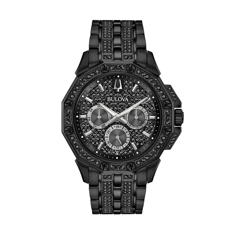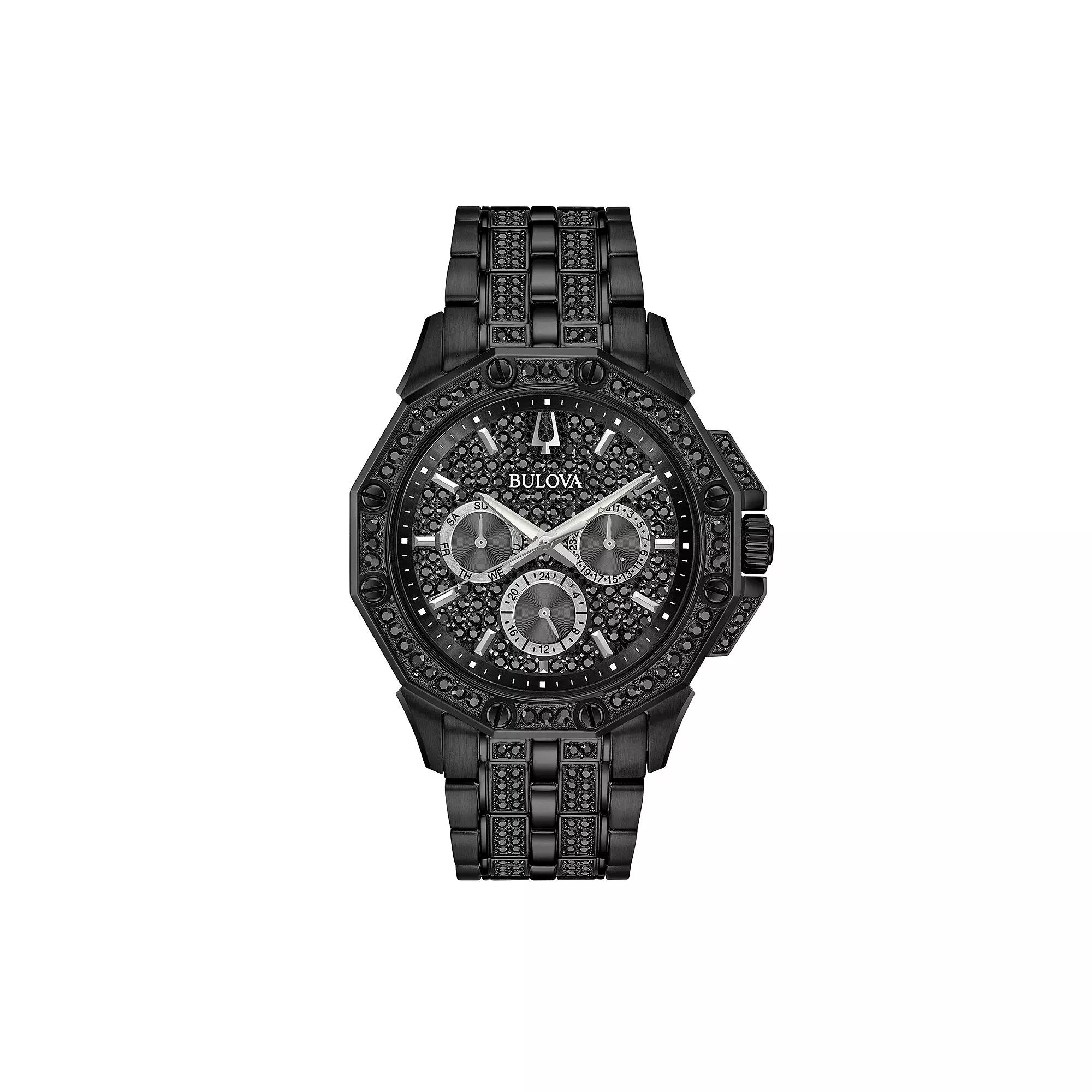 This Mens Bulova Octava crystal accented chrono bracelet watch is a multi-functional dress watch. Its design is boldly embellished with 300 crystals on its black tone stainless steel case and bracelet with a pave set black dial. Water resistance to 30 meters. Case Diameter: 32mm. Limited Manufacturers Warranty.