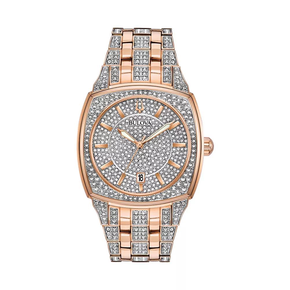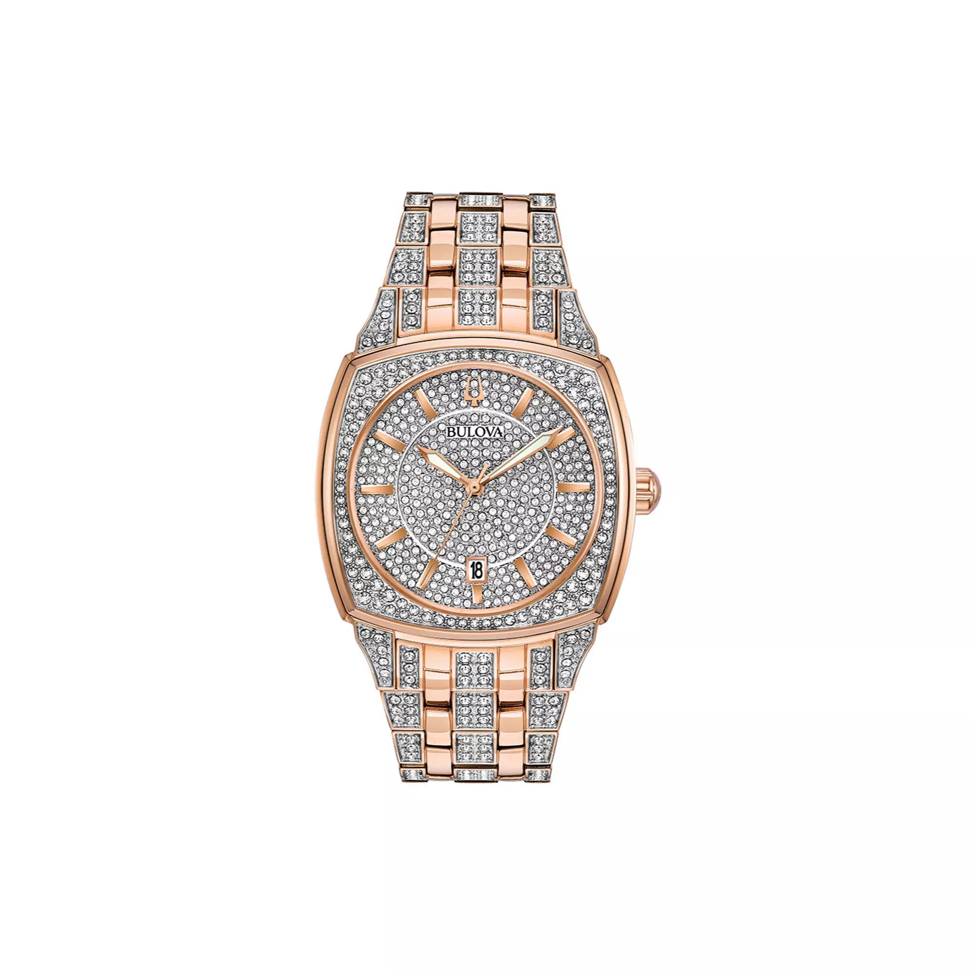 Dress watch opulently embellished with 582 crystals on the cushion-shaped stainless steel and rose gold-tone case and bracelet, and round pave set three-hand silver white dial with date feature. Curved mineral crystal, deployant closure, quartz movement, and water resistance to 30 meters.Number of Batteries: 1Included: 1 Watch(es)Features: AnalogJewelry Closure: Fold Over ClaspPower Source: Battery (included)Watch Movement: QuartzWater Resistance: 30mBand Color: Two ToneDial Color: Mother of PearlCase Thickness: 11.1mmCase Width: 40mmWatch Band Length: 7 InchBand Content: Stainless SteelCase Materials: 100% Stainless SteelBand Width: 20mmCare: Wipe CleanCountry of Origin: Imported