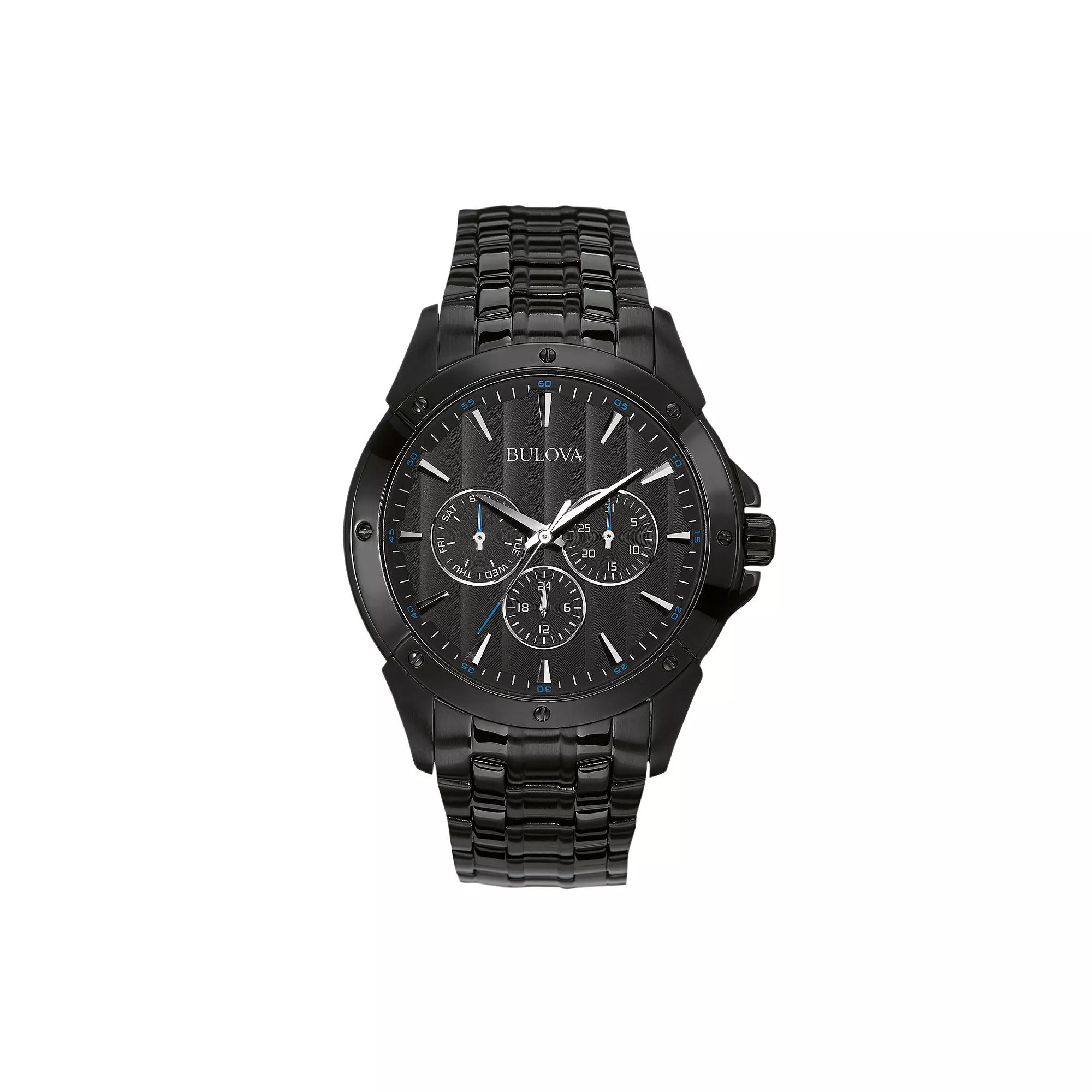 This Mens Bulova multifunction bracelet watch is from the Classic Collection. Its design is in stainless steel with a black ion plated finish, a patterned black dial, day, date, and 24-hour sub-dials, and a screw back case. It is finished with a simple double press fold over clasp with safety lock, and is water resistant to 30 meters.