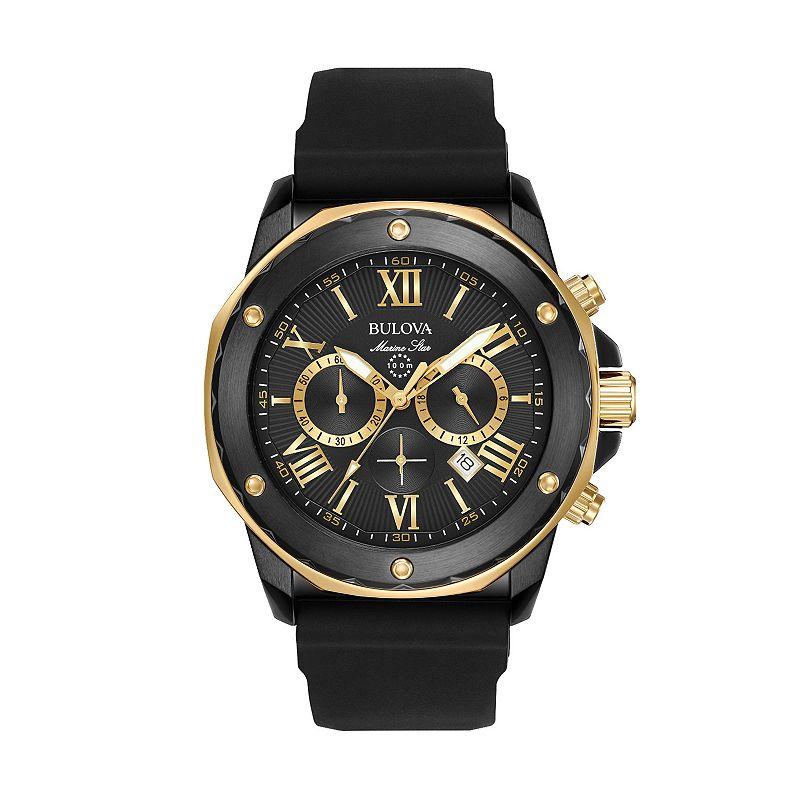 The Mens Bulova Marine Star watch features a gold-tone stainless steel case with a black dial, a six hand chronograph with a calendar, and a screw back case. A black Silicone strap with a simple 3 piece closure, and is water resistance to 100 meters. Dimensions: 44mm. Style 98B278. Limited Manufacturers Warranty.