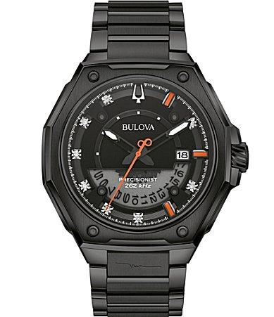 In a bold collaboration with marc Anthony, one of musics most influential artists of all time, Bulova presents the new marc Anthony series x mens diamond dial watch, fusing Bulovas legendary fine watchmaking with marc Anthonys artistic vision and our shared love of music in an exclusive timepiece that represents his taste for luxury and personal style. The signature case design features a black ion-plated stainless steel faceted construction with a blend of polished and brushed finishes, recalling Anthonys dynamic musicality. The striking black diamond-accented dial features a brushed finish and a date display, with a bold orange seconds hand with a smooth sweep, complemented by orange hour markers at 1, 3, and 5 oclock, chosen by marc for their personal significance. With Bulovas signature tuning fork at 12 oclock, the remaining 8 hours are marked by hand-set diamonds, bringing the same nuanced style to the dial that marc Anthony brings to his music. A translucent aperture in the dial offers a peek behind the curtain at the Bulova precisionist movement, a revolutionary 8-jewel quartz mechanism accurate to 5 seconds per month, and increased resistance to temperature changes. Adorning the case back is a unique glass insert with the quote for those who know. The watch is paired perfectly with a black ion-plated stainless-steel bracelet featuring Anthonys signature on the case and a push-button deployant clasp. With 100m water resistance and a curved anti-reflective sapphire crystal, the Bulova marc Anthony series x is a high-performance watch with an elevated design that brings together marc Anthonys music that transcends time with Bulovas bold at heart spirit to keep you always within styles rhythm. Number of Batteries: 1Included: 1 Watch(es)Features: Diamond AccentBattery Type: Lithium IonJewelry Closure: Fold Over ClaspPower Source: Battery (not Included)Watch Movement: QuartzWater Resistance: 100mBand Color: BlackDial Color: BlackMetal Color: BlackCase Width: 48.5mmWatch Band Length: 9 3/4 InchBand Content: Stainless SteelCase Materials: 100% Stainless SteelCare: Wipe CleanCountry of Origin: Imported