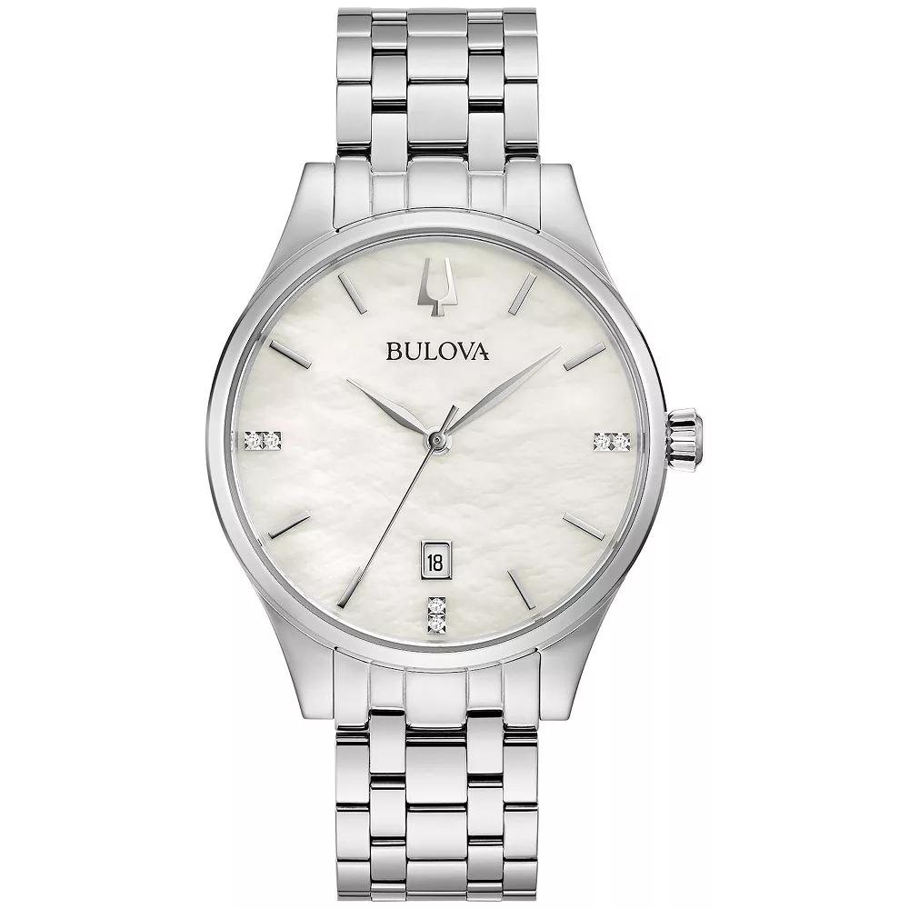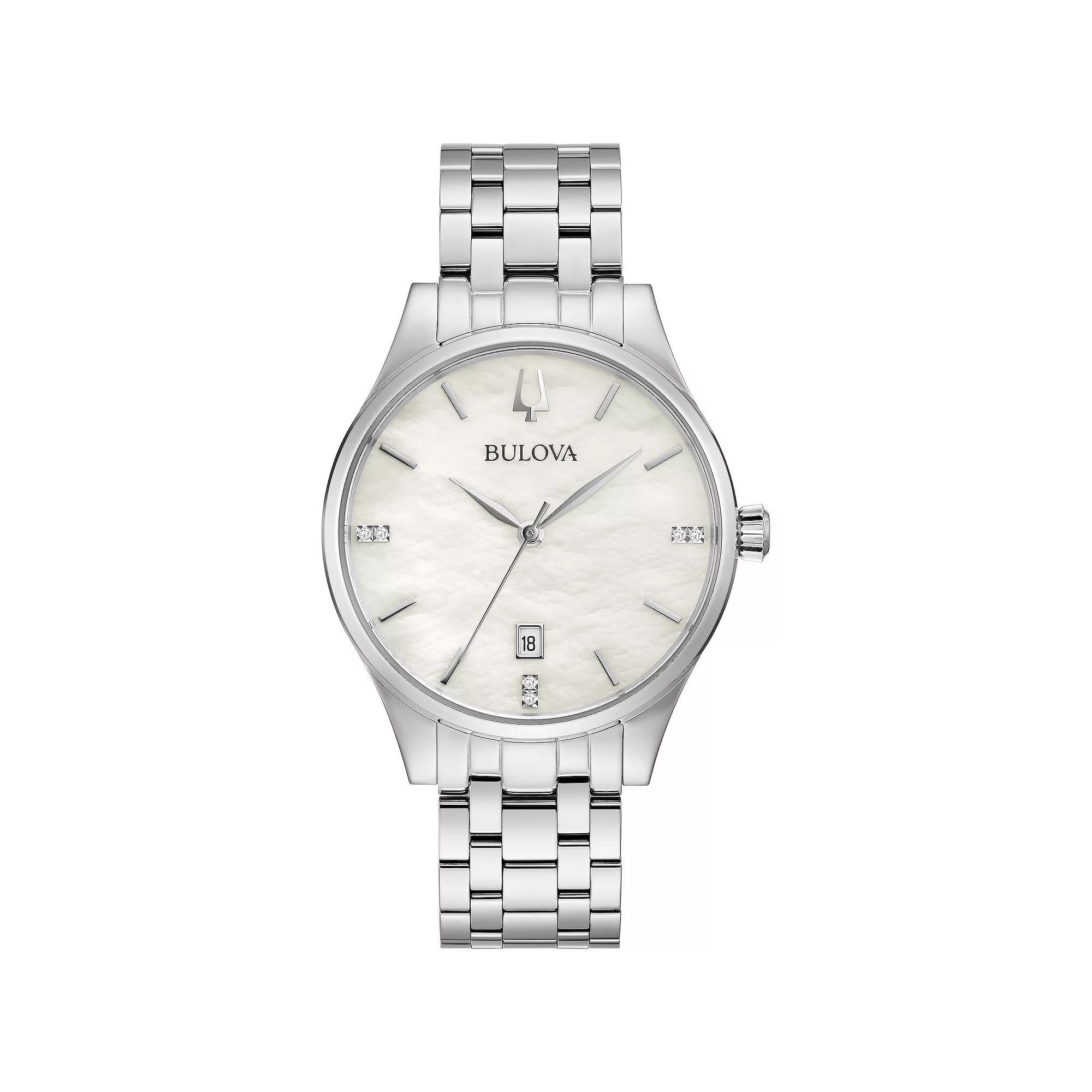 Inspired by Bulova heritage timepieces, this stainless steel watch features a mother-of-pearl dial set with 6 diamonds, the date window at the 6 o’clock position. Inspired by Bulova heritage timepieces, this stainless steel watch features a mother-of-pearl dial set with 6 diamonds, the date window at the 6 o’clock position. FEATURES Date window Diamond accentsDISPLAY Dial color: mother-of-pearl Face cover material: mineral crystalCASE Material: stainless steel Diameter: 36 mmBAND Material: stainless steel Clasp: deployment Circumference: 200 mm (links removable to 140 mm) Width: 16 mmDETAILS Movement: quartz Power: battery Water resistance: 30 meters Packaging: gift boxed Warranty: manufacturer's 3-year limited For warranty information please click here Model no. 96P220 Due to its contents, this product cannot be shipped via our Priority Service or sent to Alaska, Hawaii, P.O. boxes, and/or APO/FPO military addresses. Size: Medium. Color: Silver. Gender: female. Age Group: adult.