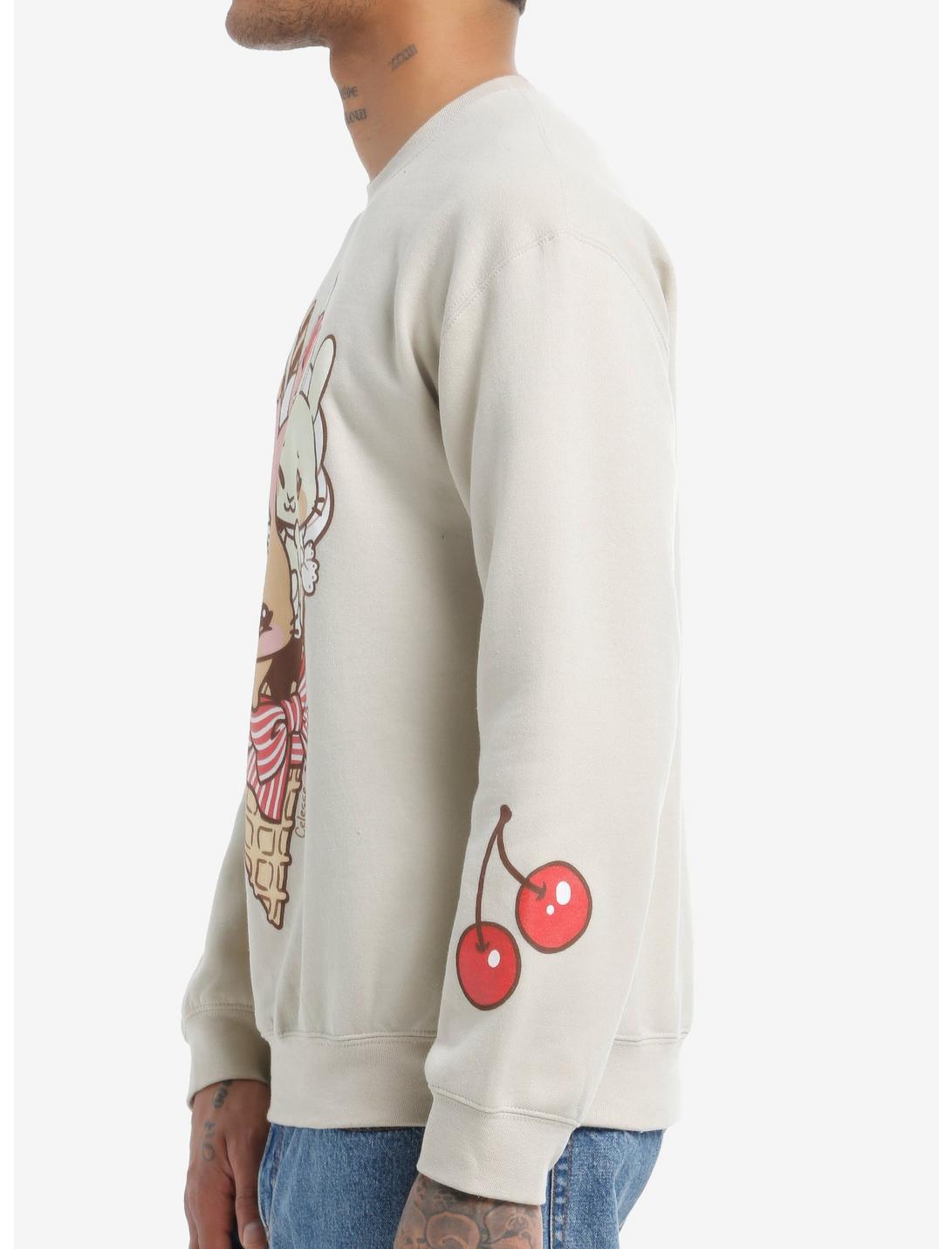 The sweetest scoop you ever did see! This adorable sweatshirt features a neopolitan-inspired trio of bunnies in an ice cream cone, with whipped cream and a cherry on top! Comes with a cherry printed on one sleeve.Officially licensed art by Little Celesse.50% cotton; 50% polyesterWash cold; dry lowImportedListed in men's/unisex sizesModel is 6'1"Model wears size Medium