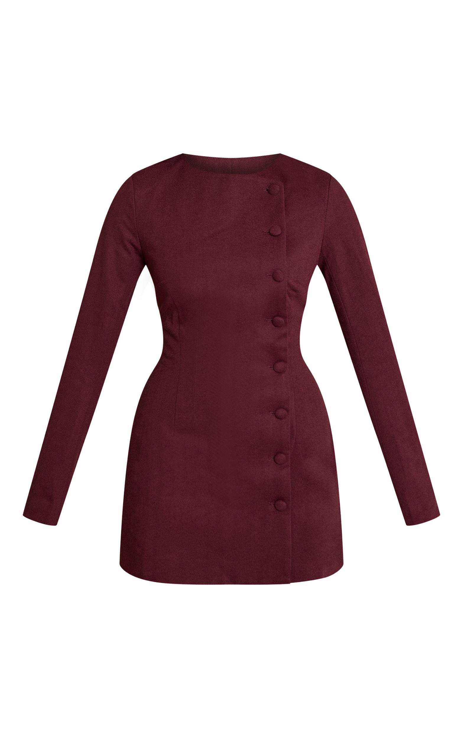 Reimagine your daytime dressing with an artful edge. The burgundy boucle button down blazer dress redefines sophisticated simplicity for day, featuring a clean round neckline and full-length sleeves that flow into a tailored mini silhouette. Its distinctive diagonal button-down front, with elegant tonal buttons extending to a subtle scalloped hem, creates an impactful visual line. Complete this knowing design with sleek kitten heels and delicate gold stud earrings for an understated yet confident statement. A structured black bag finishes the look, securing your status as the effortlessly polished professional.Length approx 81.5cm/32inch (Based on sample size US 4)Model wears size UK 8/ EU 36/ AUS 8/ US 4Model Height - 5ft 7inchp]:!mb-4inch>Brand: PrettyLittleThingCategory: DressesProduct type: Blazer DressColor: BurgundyMaterial: BoucleSleeves: LongOccasion: Day