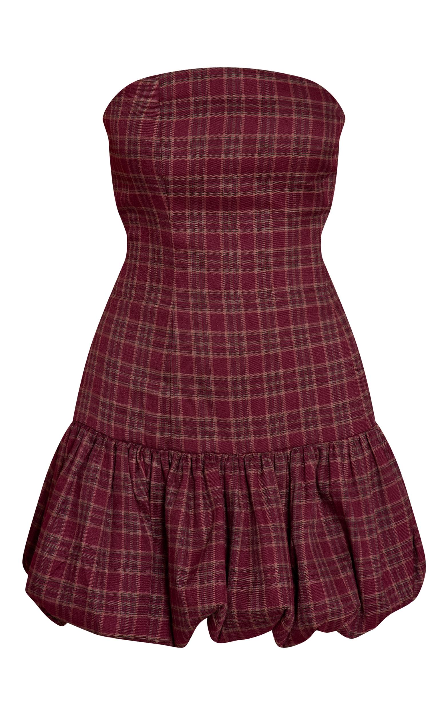 Own the room in a look that marries heritage with high-fashion edge. The burgundy check bandeau puffball dress delivers a confident silhouette with its sharp strapless neckline and a precisely fitted bodice that gives way to a voluminous bubble hem. This striking piece redefines day dressing with an artful twist. Complete the ensemble with sheer tights and sleek black heels, adding a subtle touch of radiance with a simple gold ring for a polished aesthetic that’s undeniably you.Length approx 58.5cm/23inch (Based on sample size US 4)Model wears size UK 8/ EU 36/ AUS 8/ US 4Model Height - 5ft 7inchp]:!mb-4inch>Brand: PrettyLittleThingCategory: DressesProduct type: Shift DressColor: BurgundyMaterial: Tailored WovenOccasion: Day