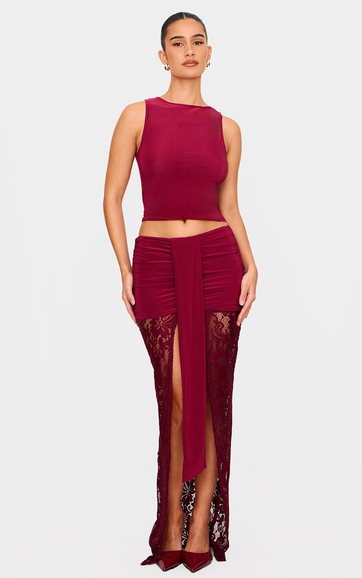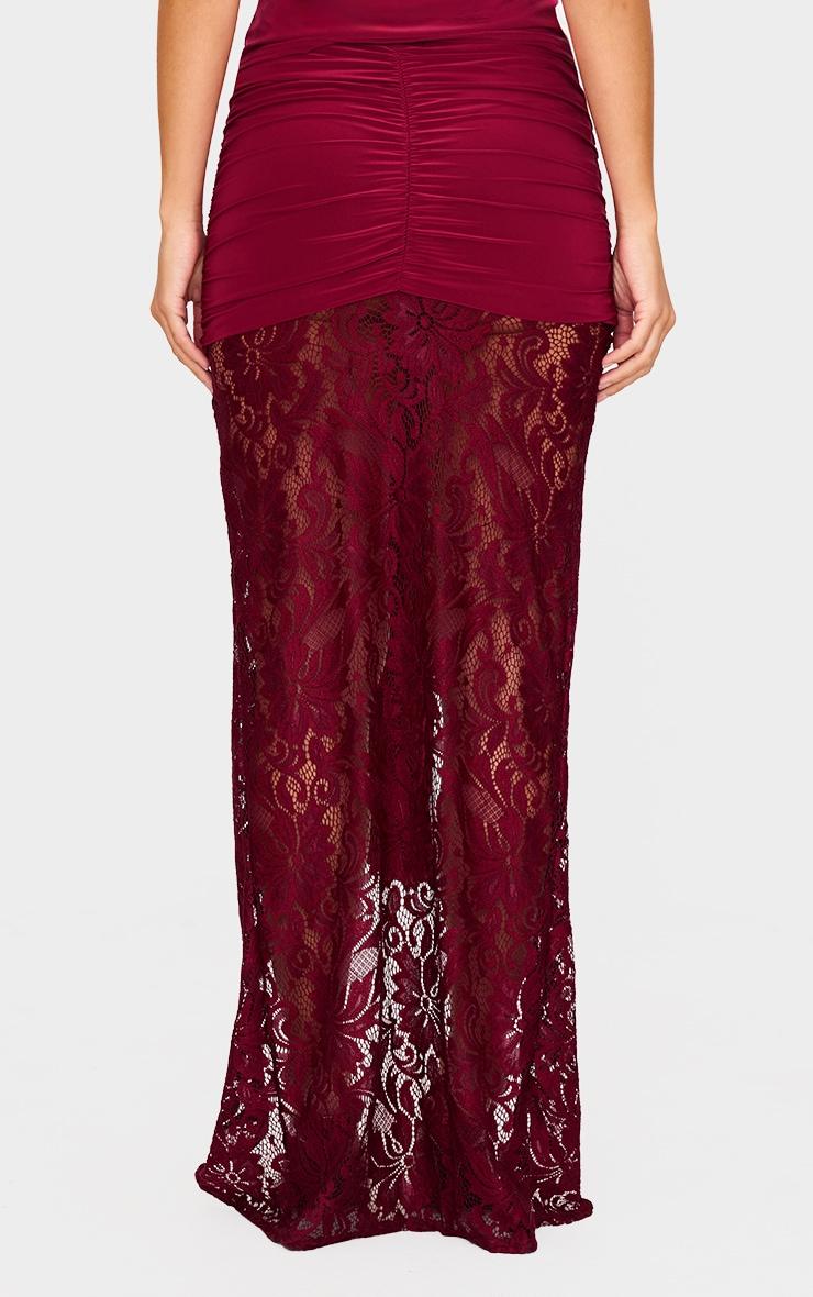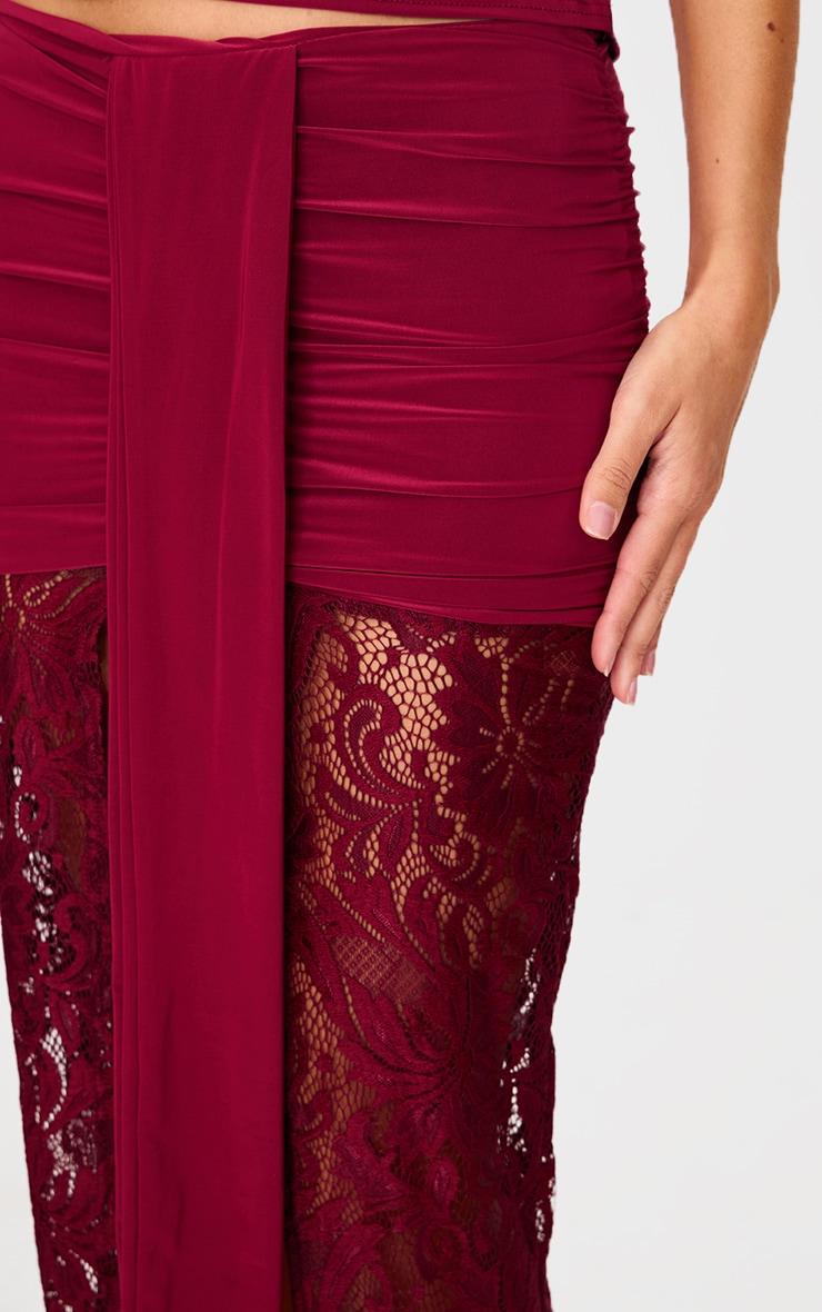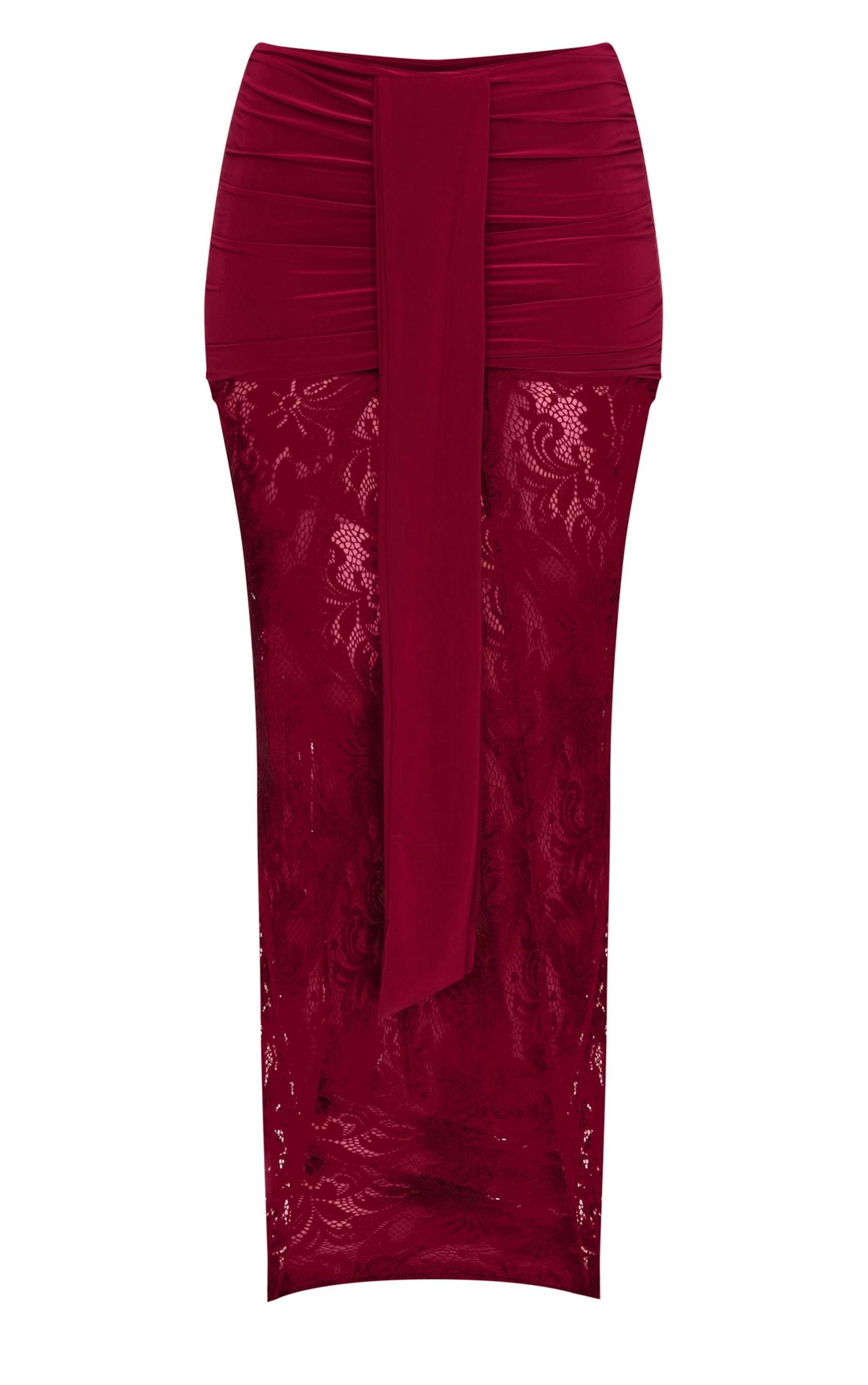 You are guaranteed to earn some serious style points in this burgundy contrast drape detail lace maxi skirt. Made from as burgundy hue lace material with a contrasting drape design and a flattering maxi length, we are obsessed. Style this maxi skirt with a matching hue top and court heels for a look that will turn heads. Length approx 115cm/45inch (Based on a sample size UK 8) Model wears size UK 8/ EU 36/ AUS 8/ US 4Model Height - 5ft 7inchp]:!mb-0inch>Category: BottomsProduct type: Maxi SkirtColor: BurgundyMaterial: Woven LaceOccasion: Evening