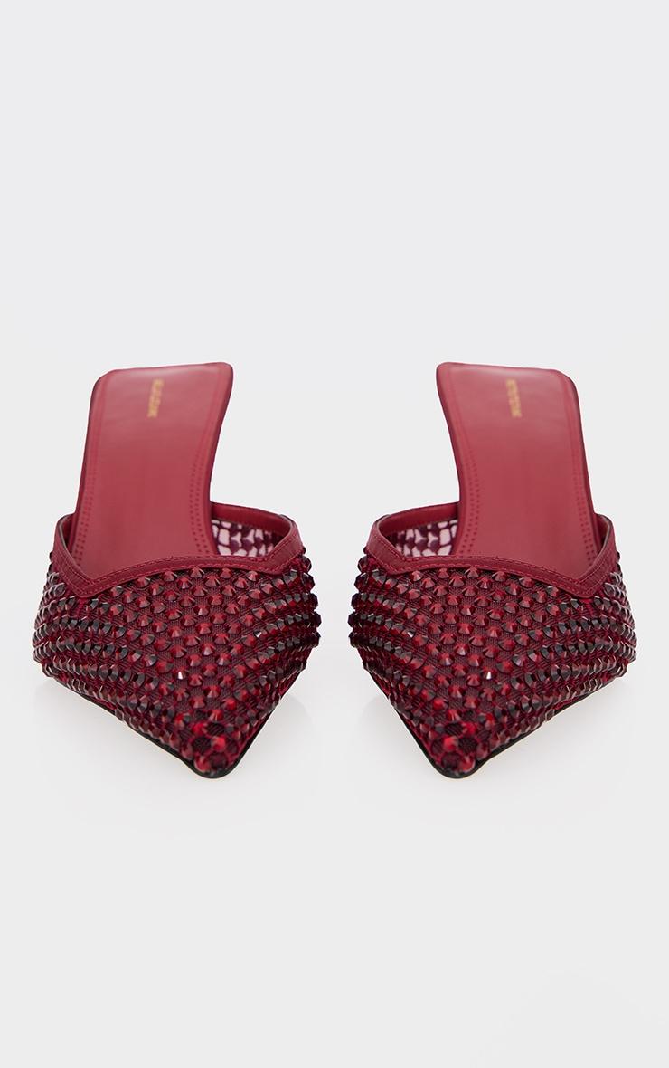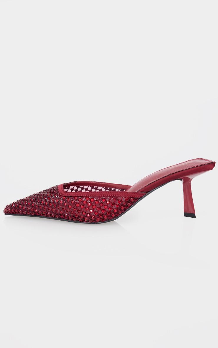 These burgundy diamante mesh point toe mid stiletto heeled mules are at the top of our new season hit list. Made from a burgundy mesh material with a point toe design and diamante detailing, how can you resist? Style these heeled mules with your weekend outfit for a statement finishing touch to any look. Slip-on 3inch Heelp]:!mb-0inch>Category: FootwearProduct type: Heeled MulesColor: BurgundyOccasion: Evening
