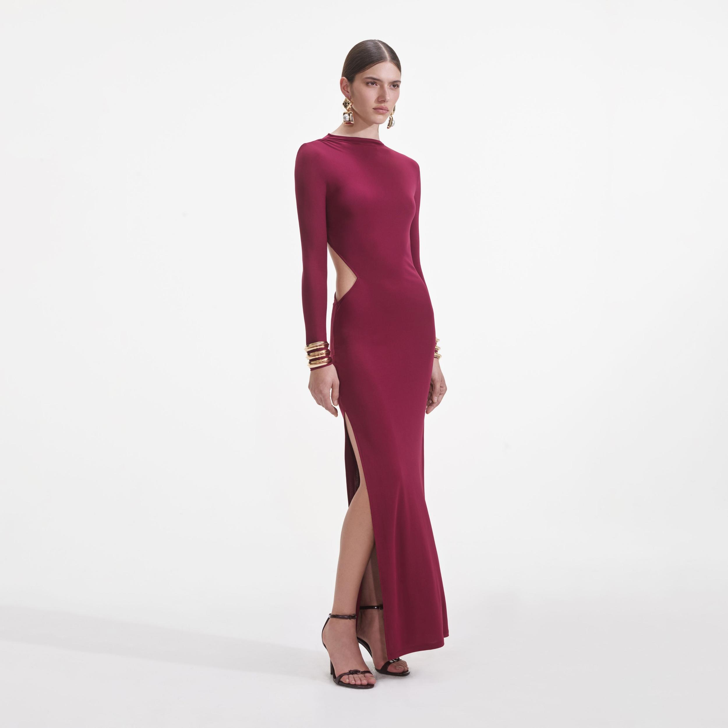 Cut from burgundy jersey for soft sensuality, this dress' body-hugging fit and waist cut-outs make a strong case for minimalist party style. Style with our statement earrings and a chic up-do.True to sizeFabric has stretchMesh liningCut-outs at sideAsymmetric open backModel is 5ft10/178cm and wears a size UK 8