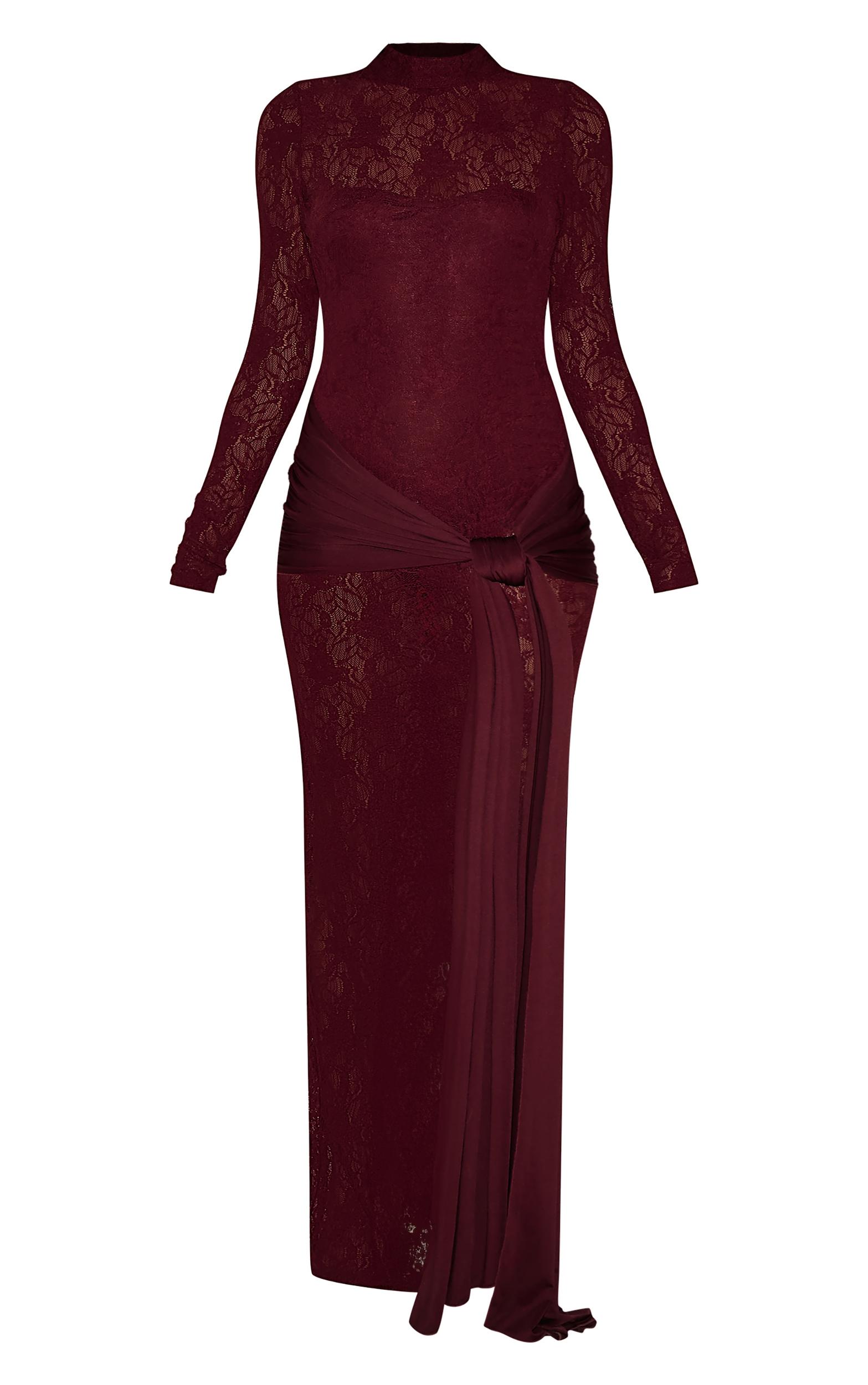 Make heads turn for all the right reasons int his burgundy long sleeve lace wrap detail maxi dress. Brought to you in a burgundy hue lace material with long sleeves, a wrap design and a figure-worshipping maxi fit, how can you not all in love? Style this maxi dress with your highest heels and accessories for a look that will really make a statement.Length approx 155cm/61inch (Based on sample size US 4)Model wears size UK 8/ EU 36/ AUS 8/ US 4Model Height - 5ft 9inchp]:!mb-4inch>Brand: PrettyLittleThingCategory: DressesProduct type: Bodycon DressColor: BurgundyMaterial: Stretch LaceDesign: PlainNeckline: High NeckSleeves: LongOccasion: Evening