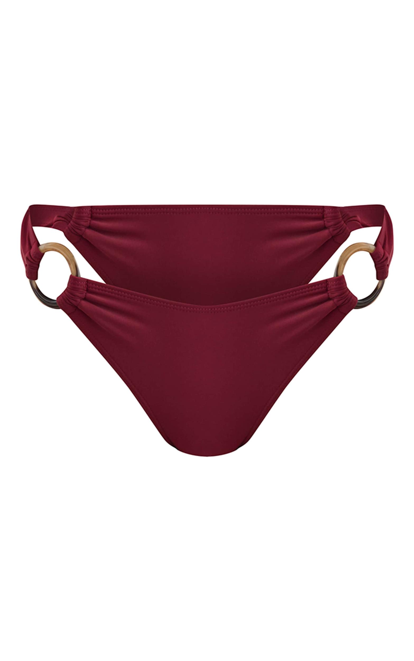 Meet your new must-have with these burgundy o ring ruched high leg bikini bottoms. Brought to you in a classic silhouette, this piece features flattering ruching and a unique O-ring embellishment. Add the matching top and your favorite jewelry for a seasonal look we're loving. Length approx 29cm/11.5inch (Based on sample size US 4)Model wears size UK 8/ EU 36/ AUS 8/ US 4Model Height - 5ft 9inchp]:!mb-4inch>Brand: PrettyLittleThingCategory: SwimwearProduct type: High Leg Bikini BottomColor: BurgundyMaterial: SwimDesign: Plain