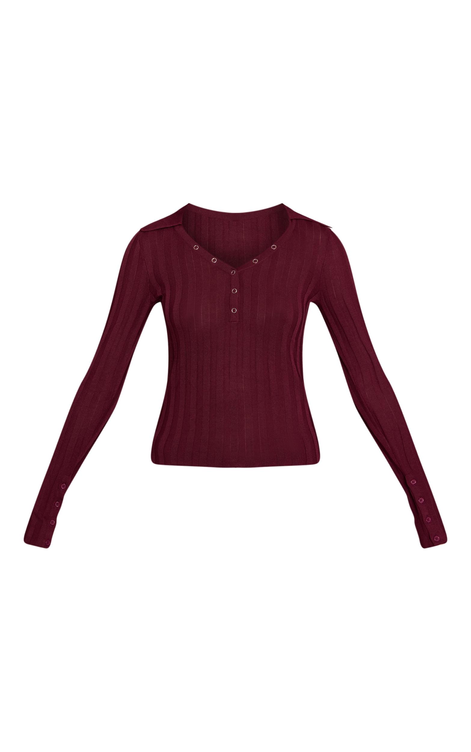 Keep it cosy in the burgundy ribbed sheer knit polo top. Crafted from burgundy hue knit material, this top has a sheer finish, polo neckline and long sleeves. Wear it with dark relaxed fit jeans and sneakers or ballet flats for a classic daytime look.Length approx 48.5cm/19inch (Based on sample size S)Model wears size SModel Height - 5ft 7inchp]:!mb-4inch>Brand: PrettyLittleThingCategory: KnitwearProduct type: T-ShirtColor: BurgundyMaterial: Sheer KnitOccasion: Day
