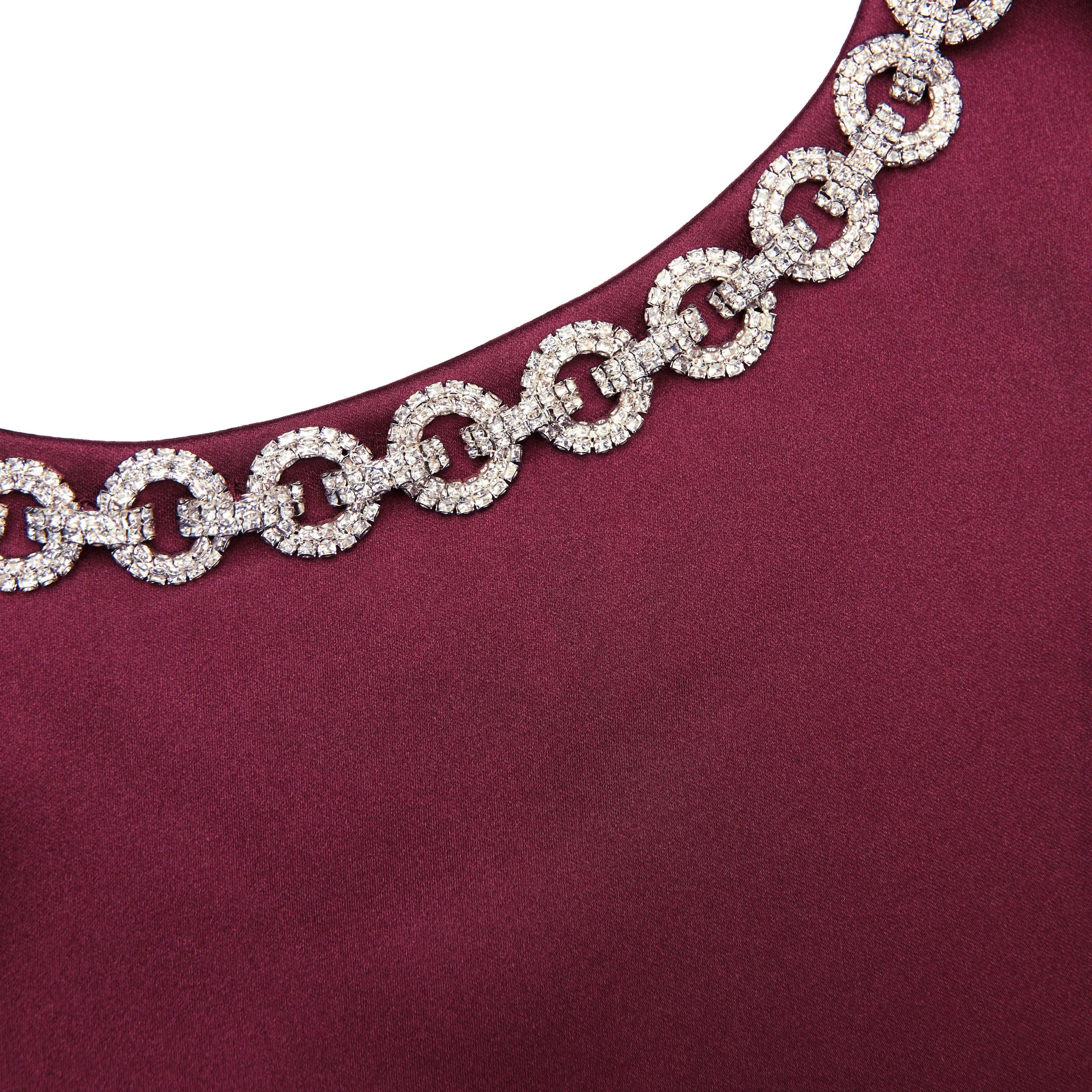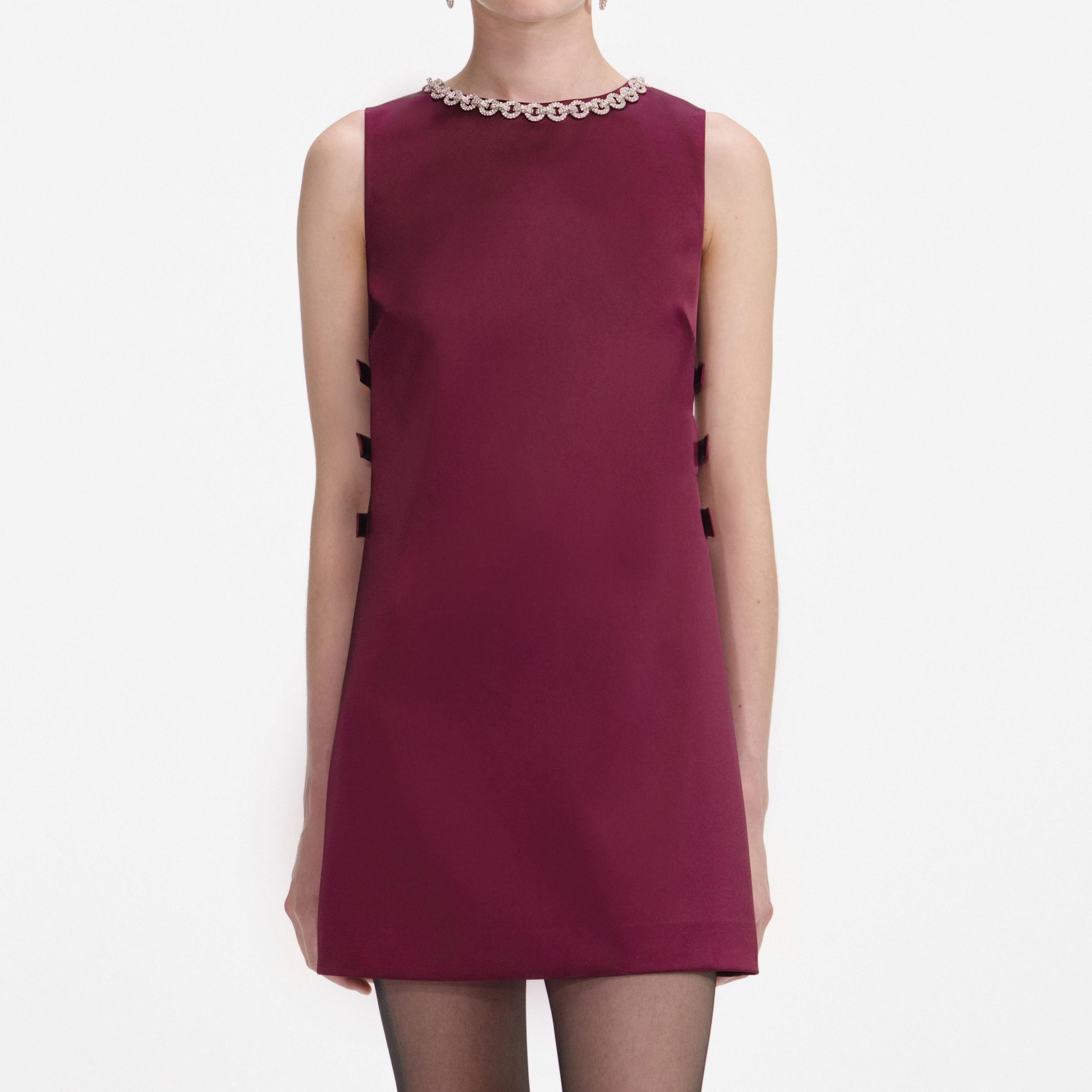 Revel in the rich texture of burgundy satin in this Mod-inspired mini dress. Bow motifs add extra charm and spotlight the daring side cut-outs. Style its shift silhouette with flats and heels alike.True to sizeRelaxed fitZip closure at sideCut-outs at sideCrystal chain trim at neckModel is 5ft10/178cm and wears a size UK 6