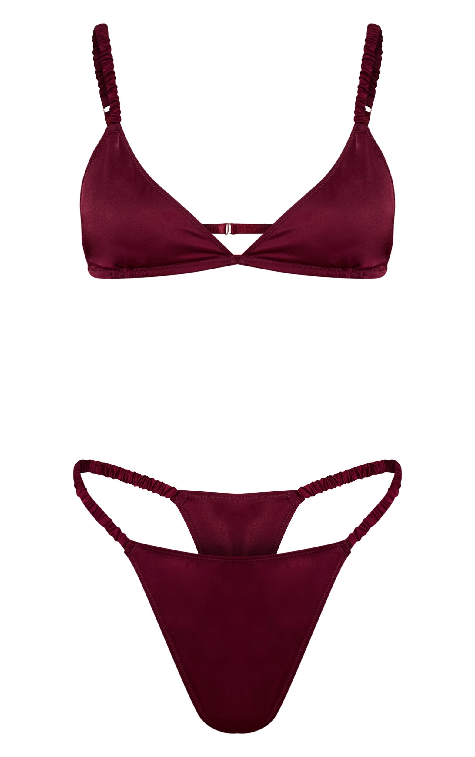 Define your essentials with this burgundy satin triangle bralet and thong set. Its sleek triangle bralet features slender ruched straps, complemented by the coordinating thong. This confident duo creates a seamless base for daily style. Layer it as an effortless base to build any look. Top length approx 29cm/11.5inch Bottoms length approx 29cm/11.5inch (Based on sample size S)Model wears size SModel Height - 5ft 9inchp]:!mb-4inch>Brand: PrettyLittleThingCategory: Lingerie & NightwearProduct type: 2 PieceColor: BurgundyMaterial: SatinOccasion: Day