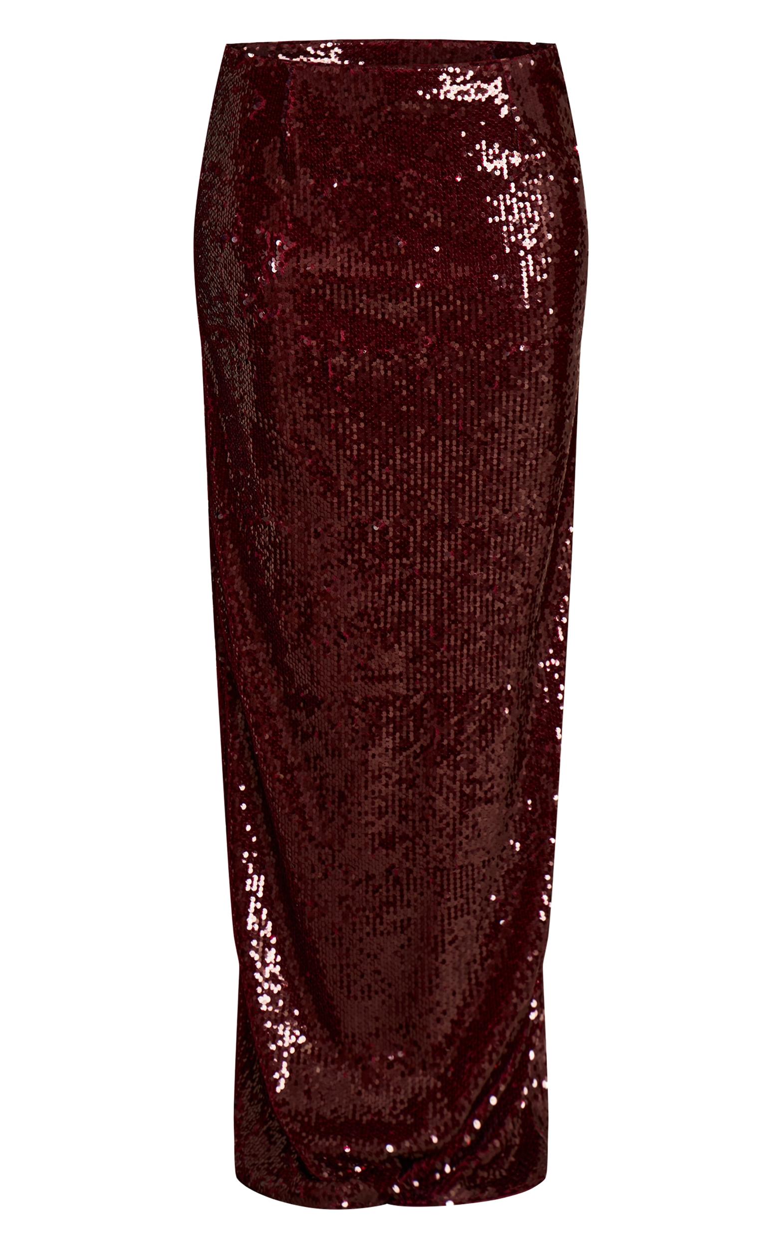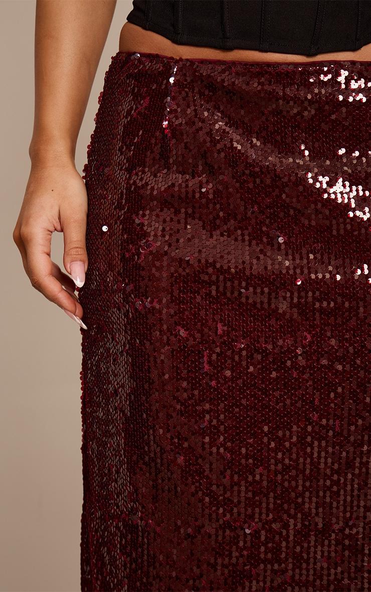 Redefine night out dressing with the burgundy sequin maxi skirt. It features an all-over sequin embellishment and a sleek maxi silhouette. This piece is perfect for those memorable evening events or special occasions. Style with a sharp black corset, statement black heels, and a chic clutch bag to complete the look.Length approx 108cm/42.5inch (Based on sample size US 4)Model wears size UK 8/ EU 36/ AUS 8/ US 4Model Height - 5ft 8inchp]:!mb-4inch>Brand: PrettyLittleThingCategory: BottomsProduct type: Maxi SkirtColor: BurgundyMaterial: SequinOccasion: Evening