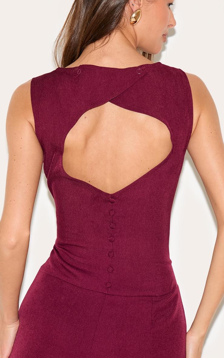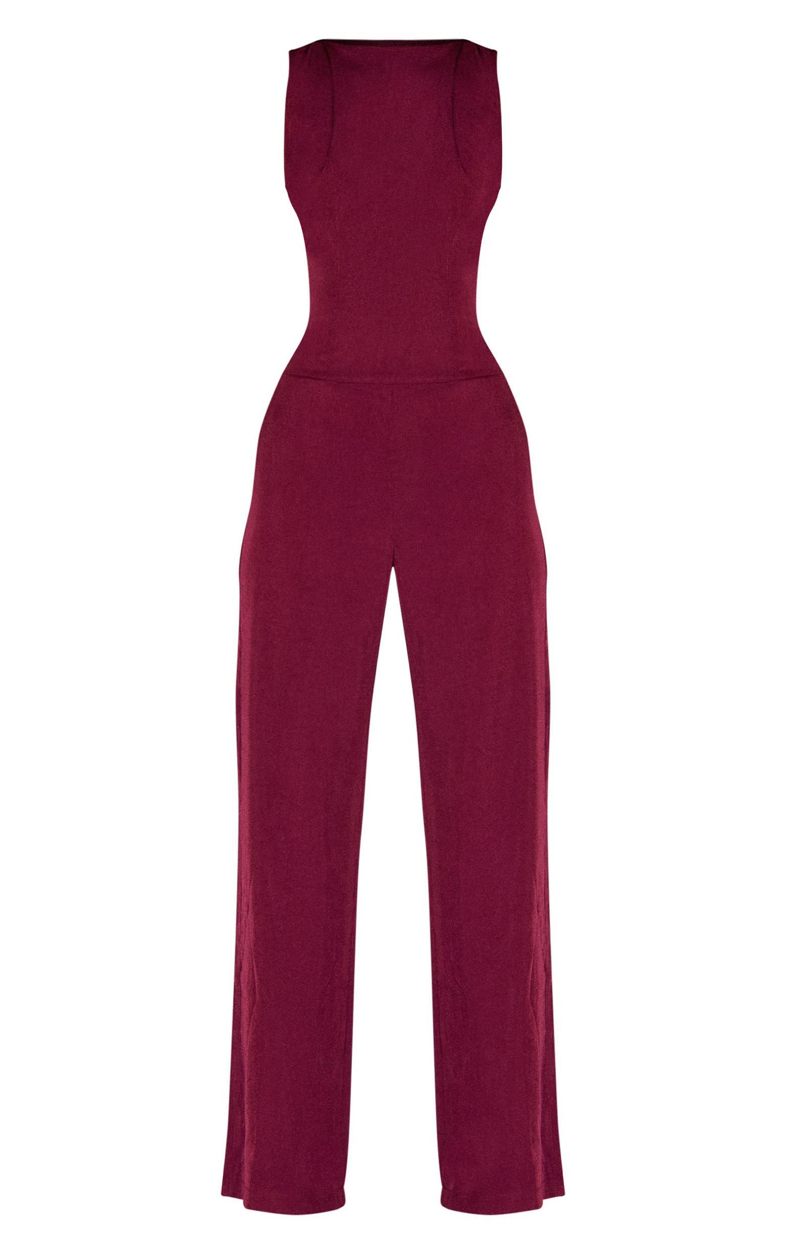 Refine your after-dark repertoire with this burgundy jumpsuit. The structured woven fabric offers a clean silhouette, while the open back introduces an element of considered design. Cut with a straight leg, this piece delivers a contemporary take on evening dressing. The rich burgundy hue provides a sophisticated foundation for your look. Style it with delicate gold jewelry from our accessories collection to further elevate the ensemble.Length approx 155cm/61inch (Based on sample size US 4)Model wears size UK 8/ EU 36/ AUS 8/ US 4Model Height - 5ft 6inchp]:!mb-4inch>Brand: PrettyLittleThingCategory: DressesProduct type: Tailored JumpsuitColor: BurgundyMaterial: Woven CrepeDesign: PlainNeckline: CrewSleeves: SleevelessOccasion: Evening