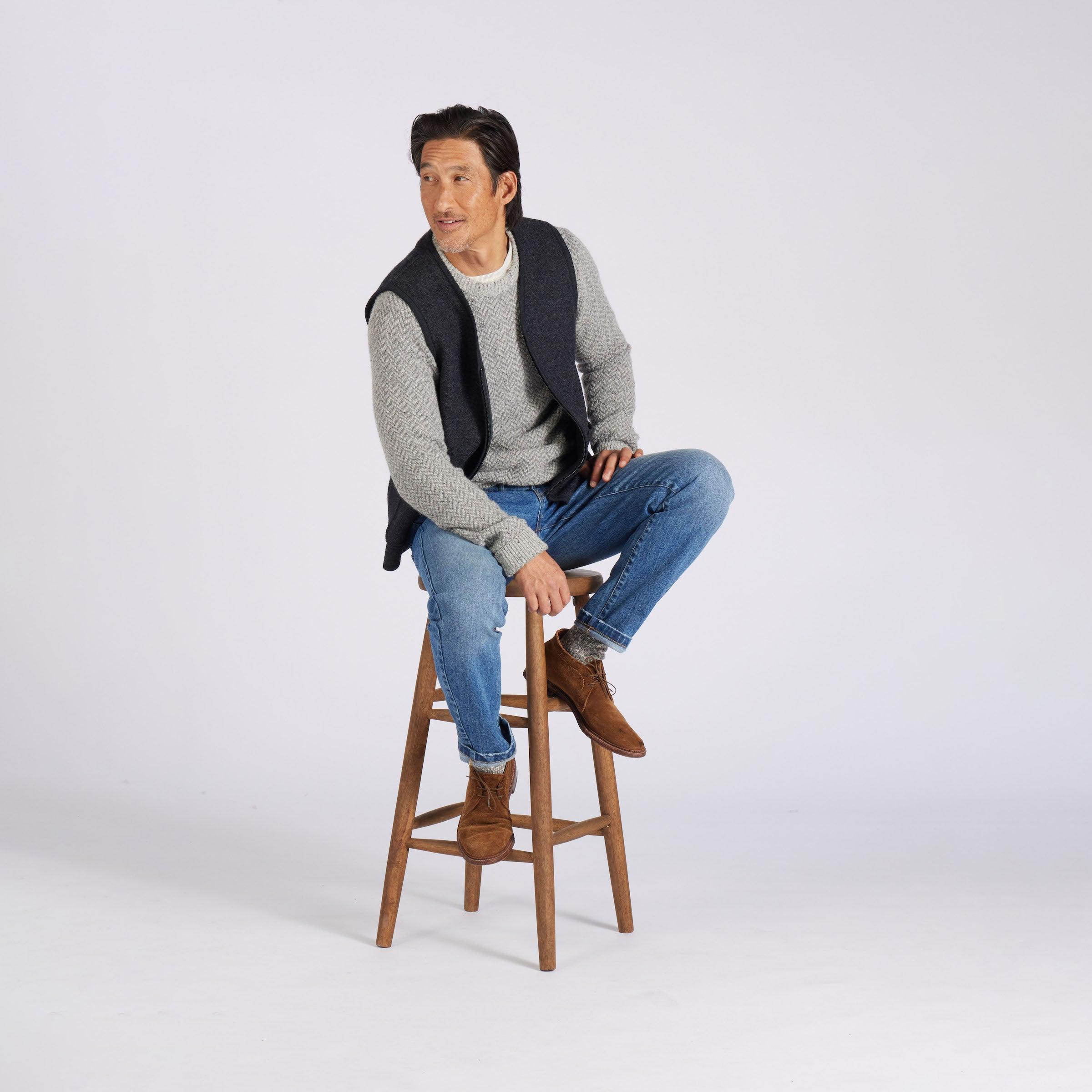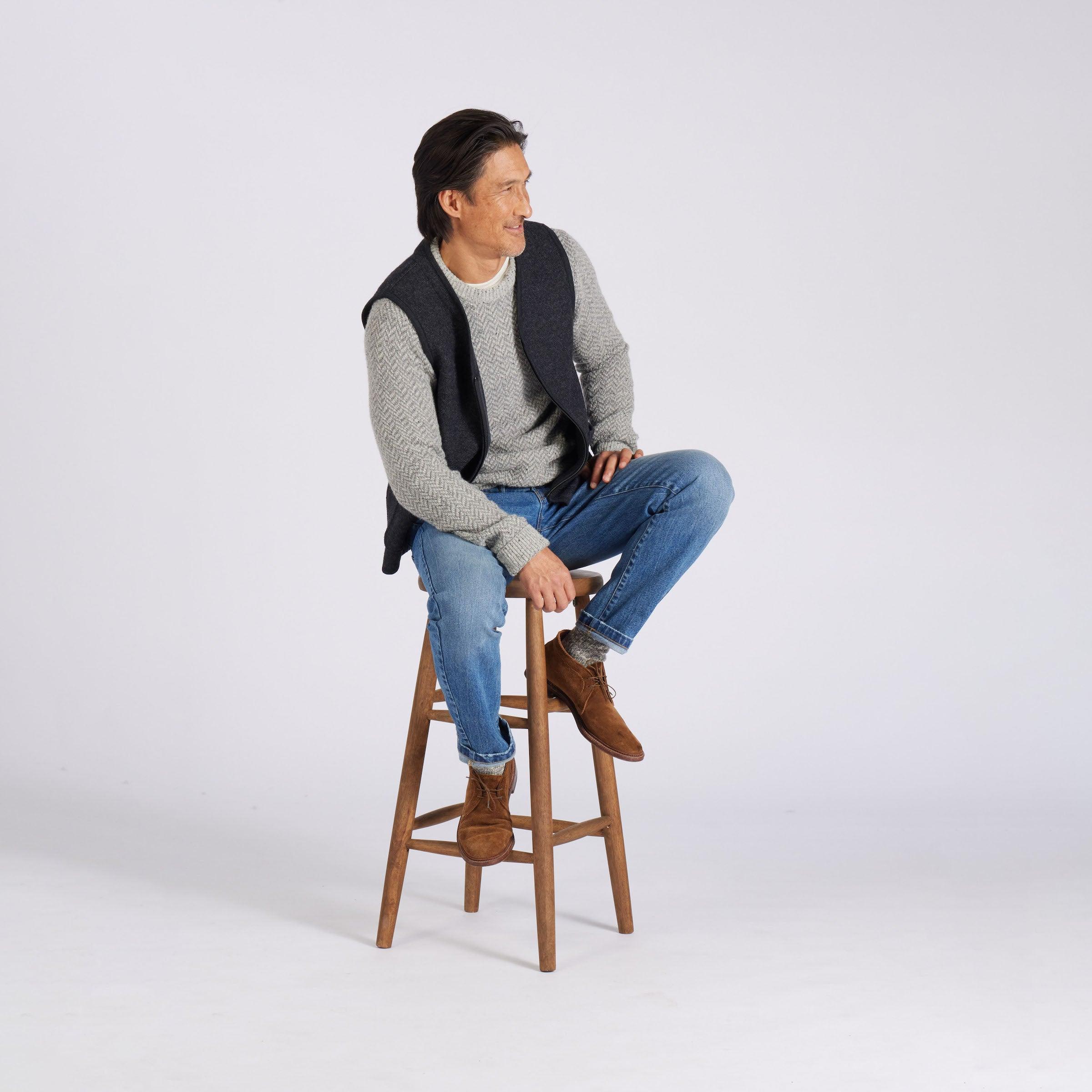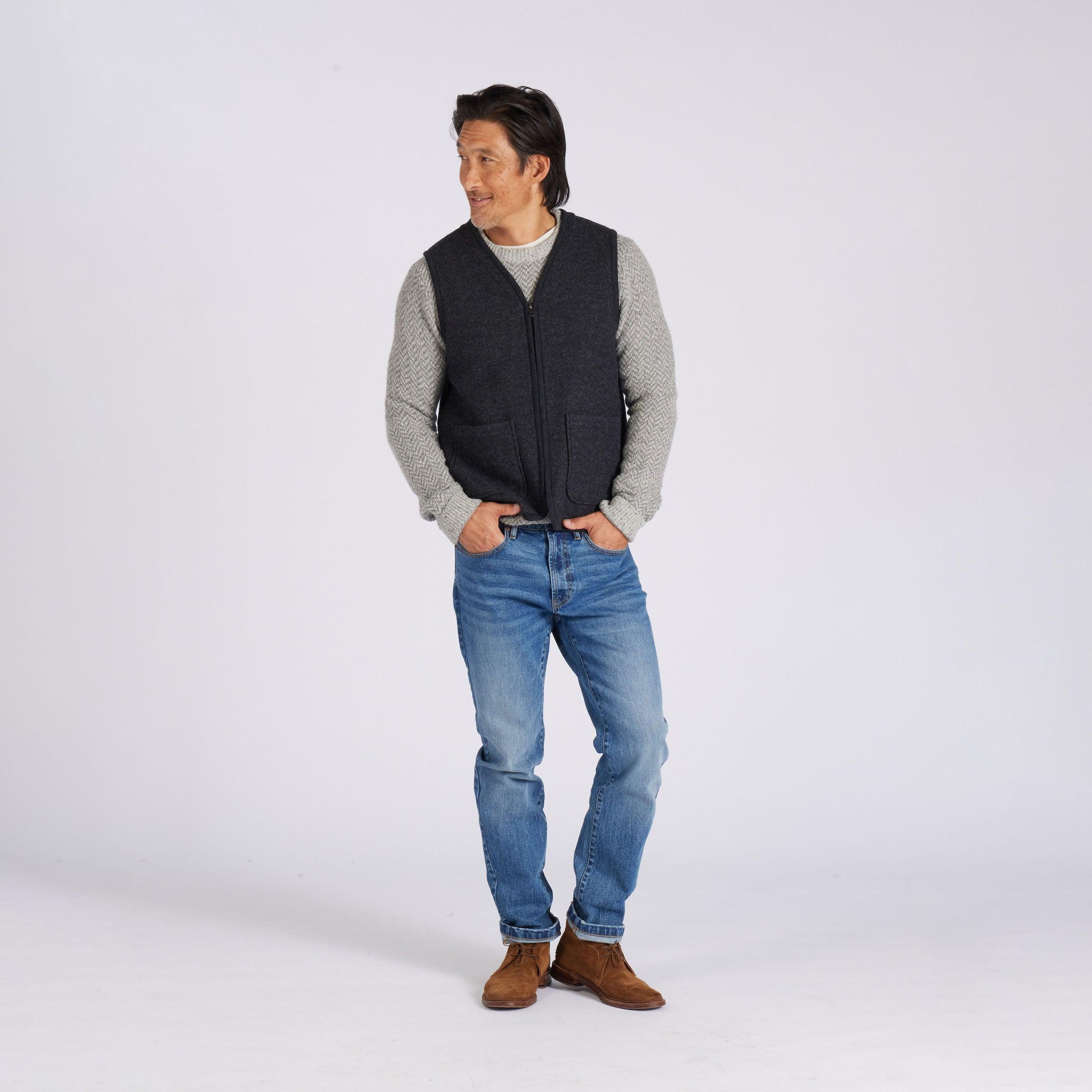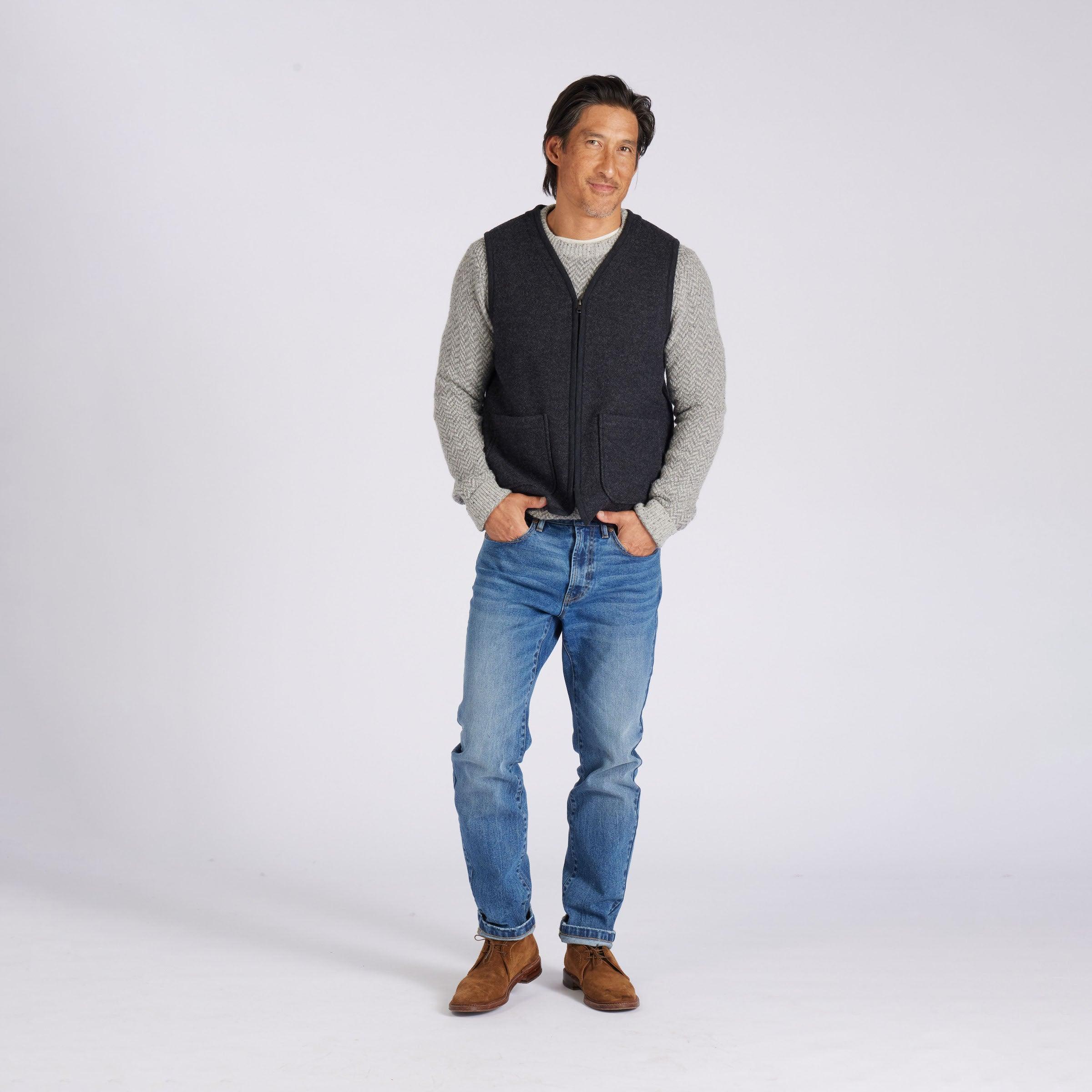 Patterned on the suspiciously beautiful wool vests of old, the Burnham knitted wool vest is designed to be seen, but can still lie flat under a heavier layer. It features a collarless v-neck closure and hidden zip front closure that makes for an exceptionally attractive sweater or shell, but also ensures that it won’t be cumbersome when you find yourself throwing it under your Retro Wool Jacket to shovel snow... in Duluth... in the middle of April. Even if you have no plans to travel to the great northern wastes any time soon, the Burnham’s boiled wool construction guarantees that you’ll go about your business protected by a layer that’s durable, wind-proof, and exceptionally warm. The Model is also wearing: Zermatt Herringbone Crew - Gray Herringbone and Edward Stretch Straight Fit Denim - Vintage Wash. Model: Adrian is wearing size medium and is 6'. ----Details---- Boiled wool All around tonal rib piping Hidden zipper placket YKK zipper Two patch pockets Imported ----Materials---- 98% Wool 2% Nylon ----Size & Fit---- Measuring Method: All measurements are in inches and based on a “flat” garment, as shown below. For comparison with one of your existing garments, please lay garment on a flat surface and follow the key measurement points. For chest and neck, if you double the flat measurement, you will get close to the full body measurement. ----Care---- Dry Clean Only