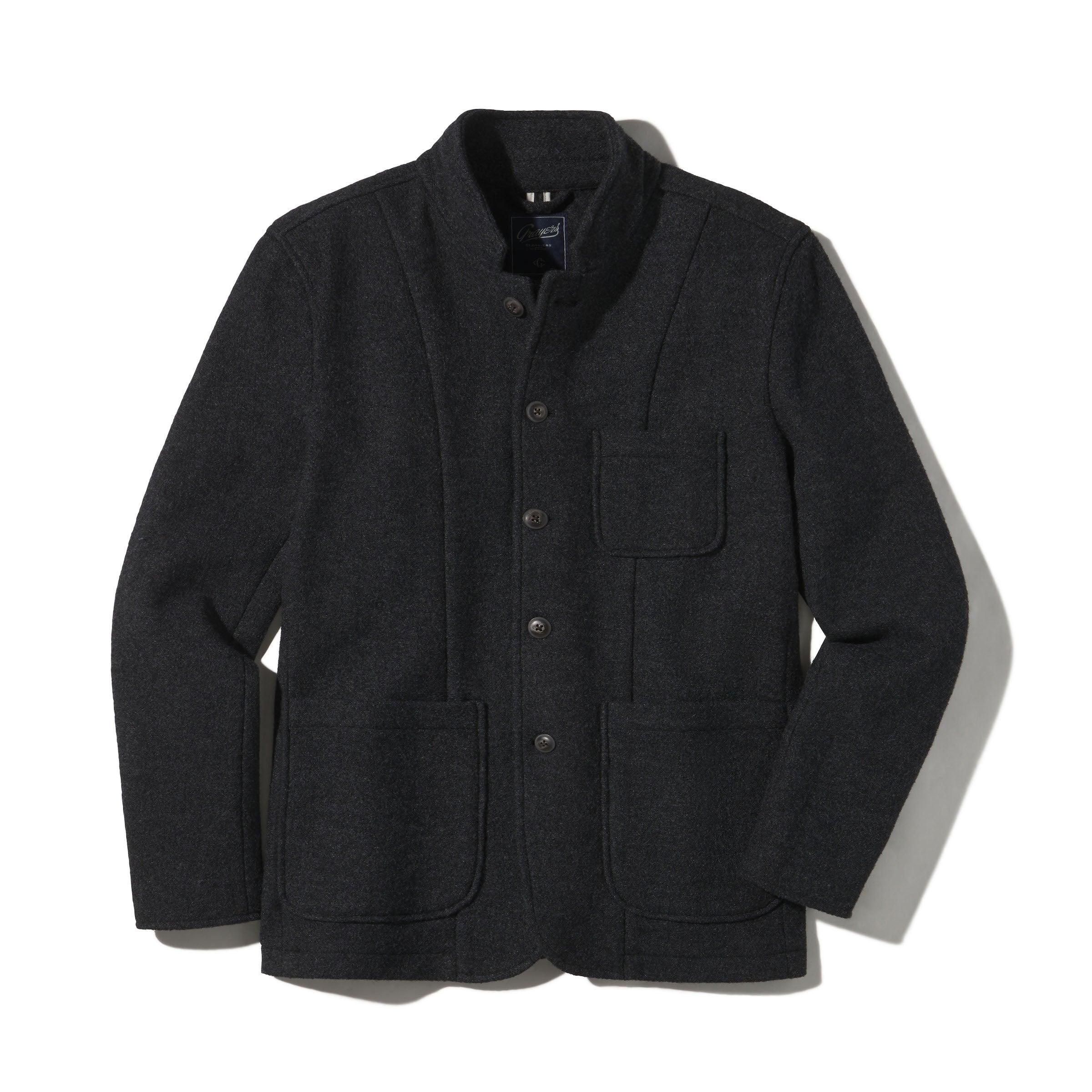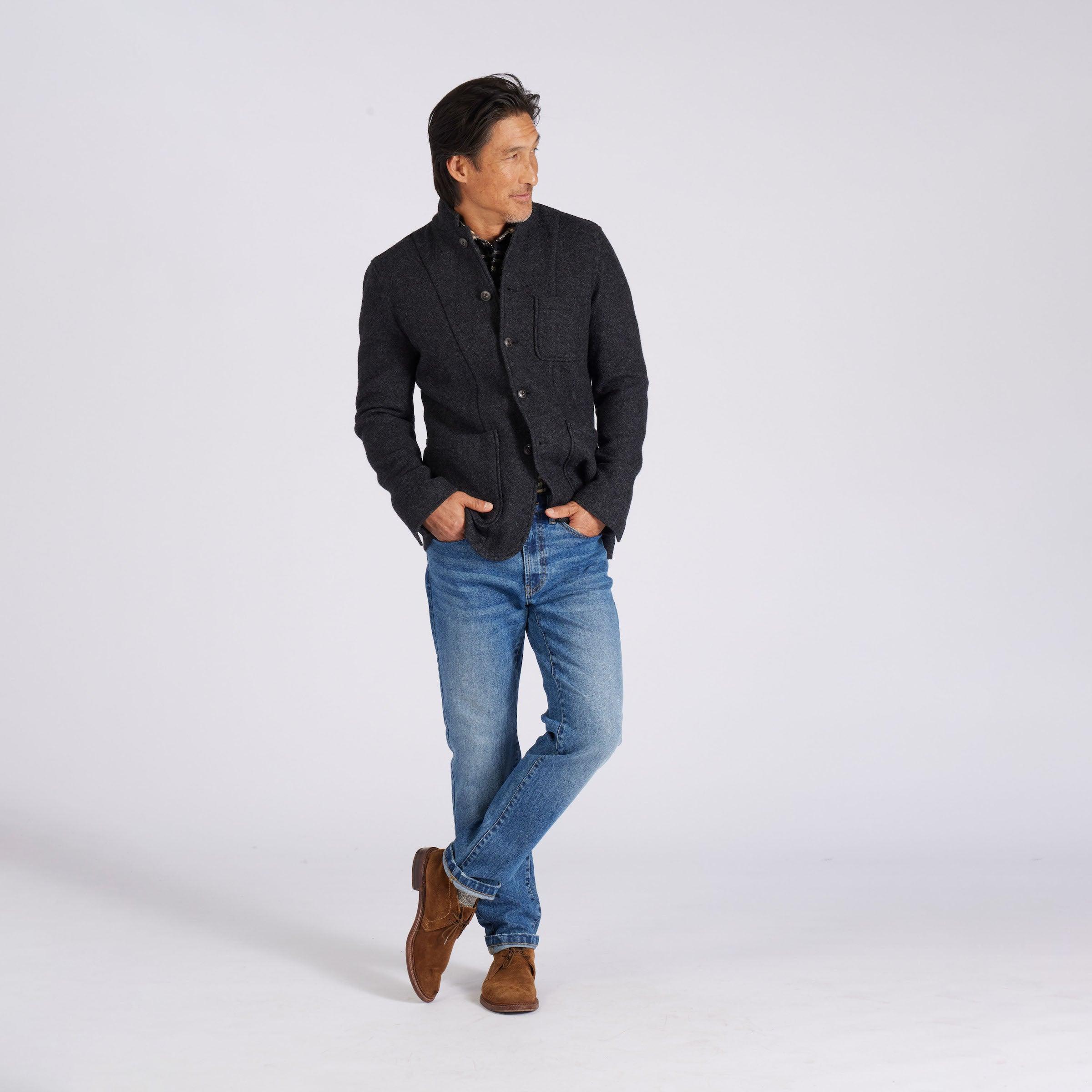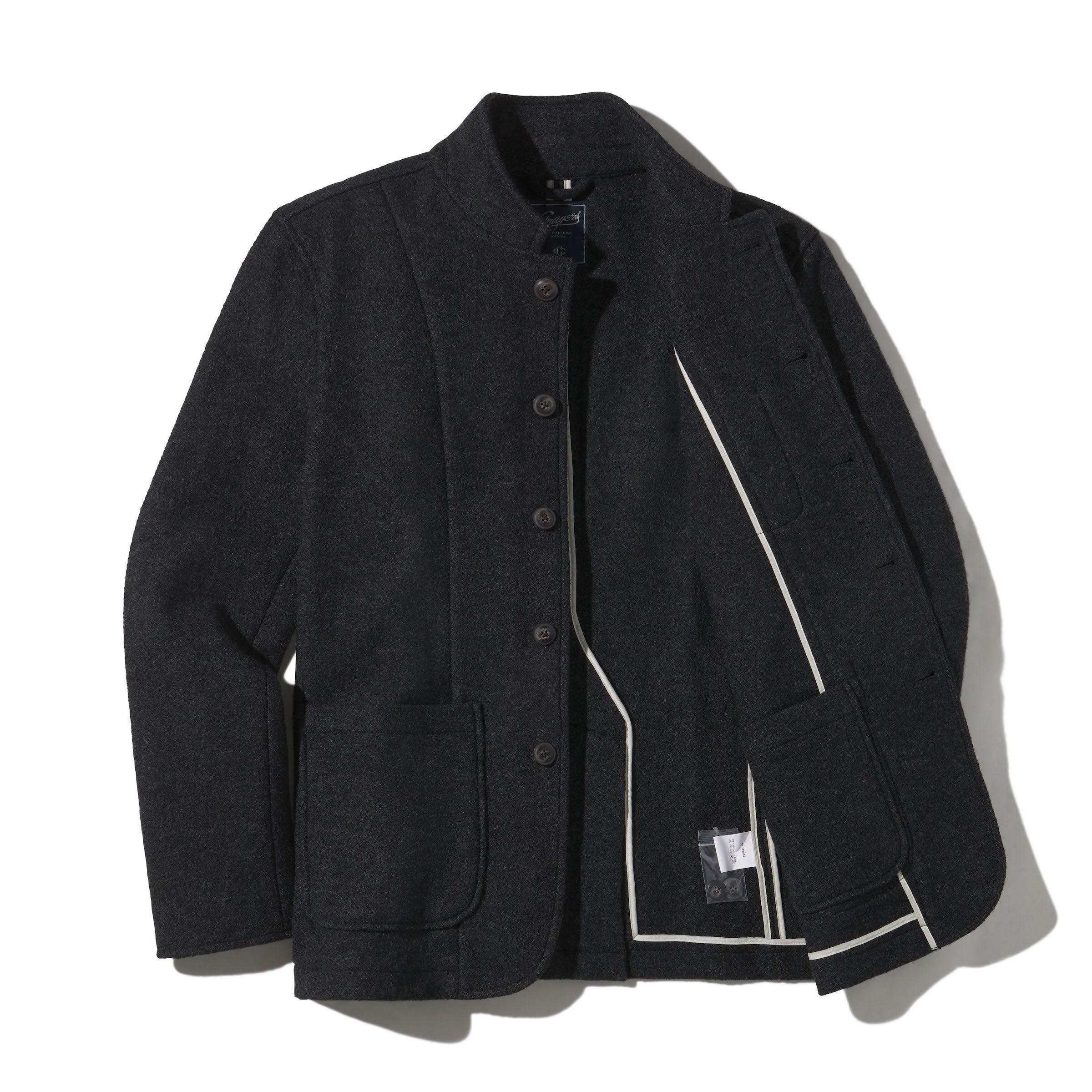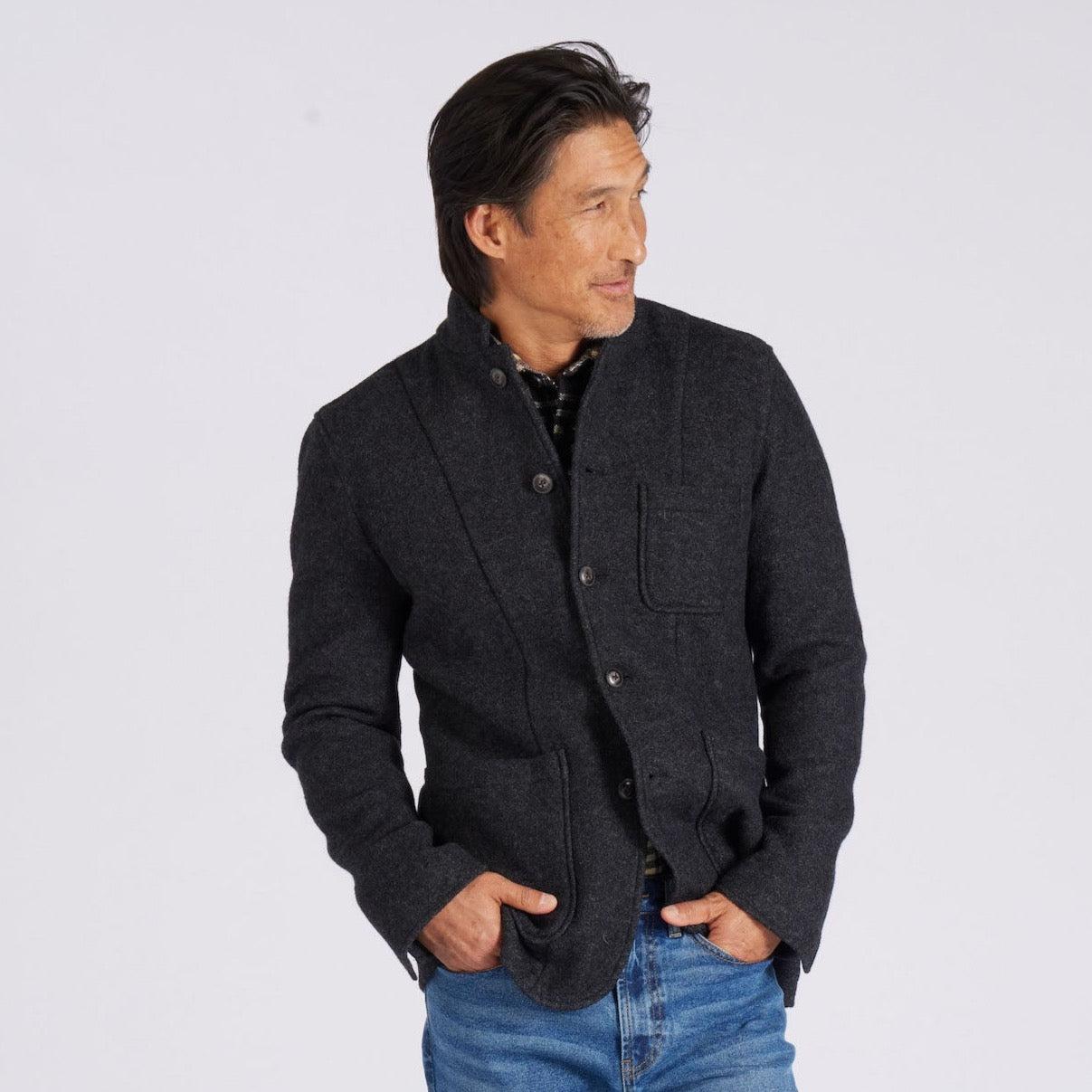 The grand blazer of the season's collection, made from boiled wool, for durability and warmth, the Burnham offers refined protection, perfect for snowball fight weather, slinging drinks downtown and the best holiday hoohahs. Recently, it found its way on the back of Lalo Salamanca, bad boy with style of Better Call Saul. The Model is also wearing: Herringbone Heritage Flannel - Black Cream and Edward Stretch Straight Fit Denim - Vintage Wash. Model: Adrian is wearing size medium and is 6'. ----Details---- Stand up collar Two large patch pockets Single chest pocket Button through cuffs Piped internal seams 98% Wool/ 2% Nylon Imported ----Materials---- 98% Wool 2% Nylon Knit as a sweater and boiled into a felt like material ----Size & Fit---- Measuring Method: All measurements are in inches and based on a “flat” garment, as shown below. For comparison with one of your existing garments, please lay garment on a flat surface and follow the key measurement points. For chest and neck, if you double the flat measurement, you will get close to the full body measurement. Tailored Fit ----Care---- Dry Clean Only