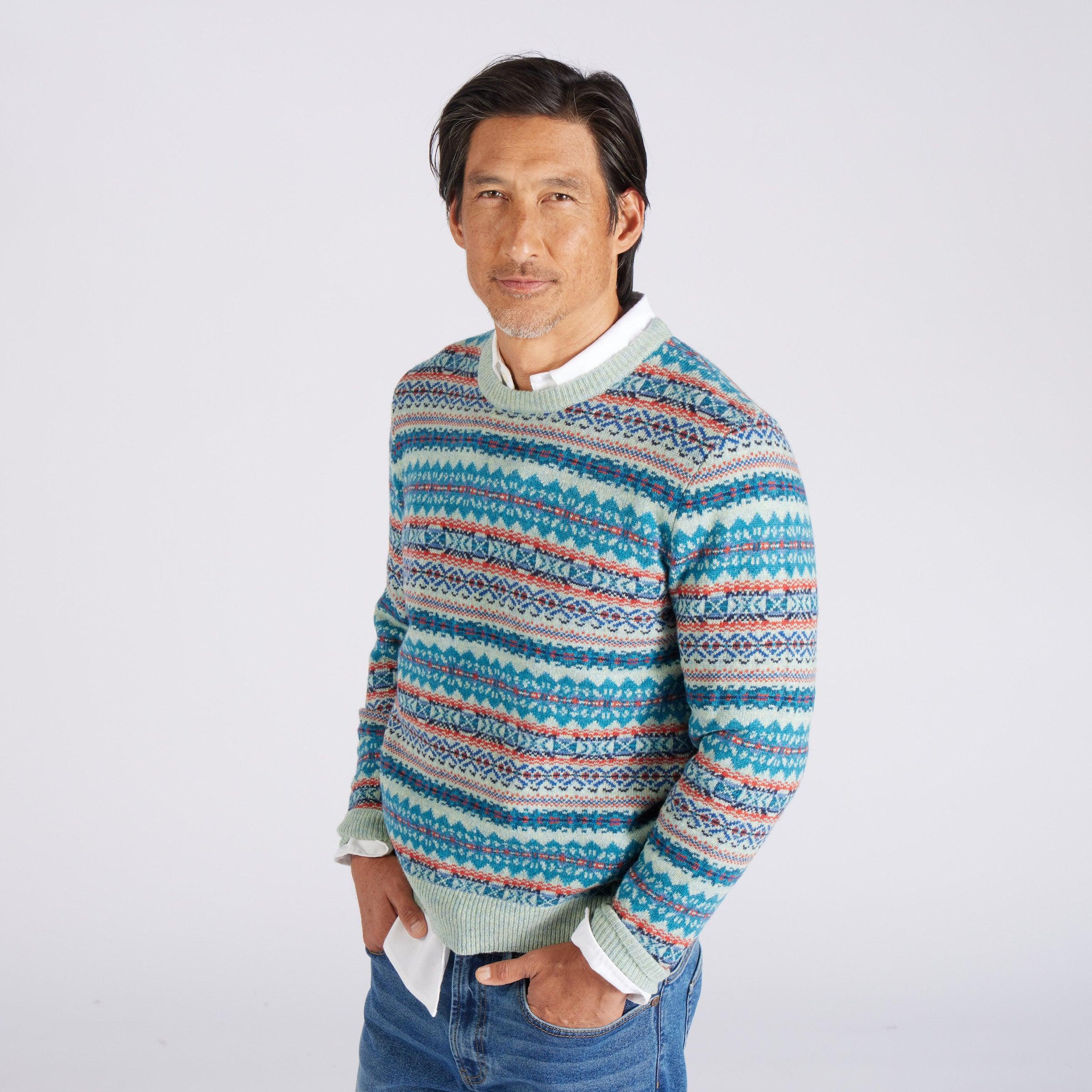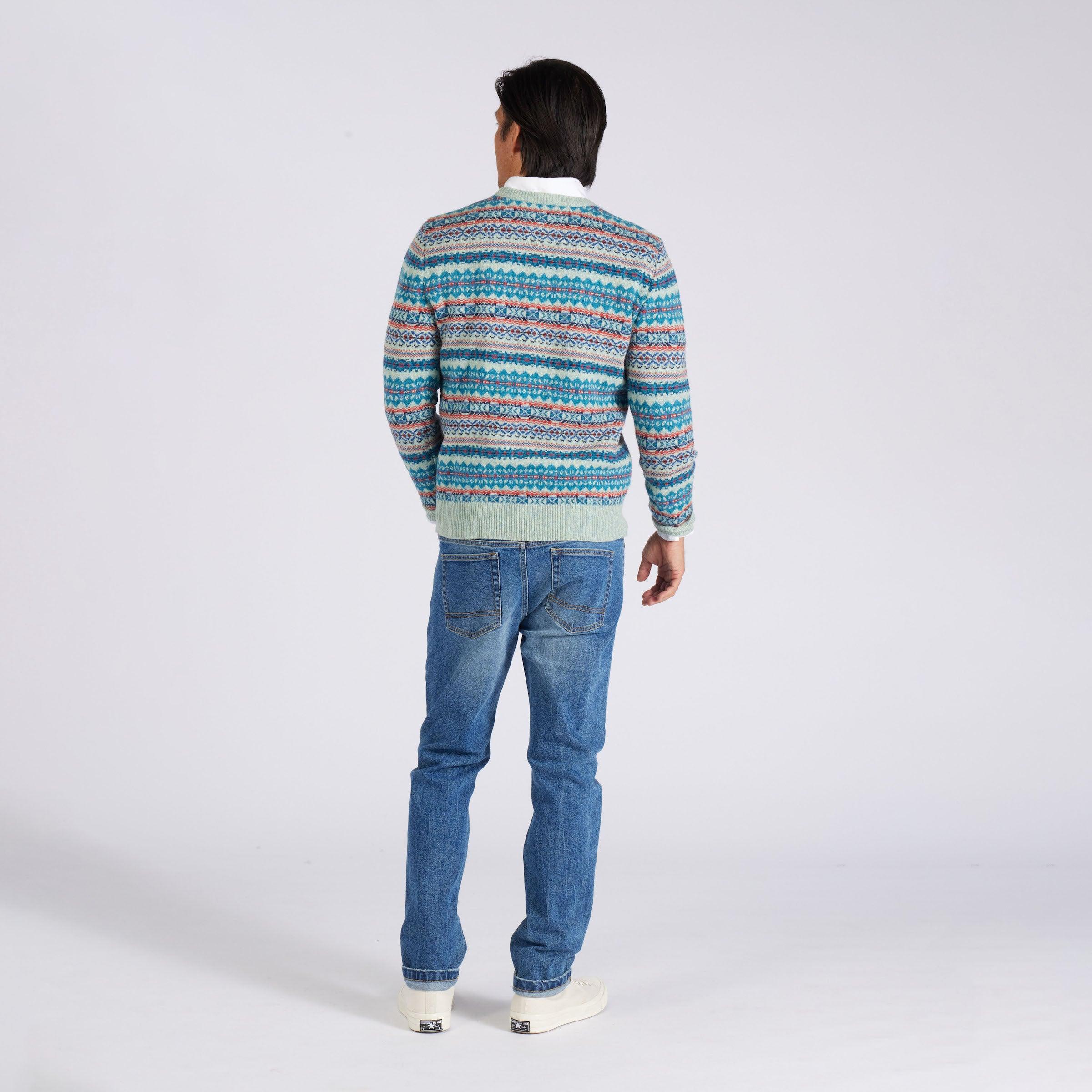 Everyone needs a surefire holiday sweater in their arsenal. This versatile exclusive comes in a Fair Isle pattern knit from the finest Donegal lambswool yarn. Knit with festive winter brights and dark tones in our original float jacquard pattern. The Model is also wearing: Eagle Creek Vintage Oxford - White and Edward Stretch Slim Fit Denim - Vintage Wash. Model: Adrian is wearing size medium and is 6'. ----Details---- 7 gauge jacquard stitch Crew neck Imported ----Materials---- 80% Lambswool 20% Nylon ----Size & Fit---- Measuring Method: All measurements are in inches and based on a “flat” garment, as shown below. For comparison with one of your existing garments, please lay garment on a flat surface and follow the key measurement points. For chest and neck, if you double the flat measurement, you will get close to the full body measurement. ----Care---- Hand wash cold with similar colors Do not soak before washing Do not bleach Remove promptly after wash Lay flat to dry Do not tumble dry Cool iron on reverse side if necessary Or Dry Clean
