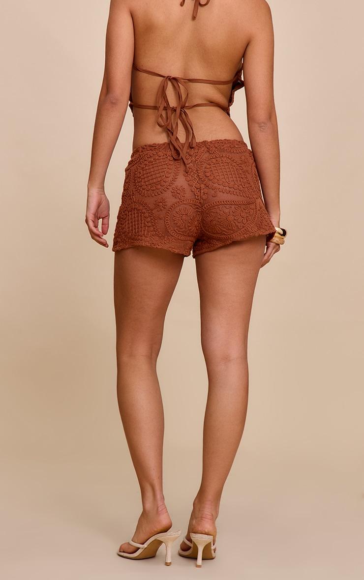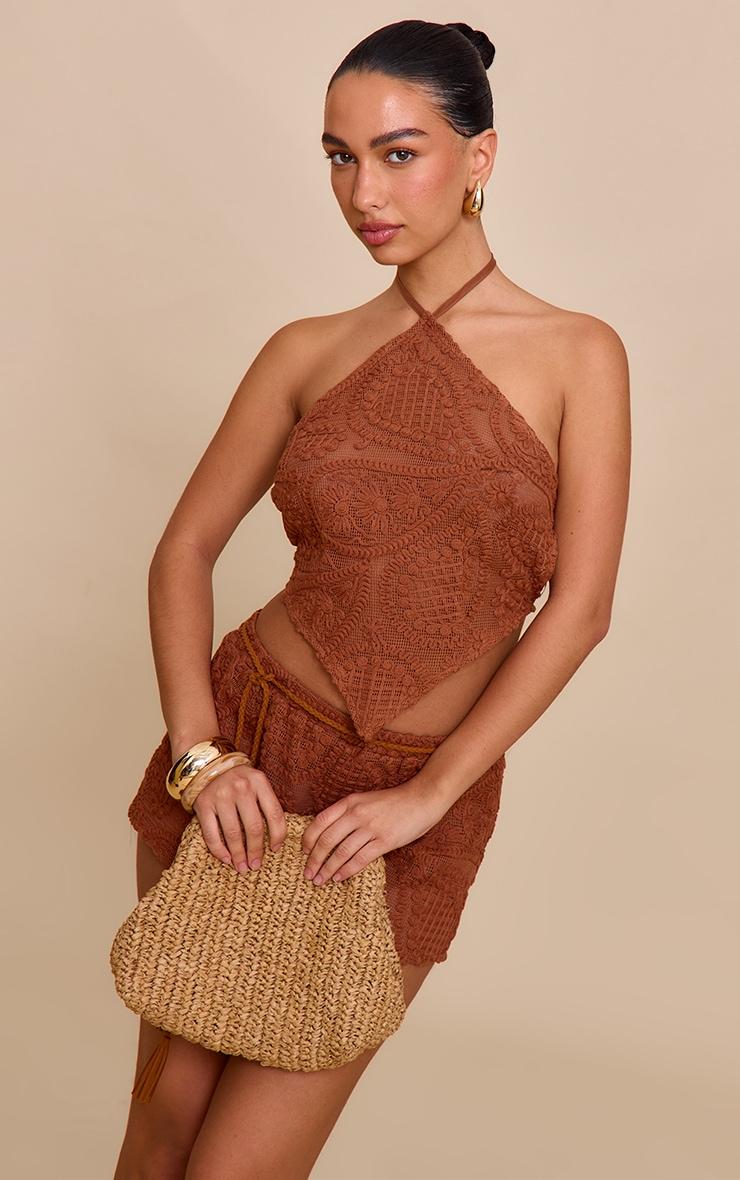 Sculpt your day look with statement detail. These burnt orange textured embroidered mid rise mini shorts feature a standout all-over texture and intricate embroidery. Shaped to a mid-rise fit with a clean mini hem, the unique texture adds structure, ensuring they hold their form. Team these directional shorts with the co-ordinating top for a complete vibe or a simple fitted tee for easy day dressing. Own the moment in artful texture.Length approx 33cm/13inch (Based on sample size US 4)Model wears size UK 8/ EU 36/ AUS 8/ US 4Model Height - 5ft 7inchp]:!mb-4inch>Brand: PrettyLittleThingCategory: Co-ordsProduct type: FloatyColor: Burnt OrangeMaterial: CrochetOccasion: Day